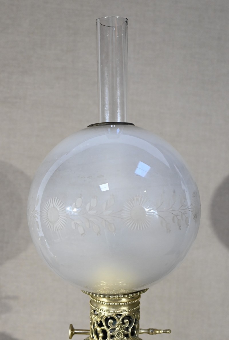 Cette lampe est chapeautée d’un globe en verre sablé, à décors de frise de tournesols, tenu par une cheminée en verre authentique.