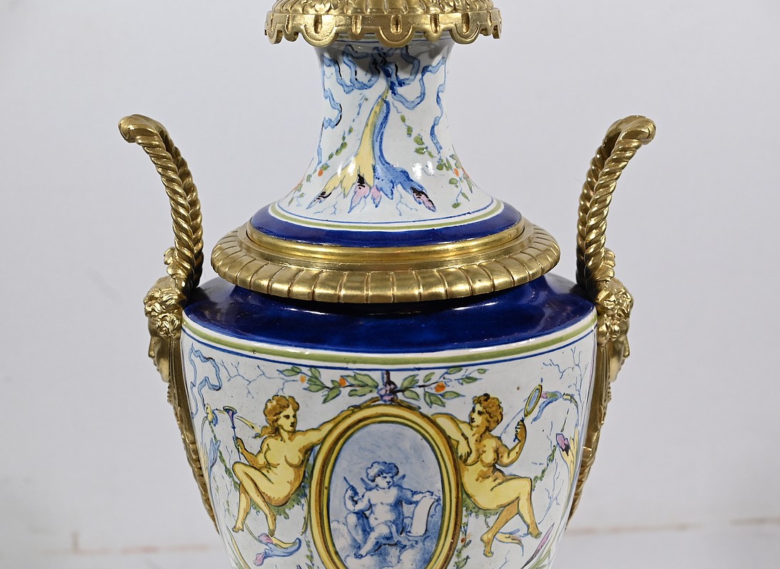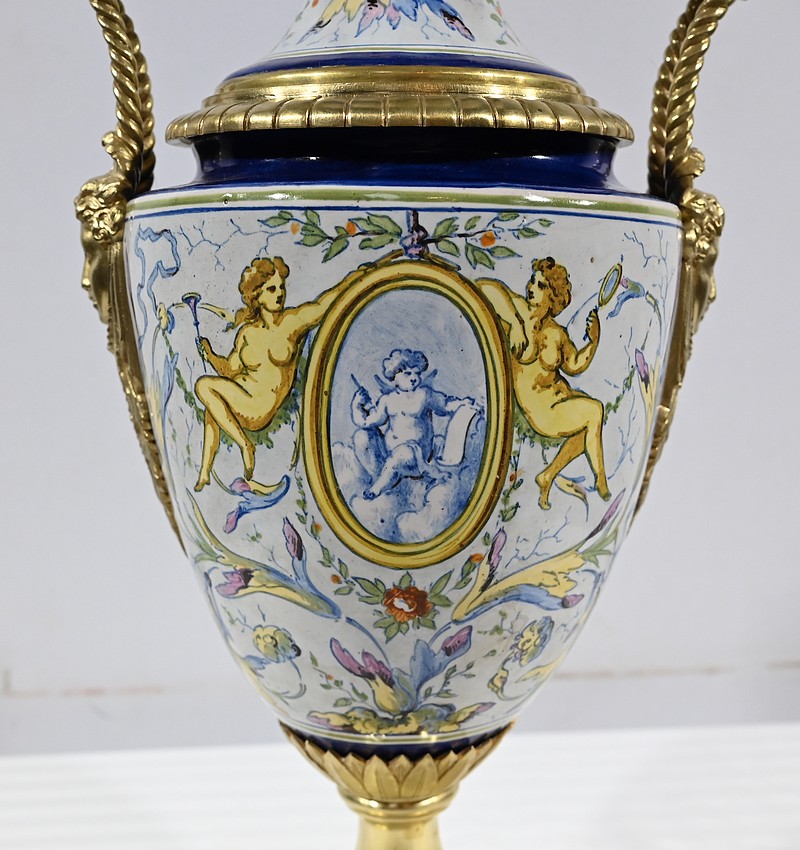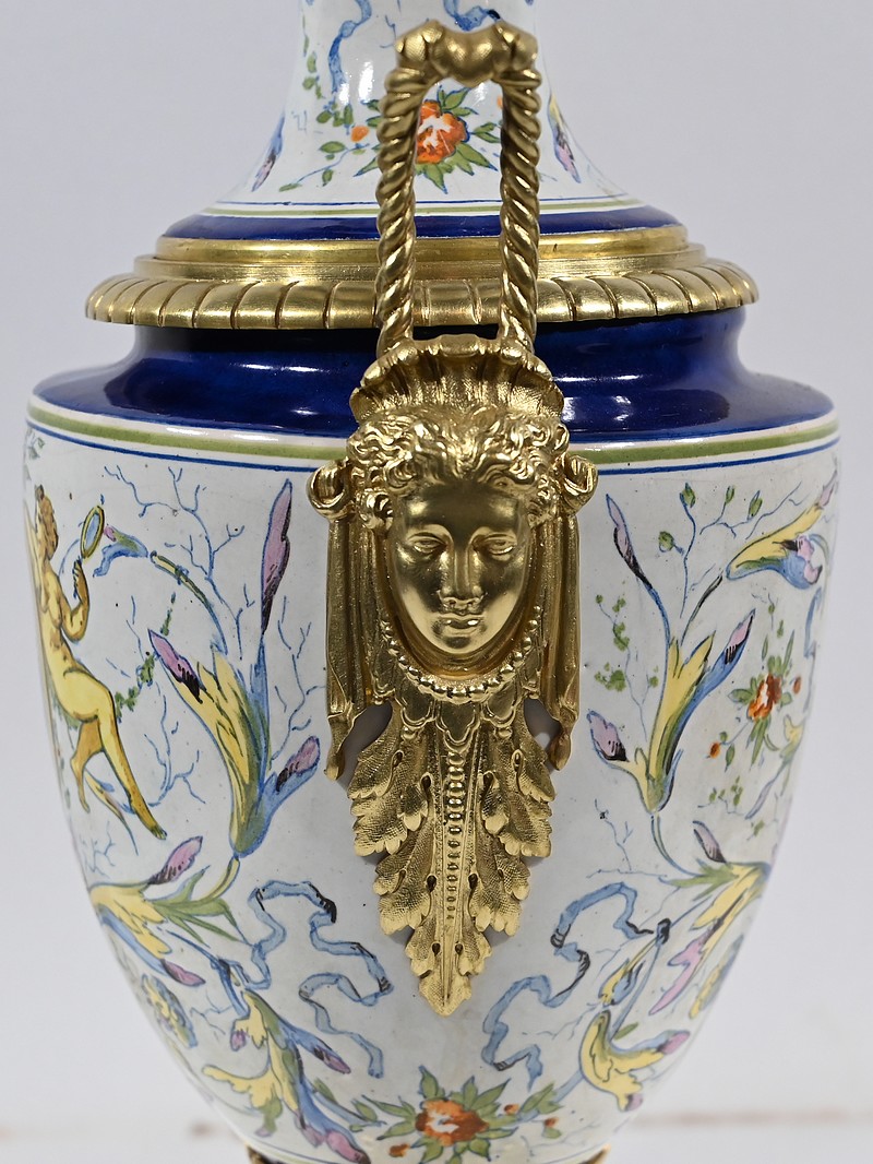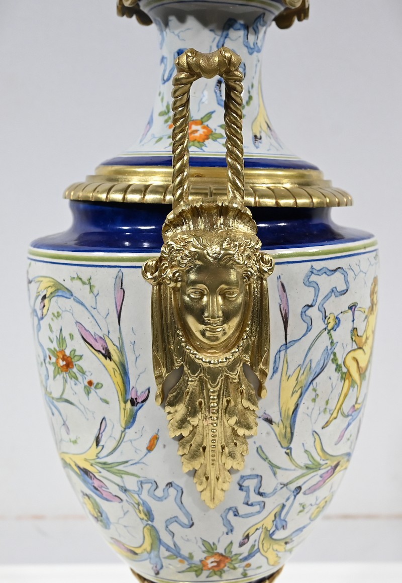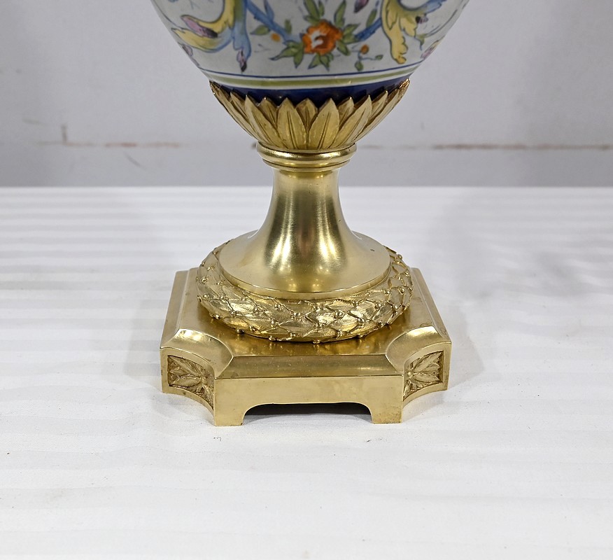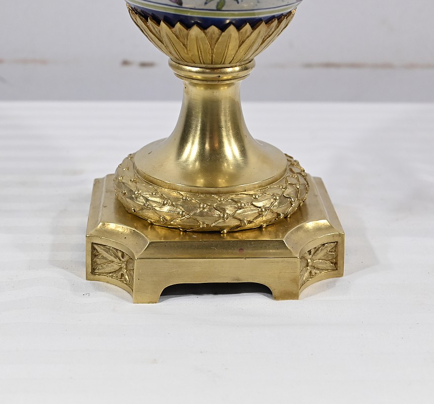 Une large collerette en bronze sculpté de feuilles compose le col de ce luminaire. Le corps formant un vase est peint de fleurs multicolores et est orné de médaillons centraux. De chaque côté, des anses accolées en bronze représentent des visages féminins coiffés de palmettes.