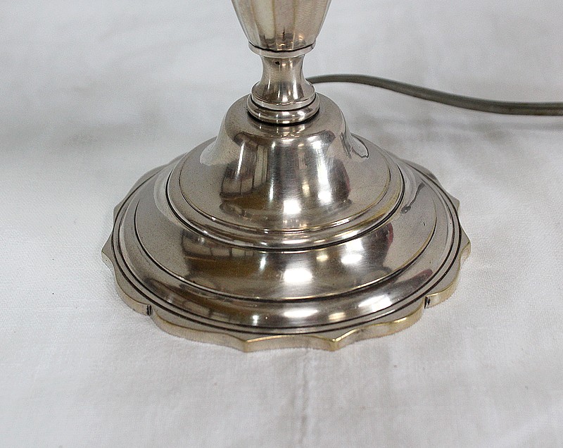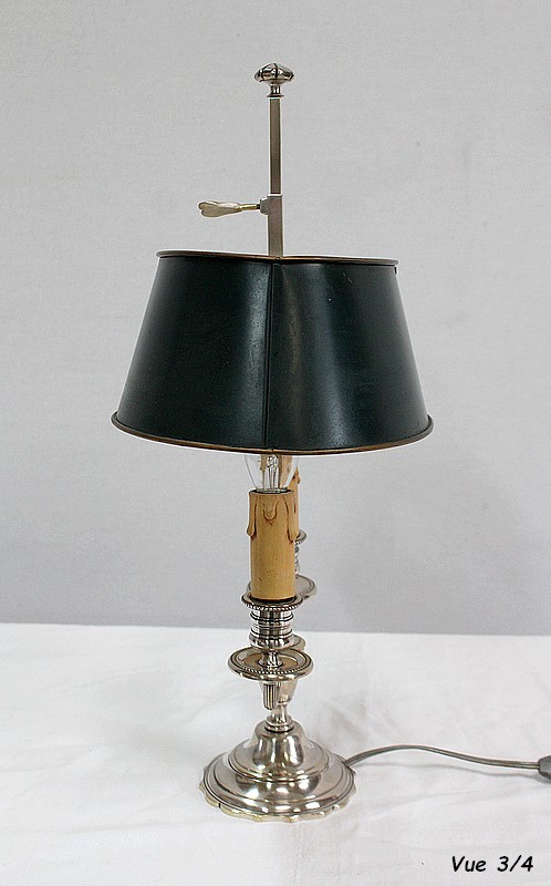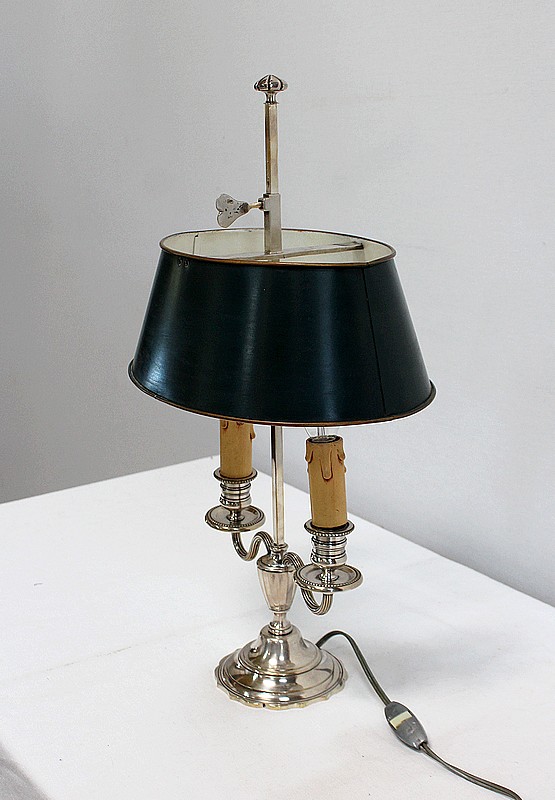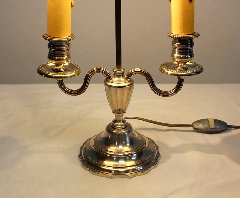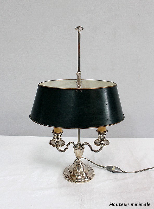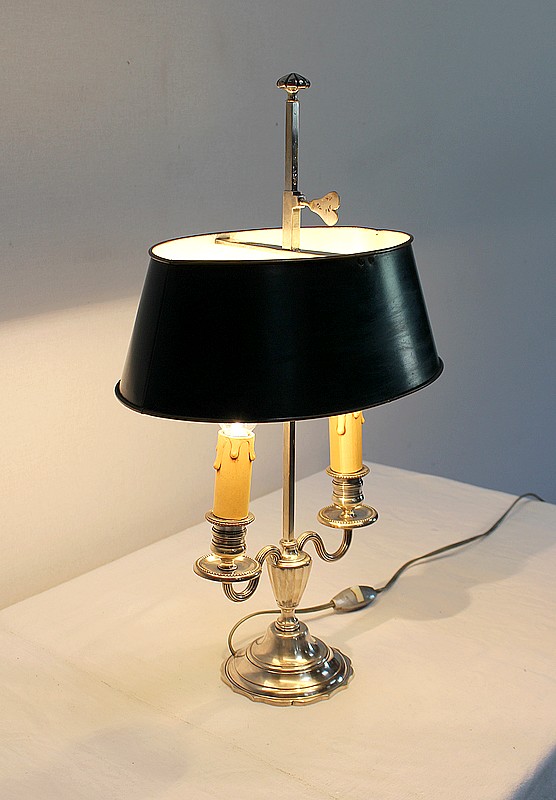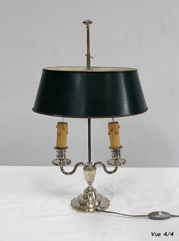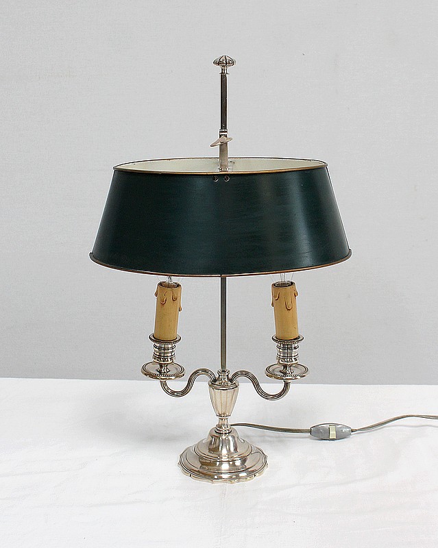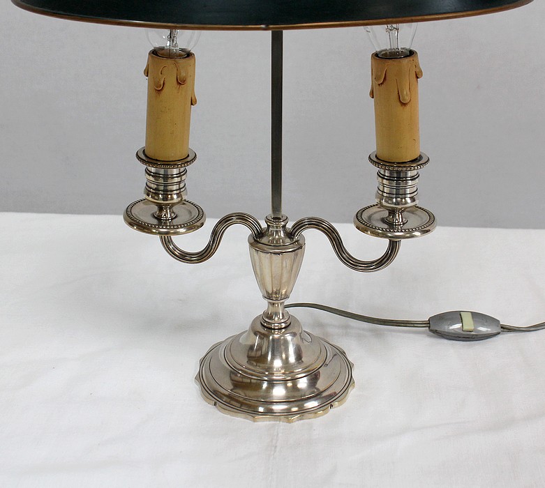 Lampe bouillotte en métal argenté coiffée d’un abat-jour métallique, ovalisé, de couleur vert empire.