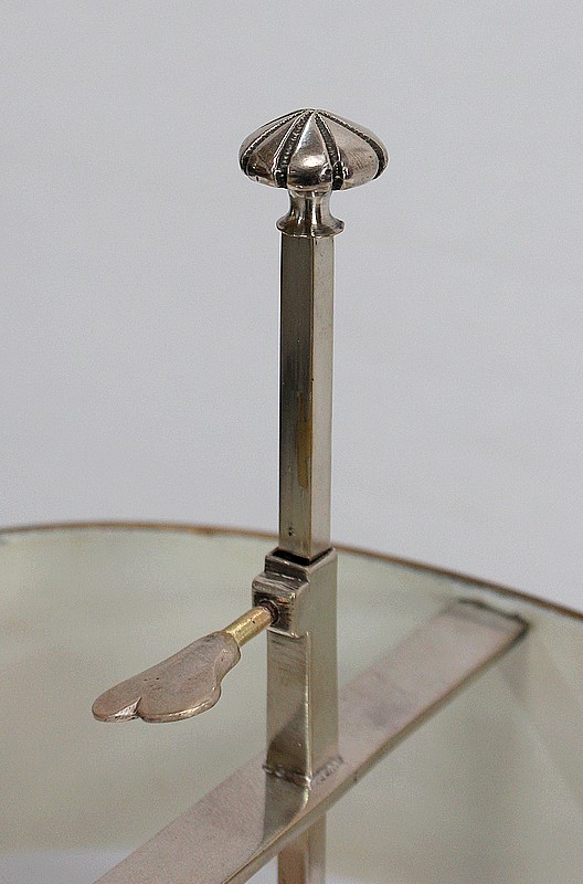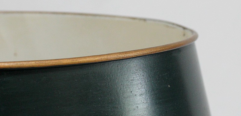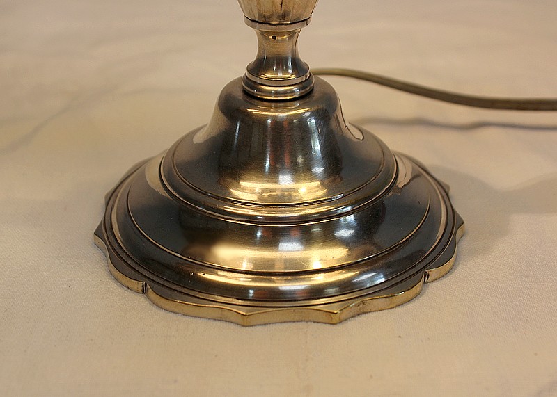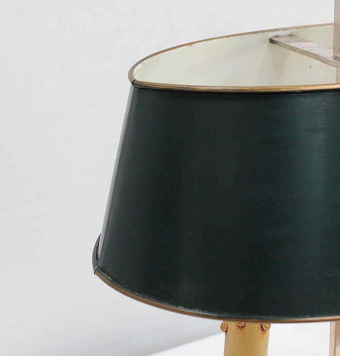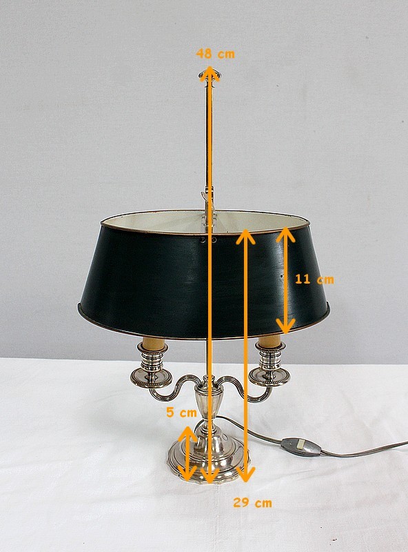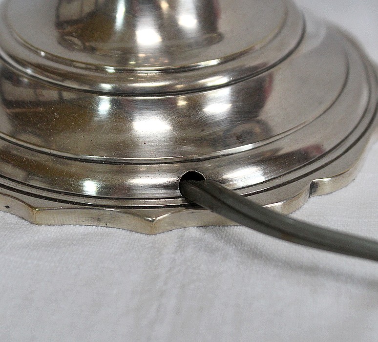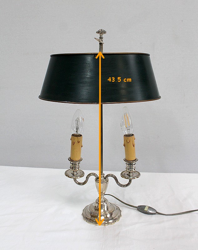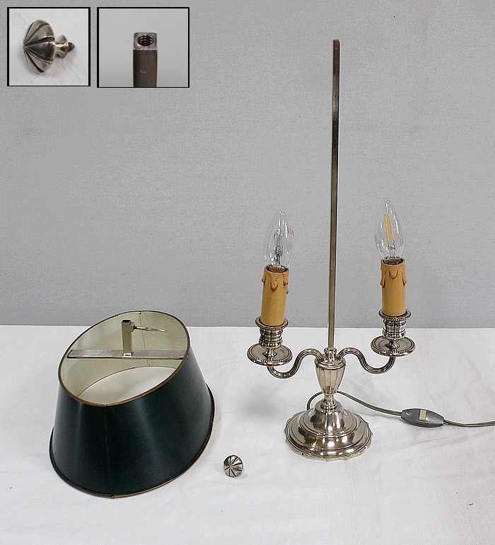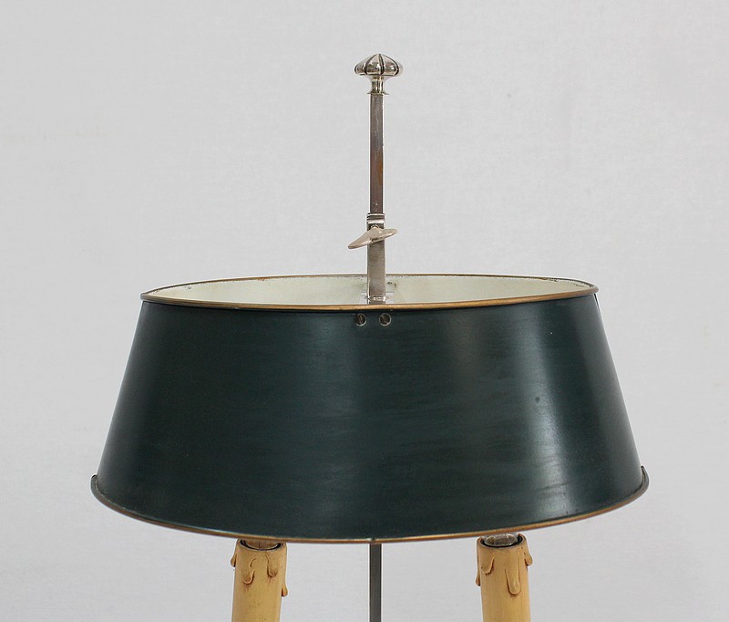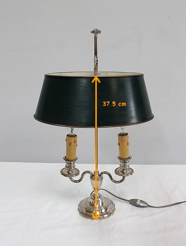 Lampe bouillotte en métal argenté coiffée d’un abat-jour métallique, ovalisé, de couleur vert empire.