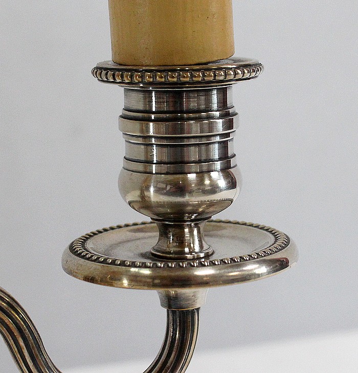 Le fût central déploie deux bras de lumières, décorés de perlés et le socle bénéficie de subtiles moulures.