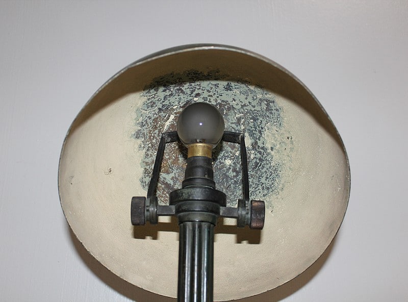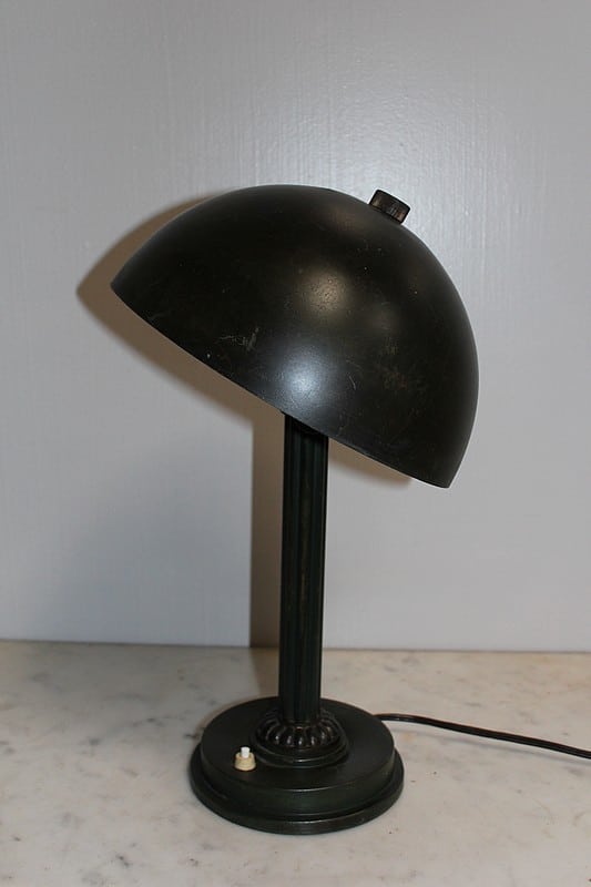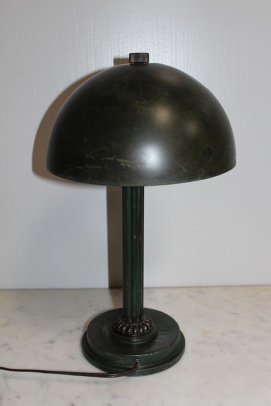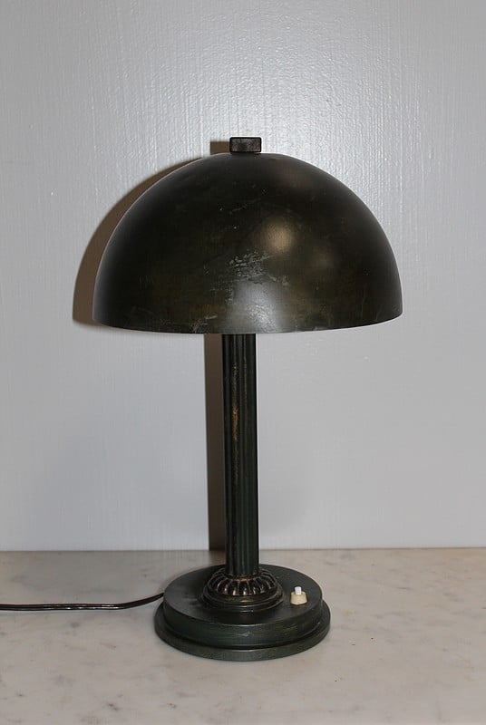 Lampe de bureau ‘cloche’ orientable en tôle peinte de couleur vert foncé.