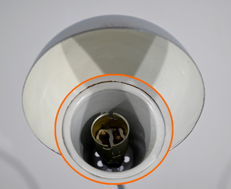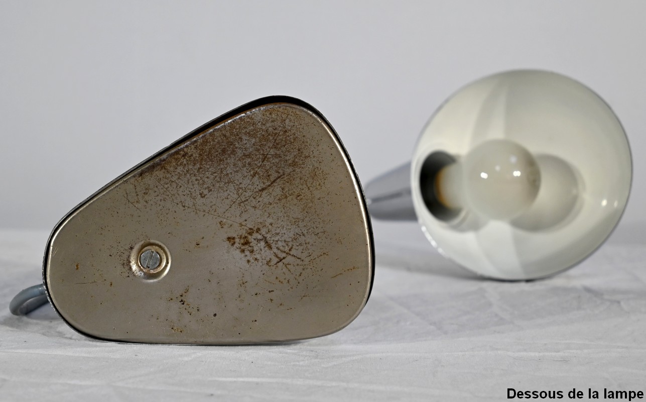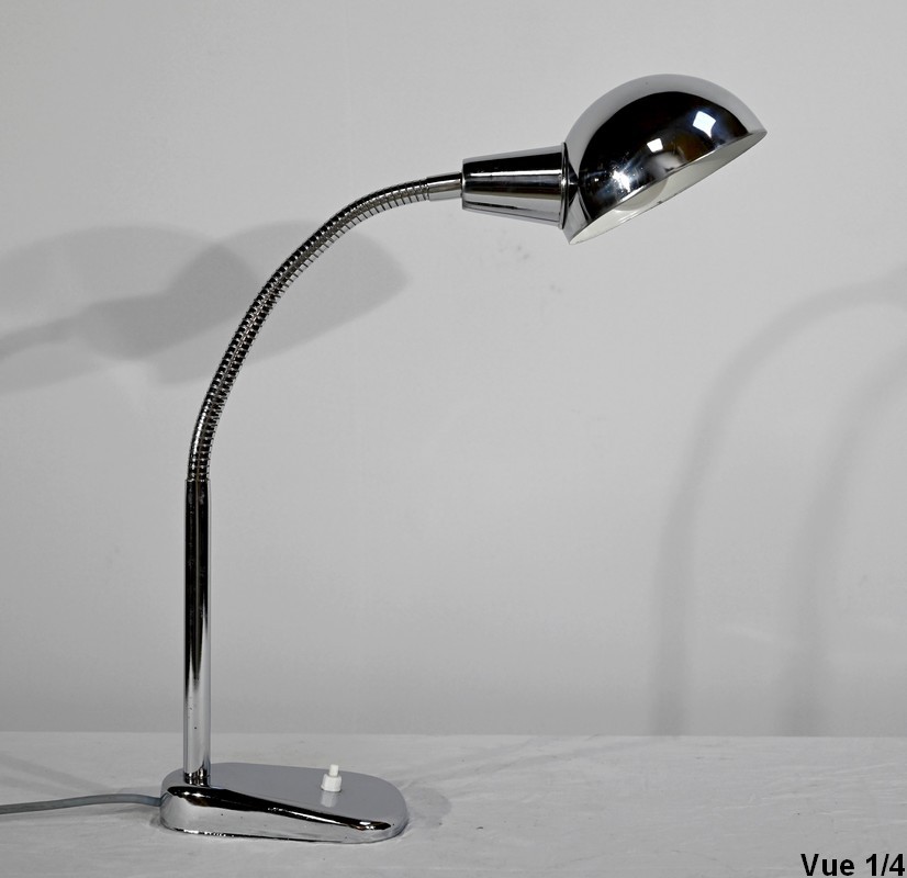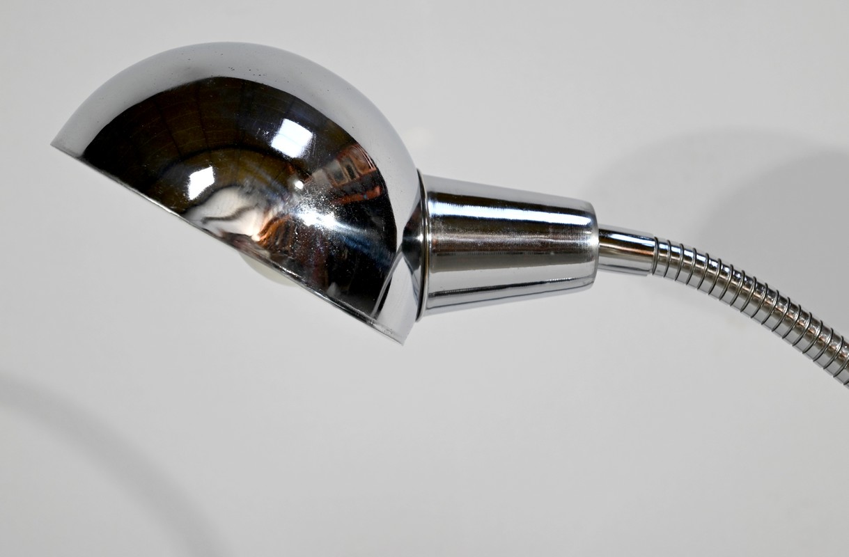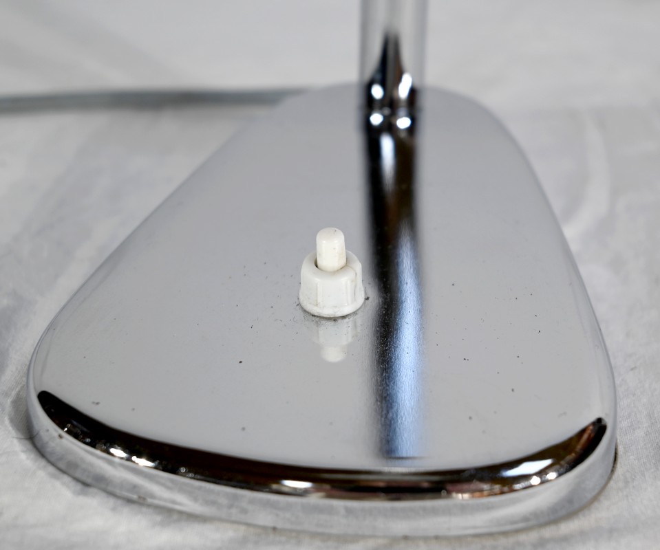 Lampe de bureau industriel en métal chromé. Elle présente un bras articulé et flexible. Le socle est muni d’un interrupteur unipolaire à bouton-poussoir de couleur blanche. L’abat-jour, de forme ronde, comporte un revêtement intérieur blanc afin de favoriser la diffusion de la lumière.