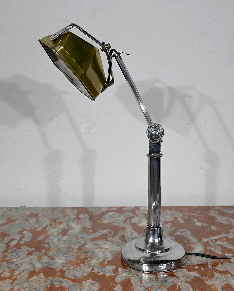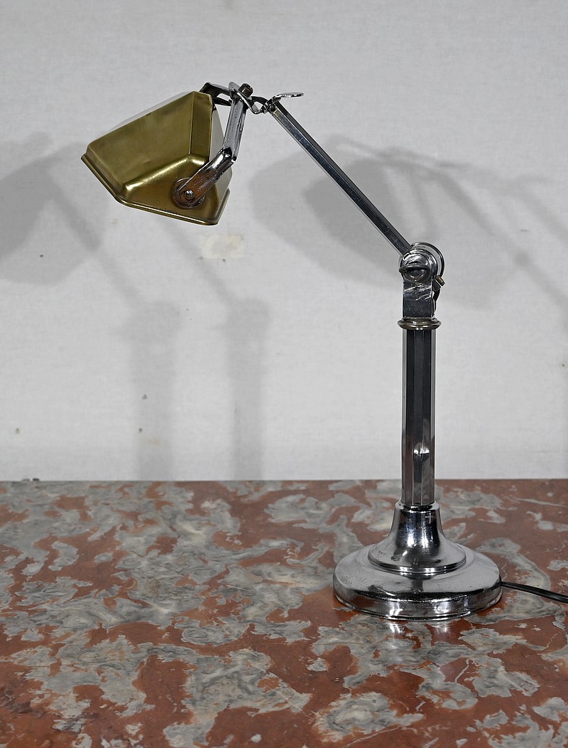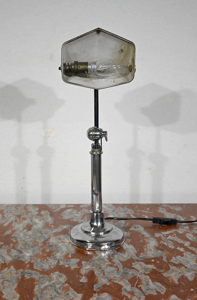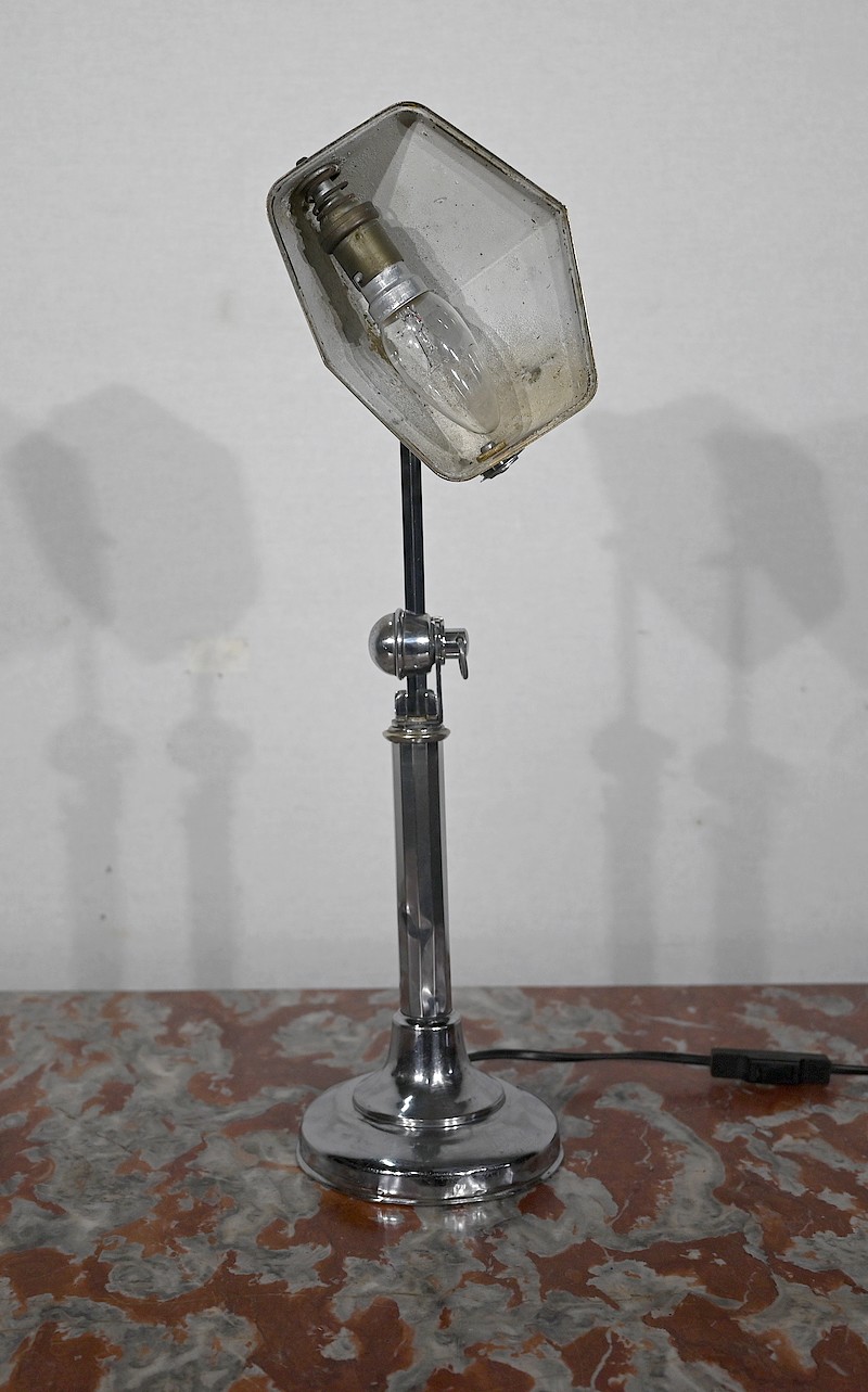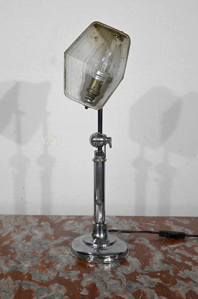 Il s’agit d’une lampe électrique portative à lumière orientable en tous sens et à hauteur de feu réglable. Une de ses caractéristiques est son abat-jour à facettes, de forme typiquement art déco, ainsi que l’articulation qui permet de rétracter son bras dans la colonne, révolution pour l’époque.