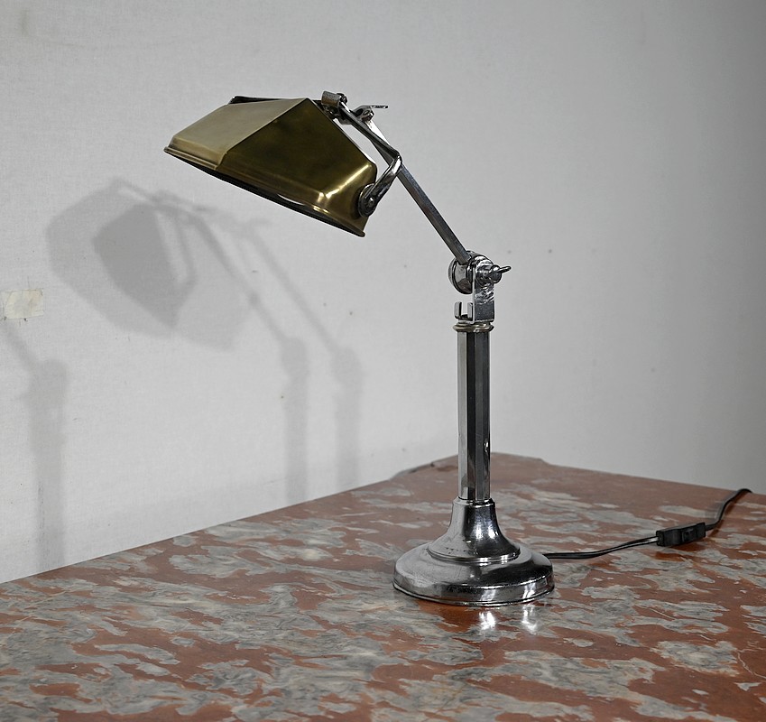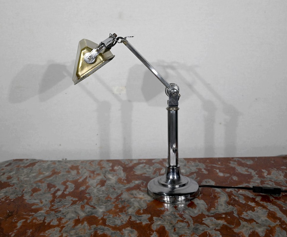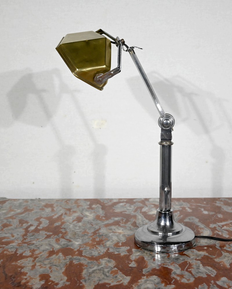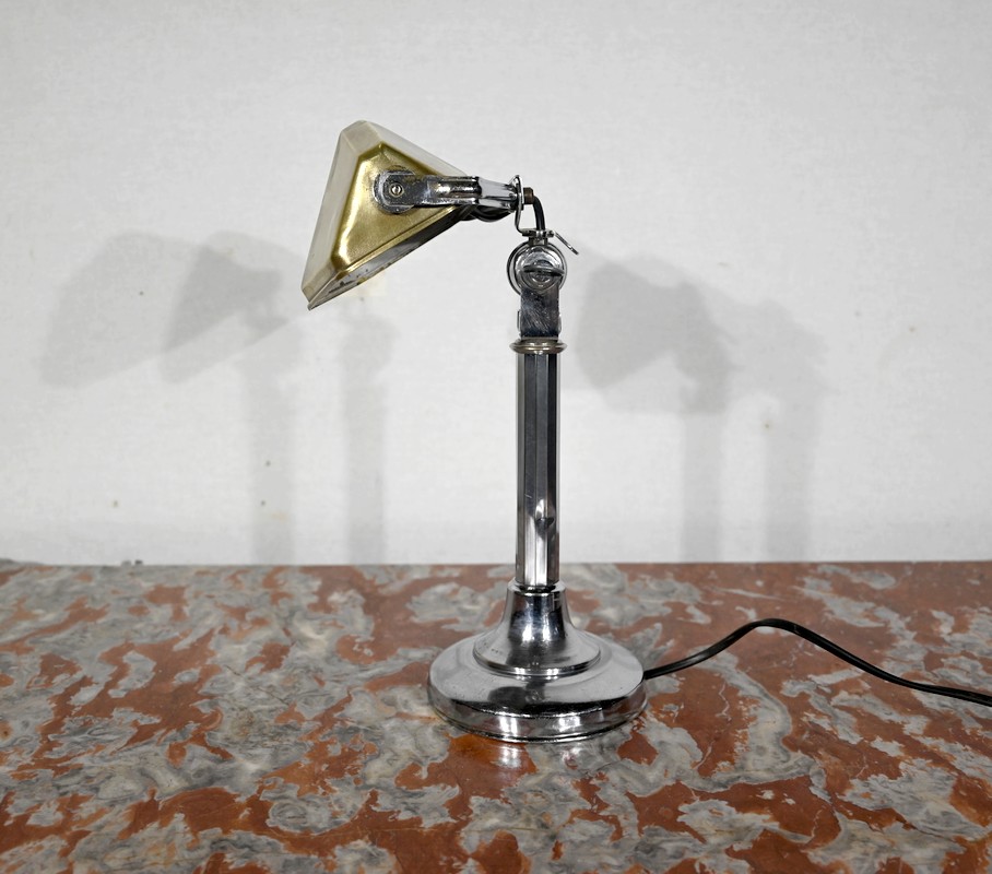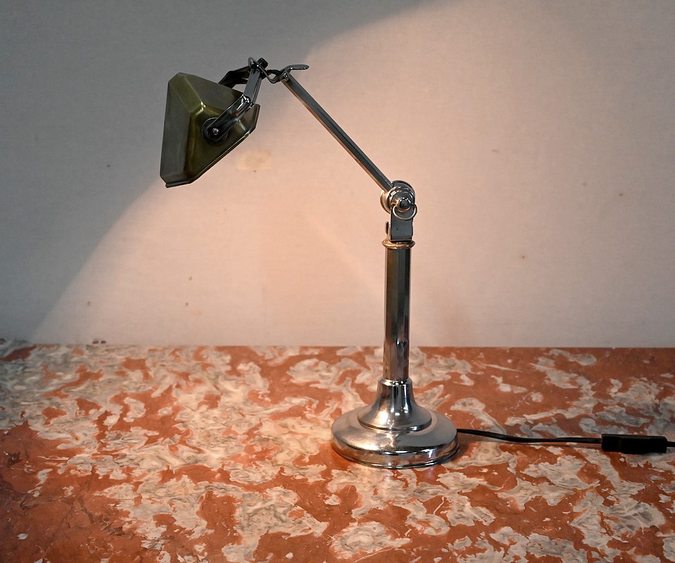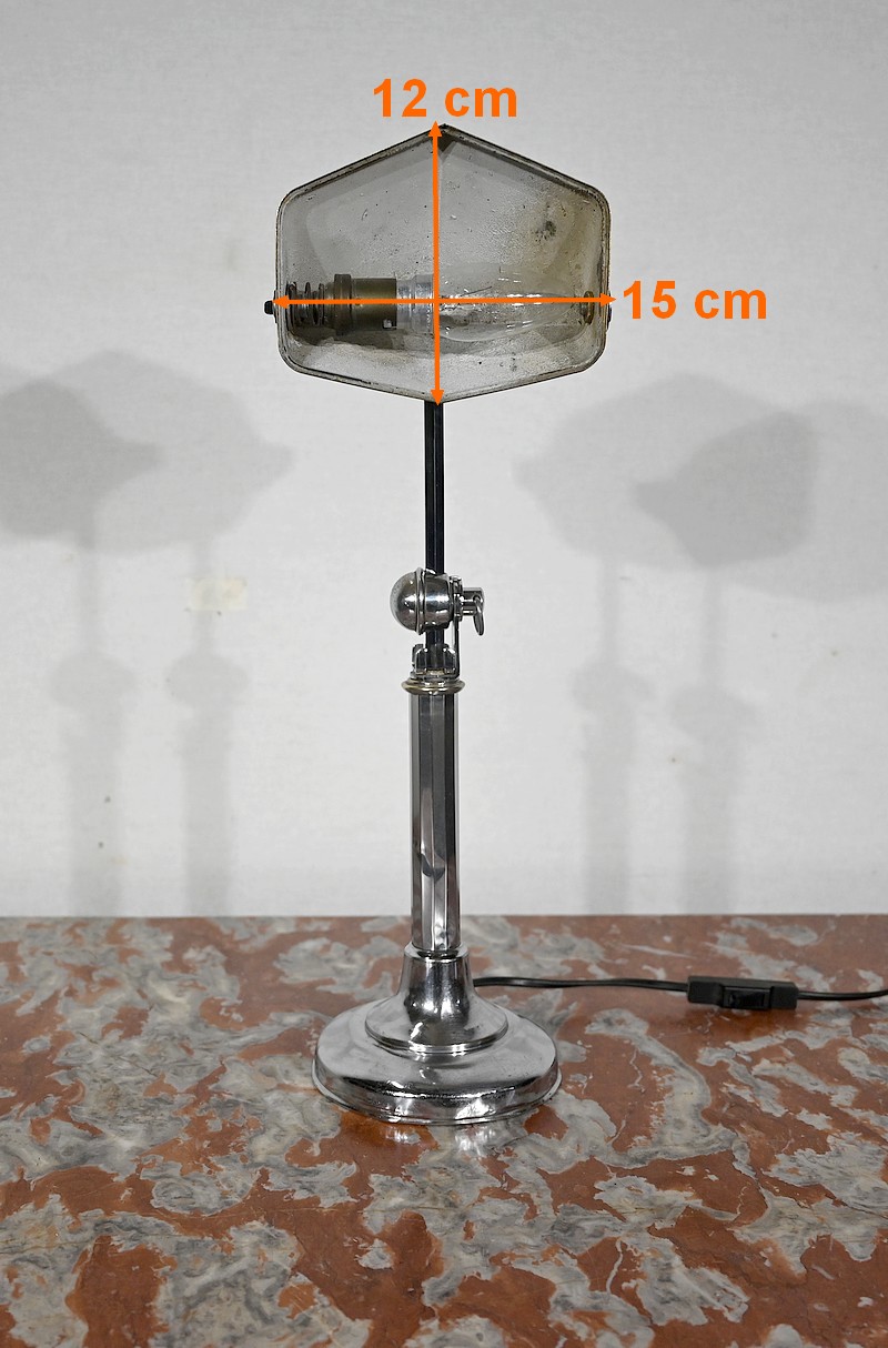 Il s’agit d’une lampe électrique portative à lumière orientable en tous sens et à hauteur de feu réglable. Une de ses caractéristiques est son abat-jour à facettes, de forme typiquement art déco, ainsi que l’articulation qui permet de rétracter son bras dans la colonne, révolution pour l’époque.