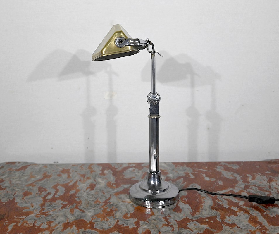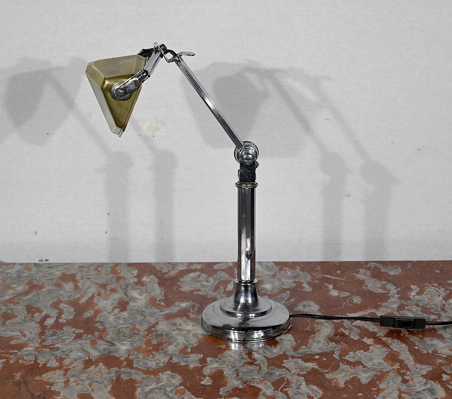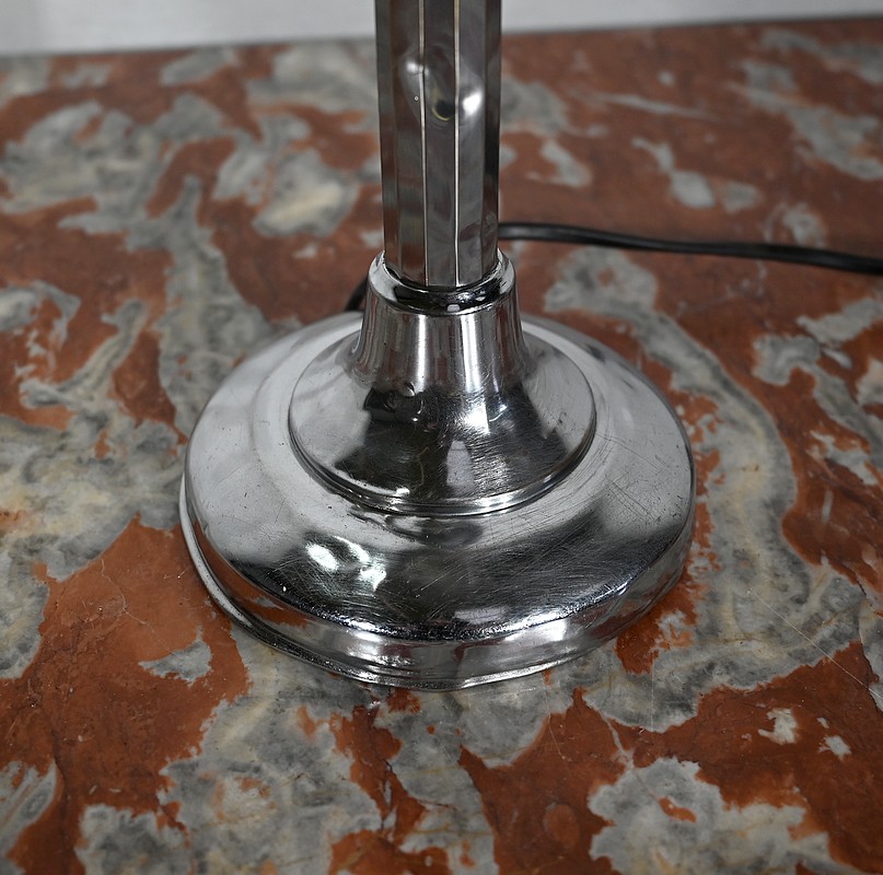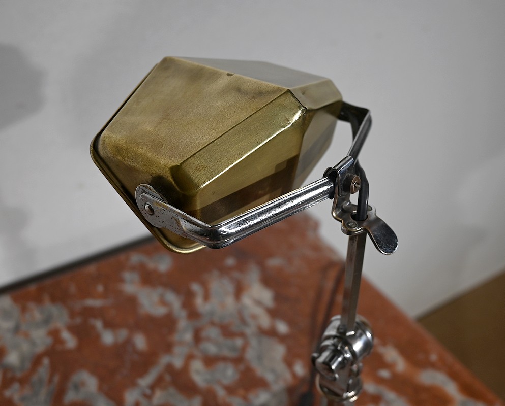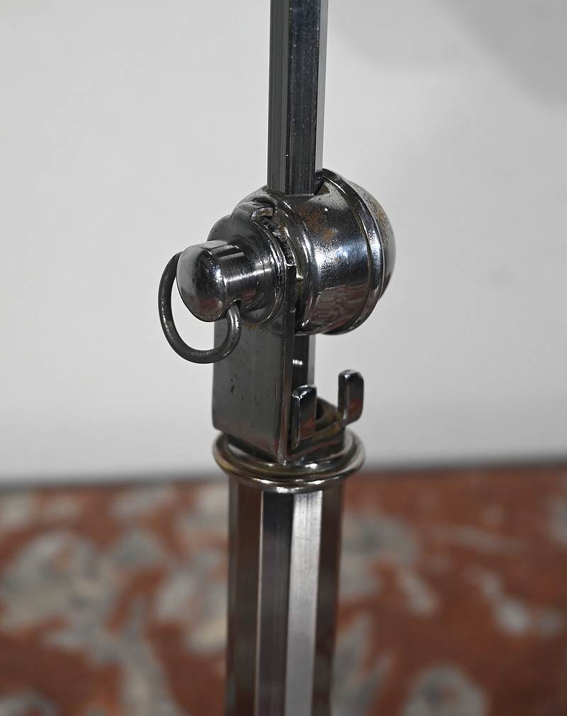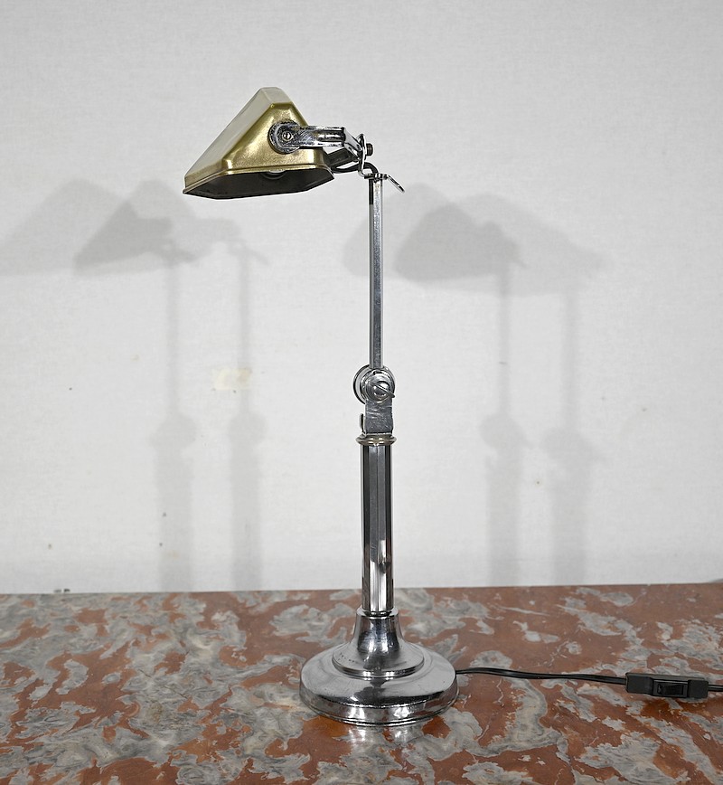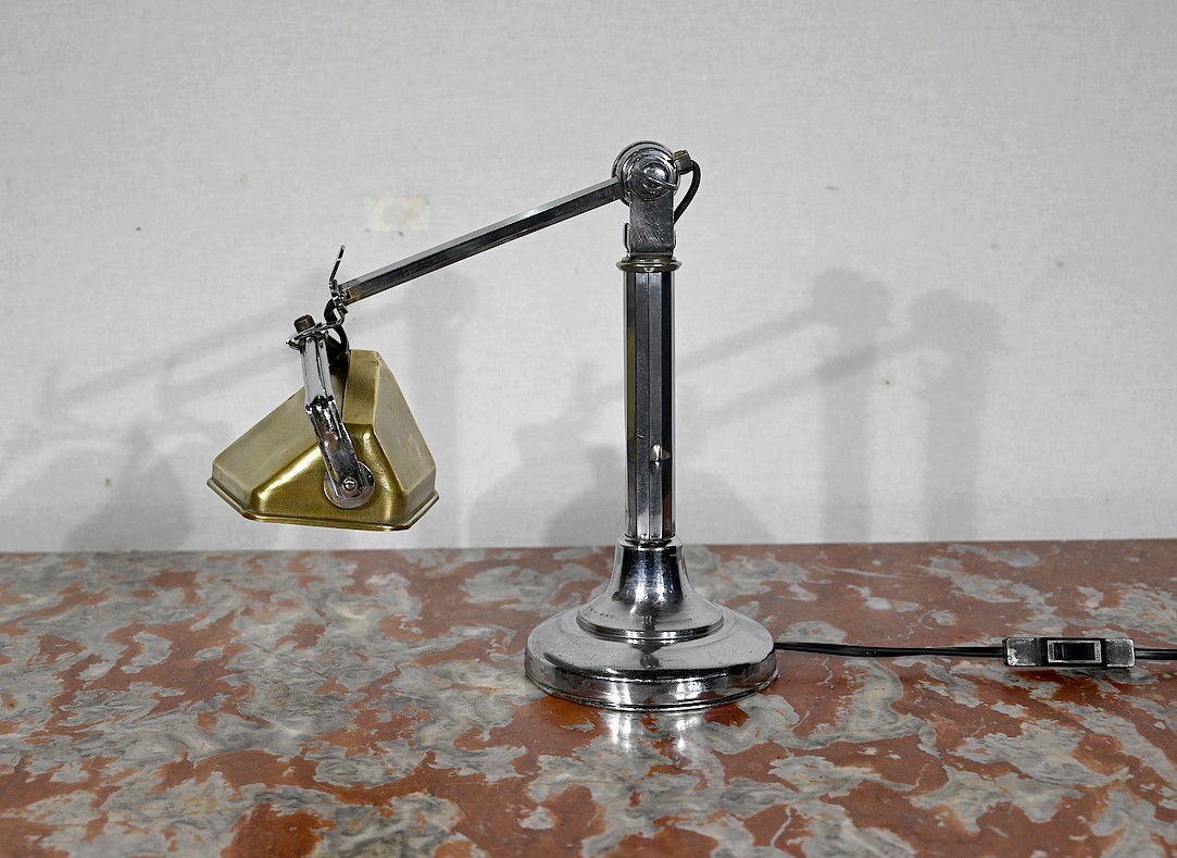 Il s’agit d’une lampe électrique portative à lumière orientable en tous sens et à hauteur de feu réglable. Une de ses caractéristiques est son abat-jour à facettes, de forme typiquement art déco, ainsi que l’articulation qui permet de rétracter son bras dans la colonne, révolution pour l’époque.