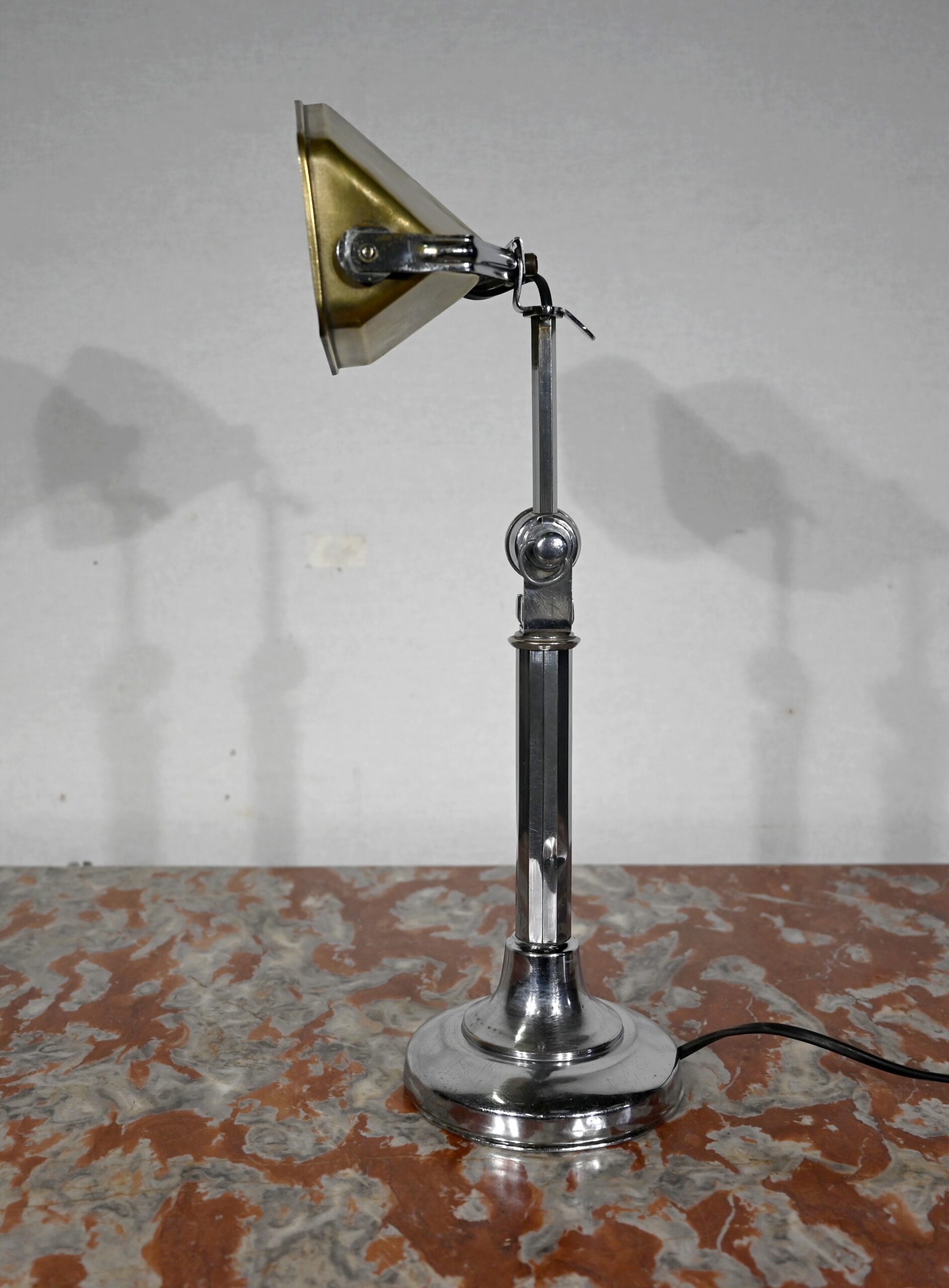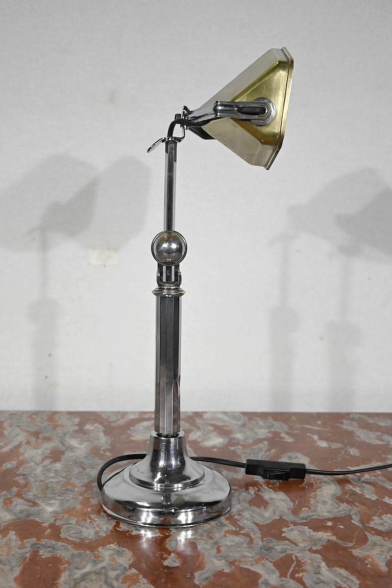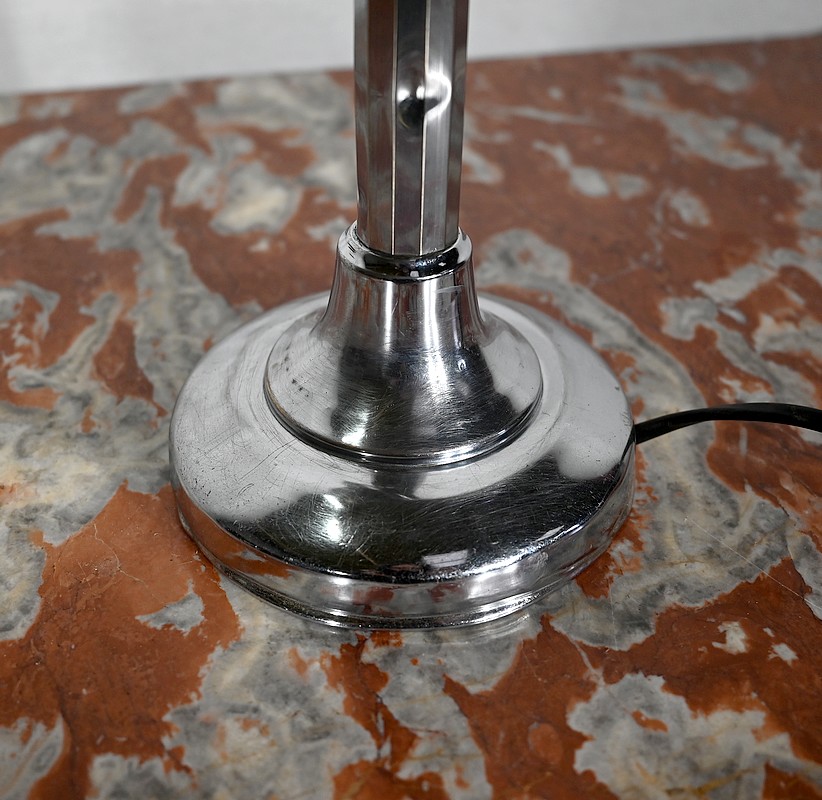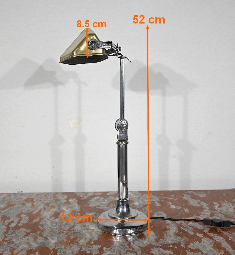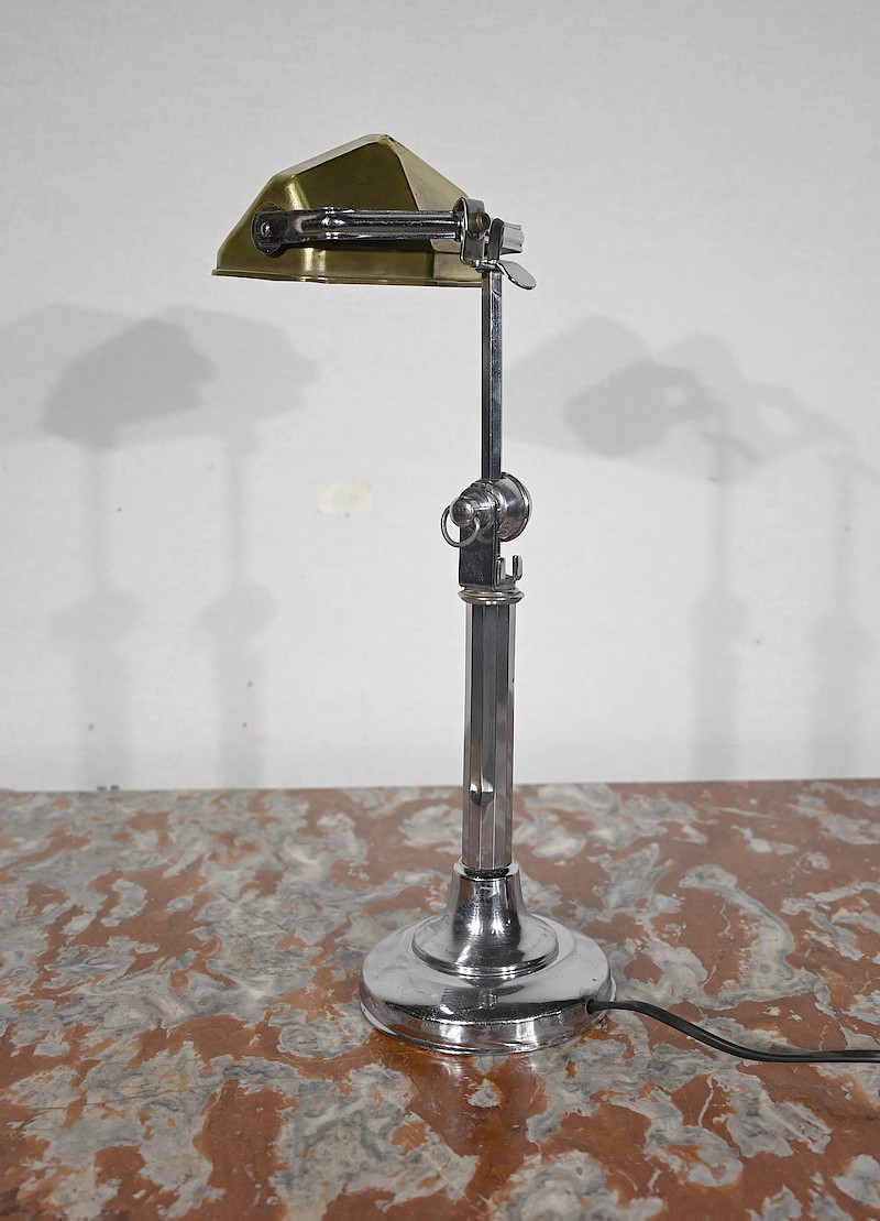 Il s’agit d’une lampe électrique portative à lumière orientable en tous sens et à hauteur de feu réglable. Une de ses caractéristiques est son abat-jour à facettes, de forme typiquement art déco, ainsi que l’articulation qui permet de rétracter son bras dans la colonne, révolution pour l’époque.
