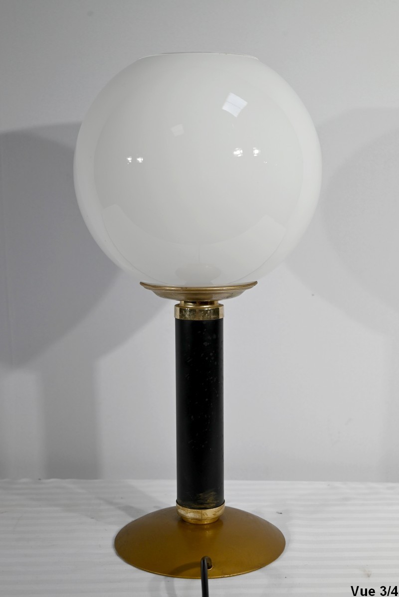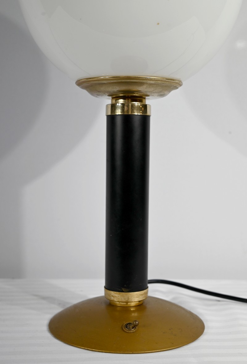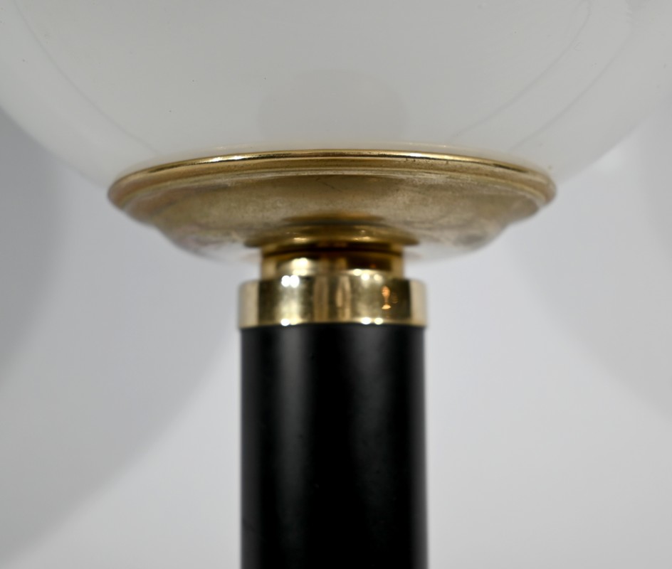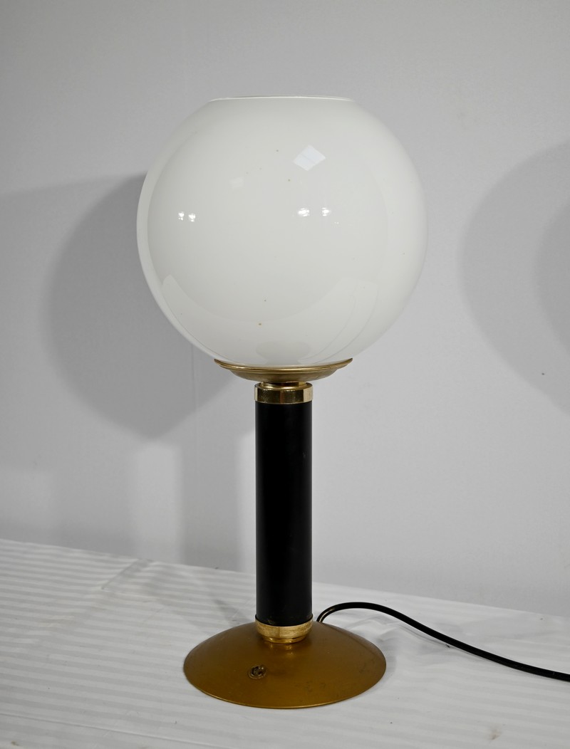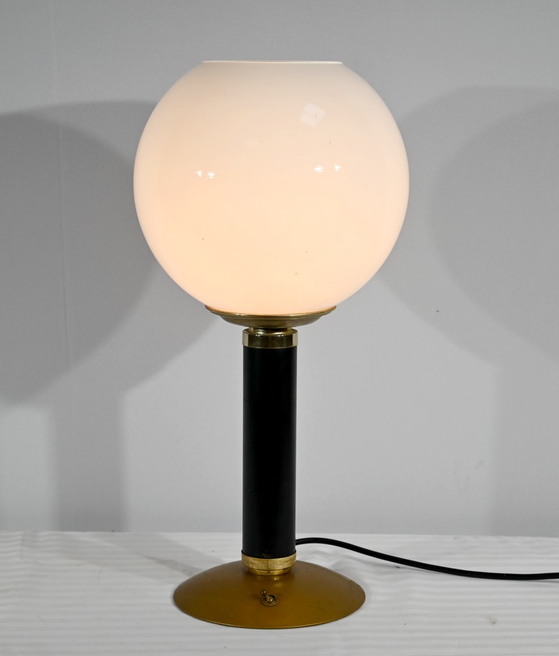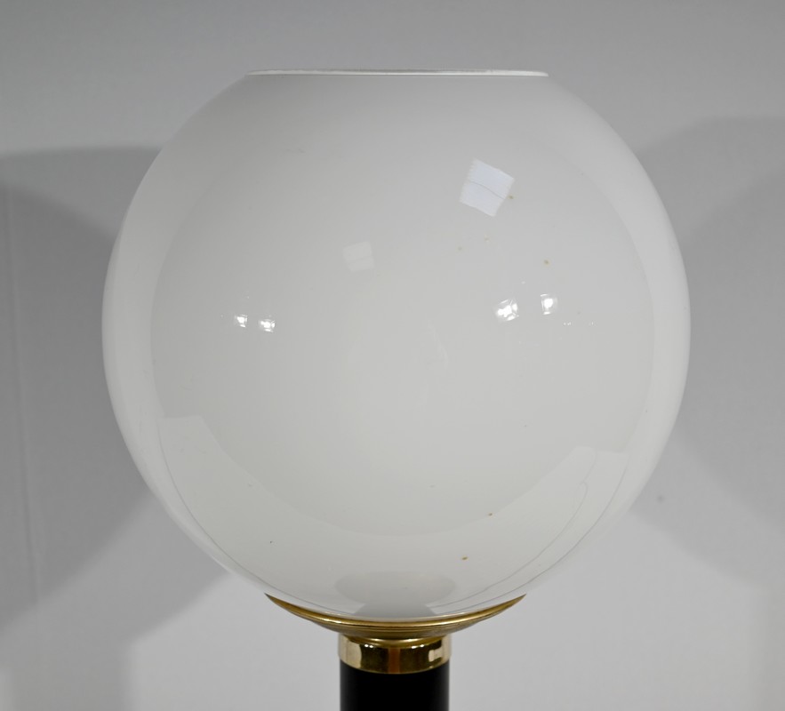 Cette lampe est sommée d’un important globe en verre opale souligné par une collerette en laiton.