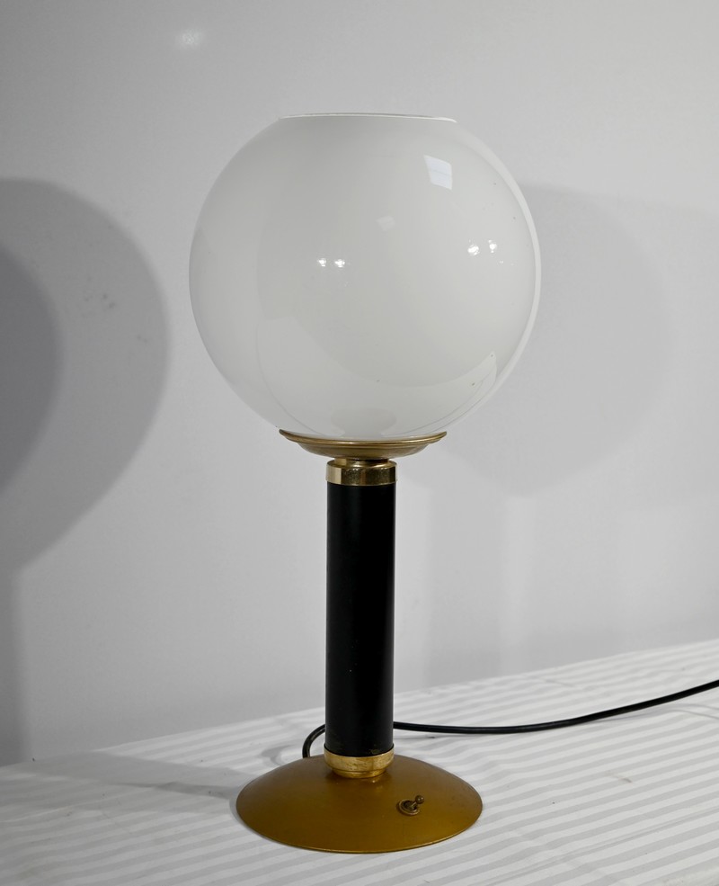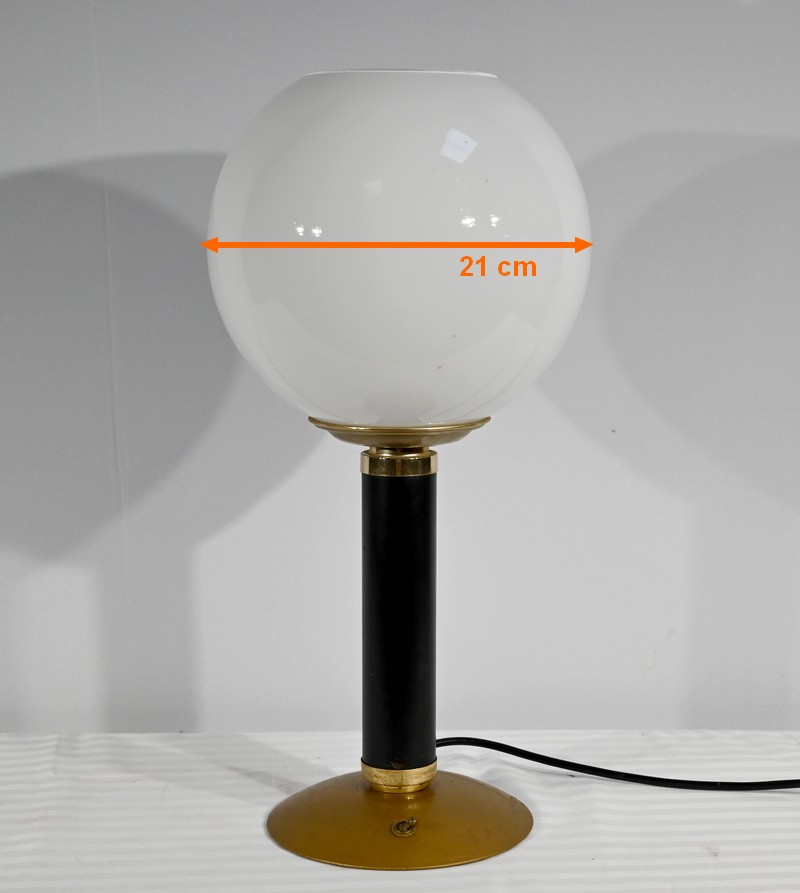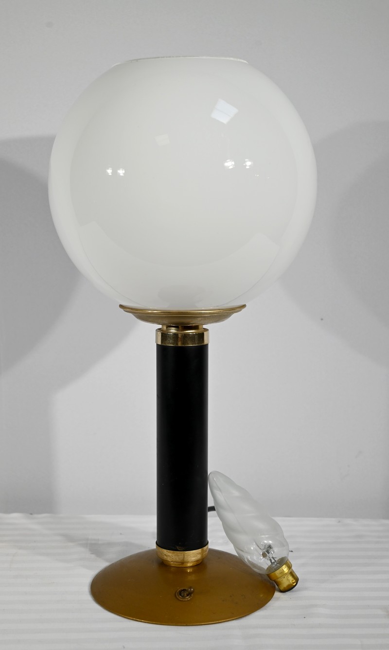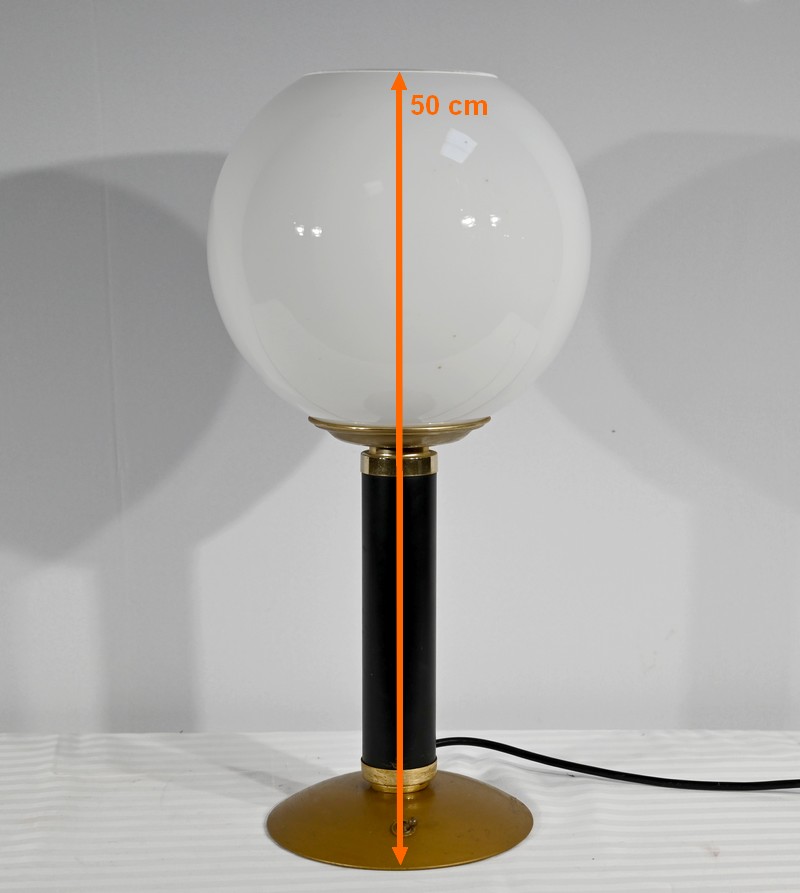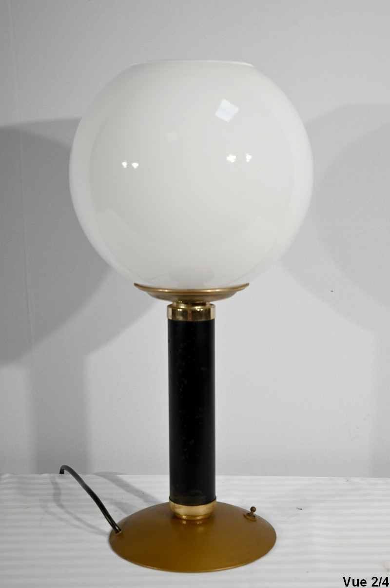 Cette lampe est sommée d’un important globe en verre opale souligné par une collerette en laiton.