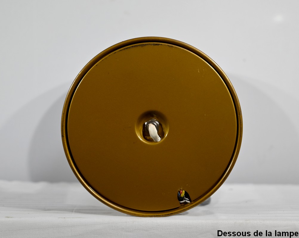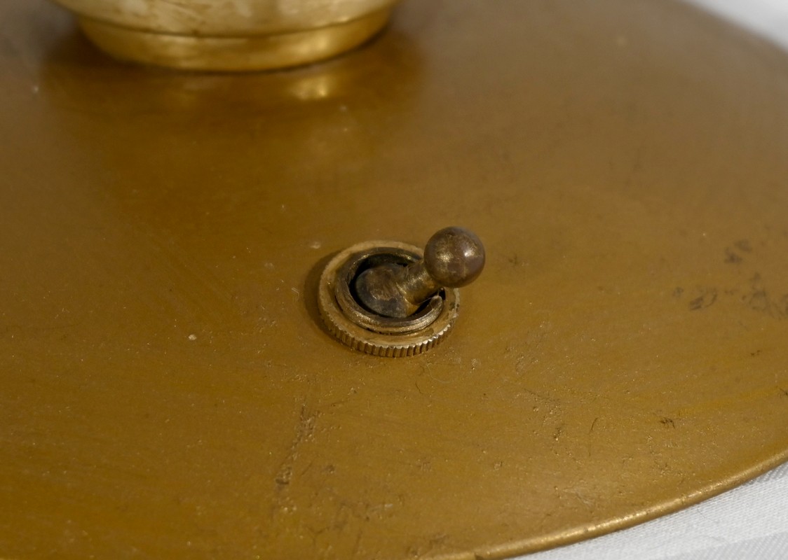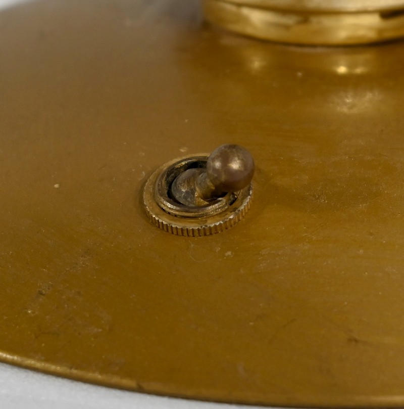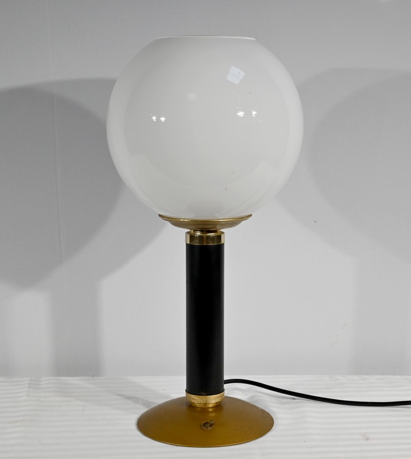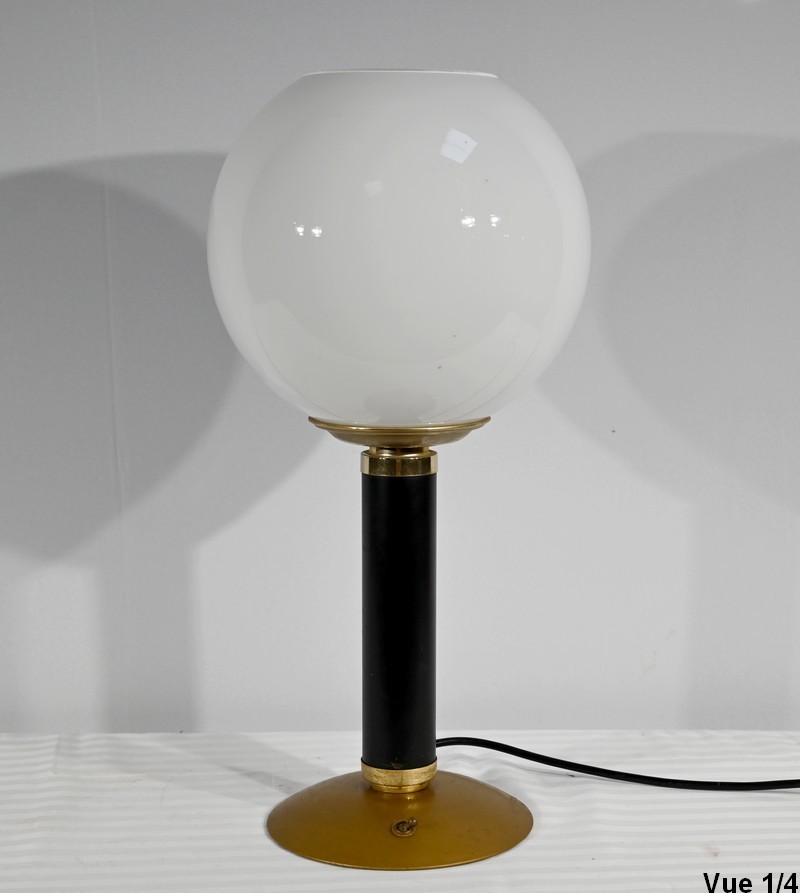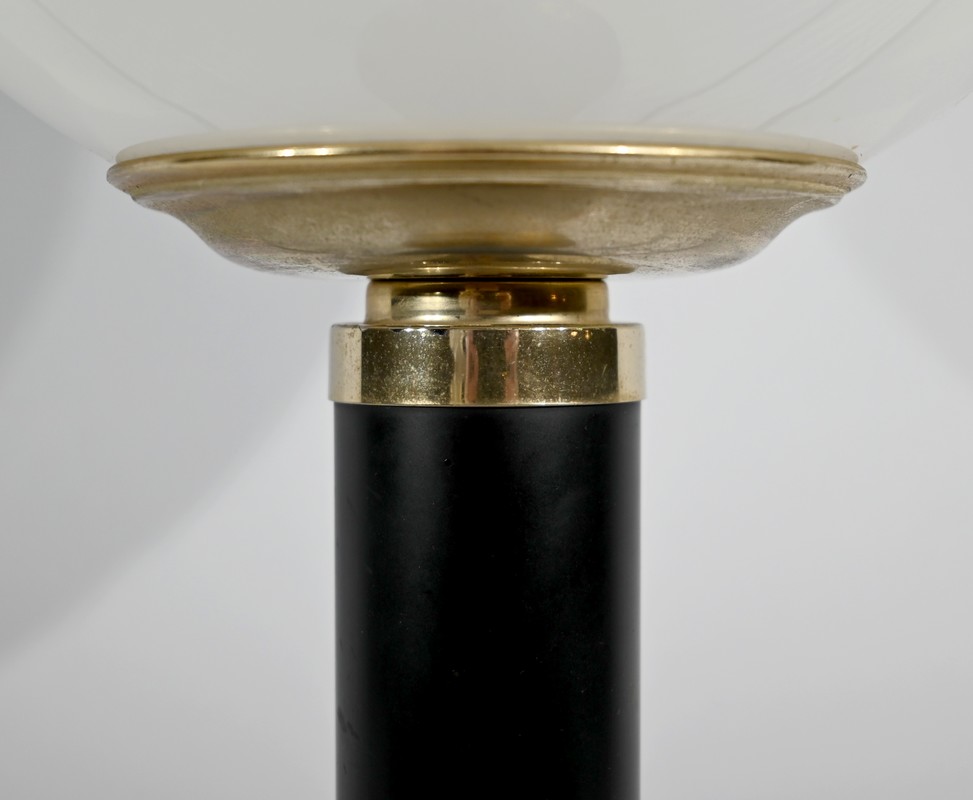 Cette lampe est sommée d’un important globe en verre opale souligné par une collerette en laiton.
