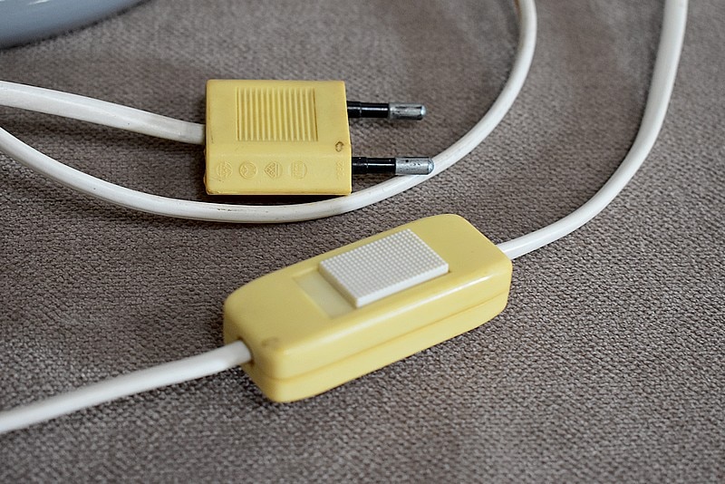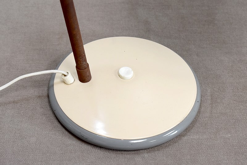 Un petit bouton blanc décoratif orne le sommet de l’abat-jour ainsi que le centre du pied circulaire.