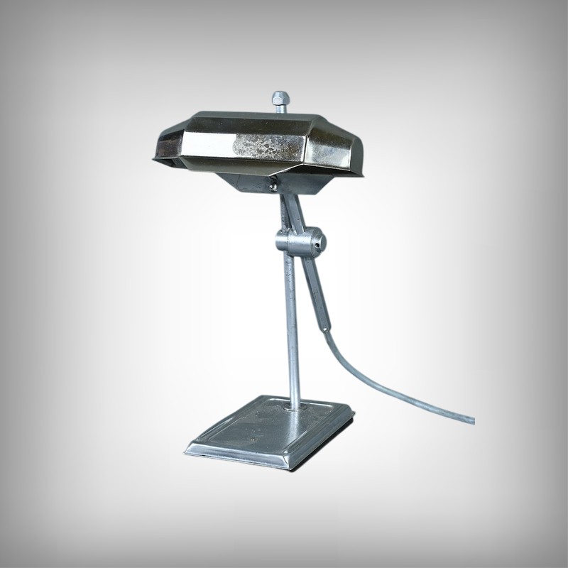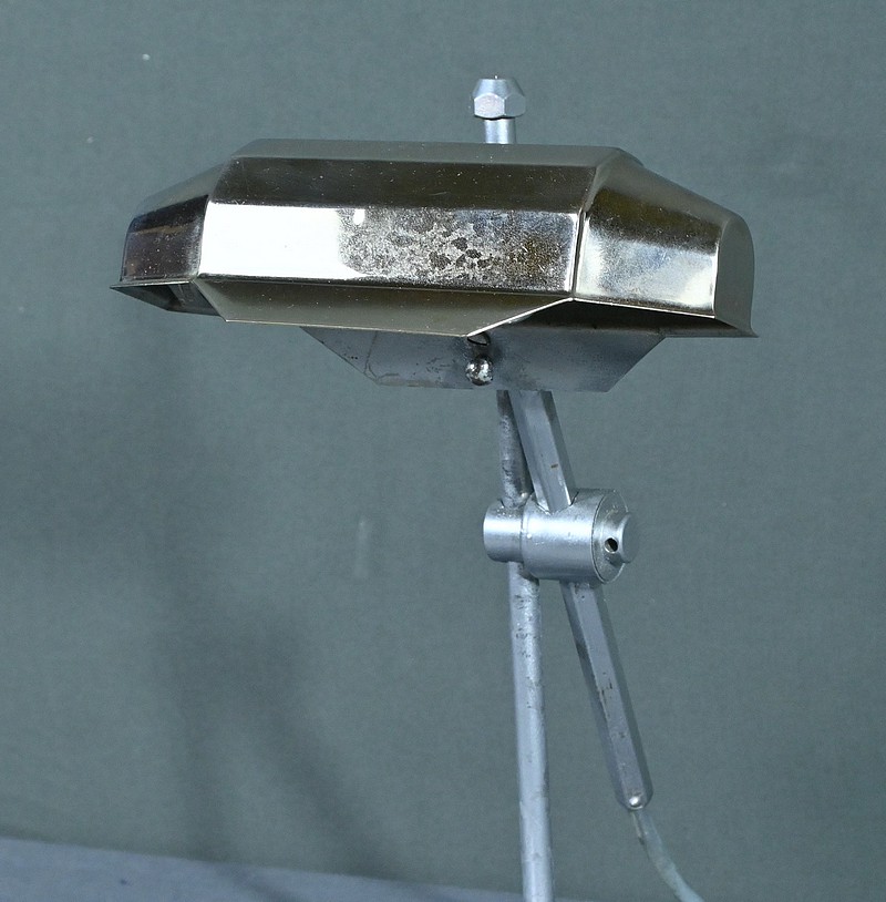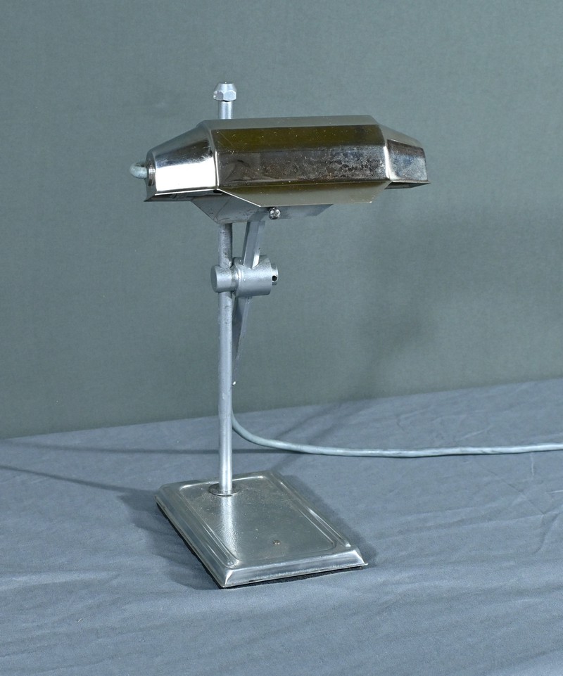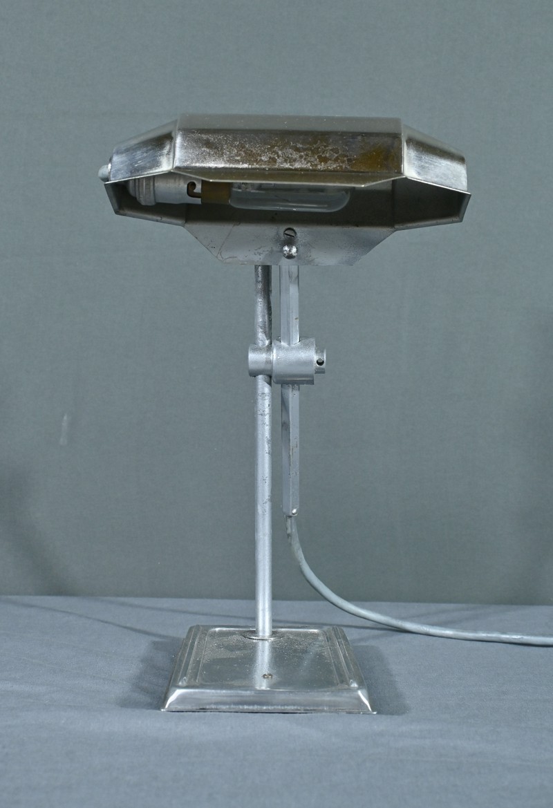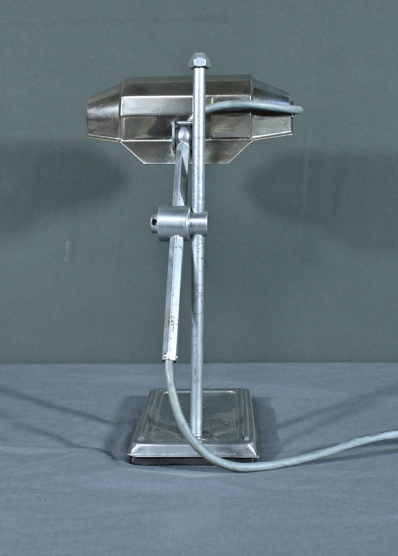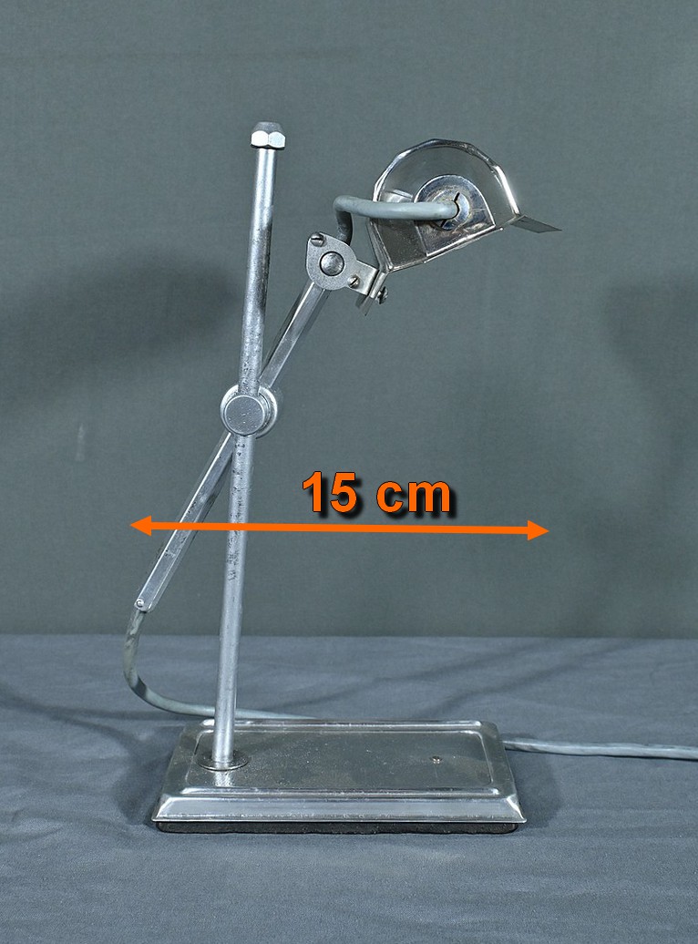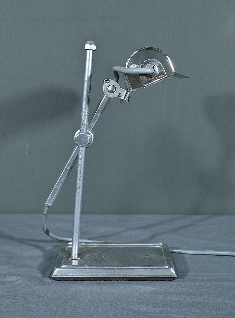 Cette lampe Pirouett de Jean Chavanis, conçue dans les années 1940, servait à l’origine pour éclairer les machines à écrire et les machines comptables avec précision. Cette lampe électrique, dotée d’un éclairage orientable et d’une hauteur de feu ajustable, se distingue par son abat-jour à facettes, une création typique du style Art déco. L’ingéniosité de son design repose également sur son articulation révolutionnaire pour l’époque, permettant de rétracter son bras à l’intérieur de sa colonne. Dans cette version spécifique, le luminaire repose sur un socle rectangulaire et présente une colonne lisse articulée à un fût à pans coupés. Chef-d’œuvre du savoir-faire français du début de XXème siècle, cette lampe séduit non seulement par sa forme intemporelle et contemporaine, mais aussi par l’histoire qu’elle raconte, témoin d’une époque riche en innovations.