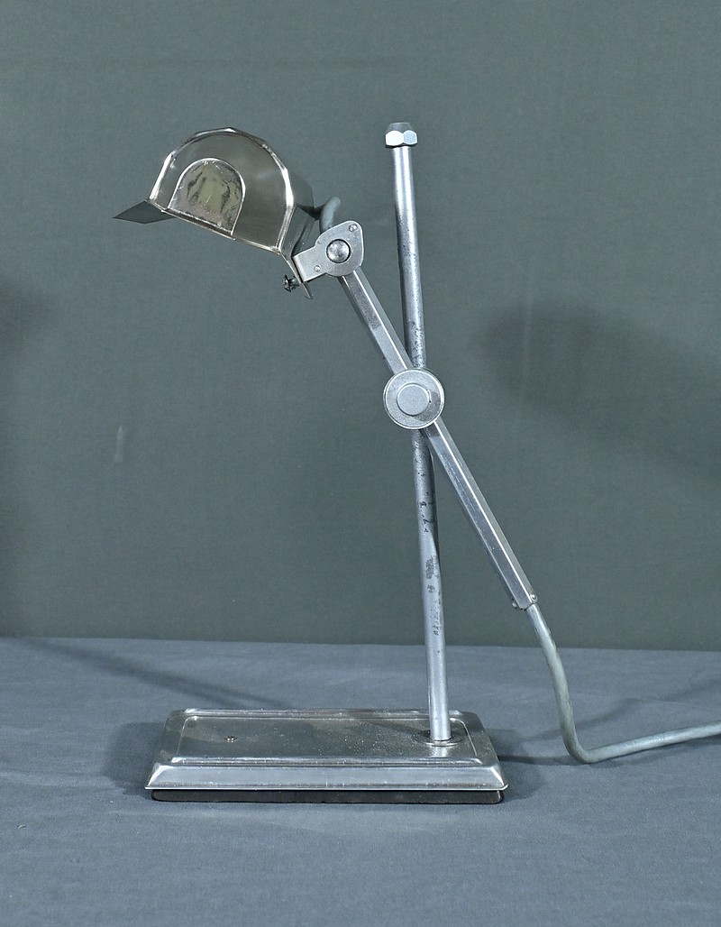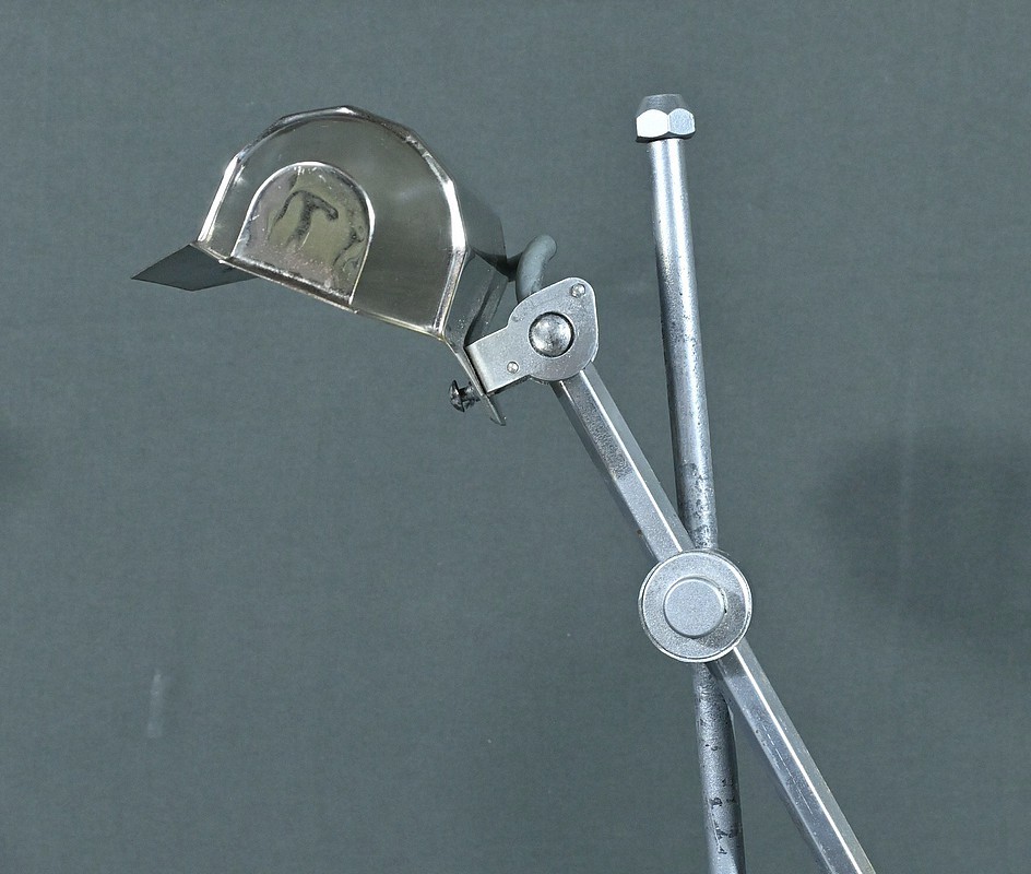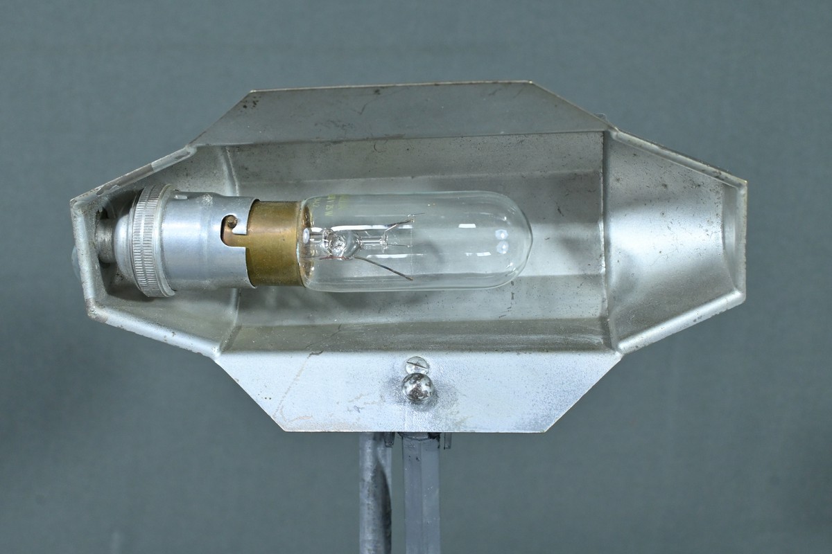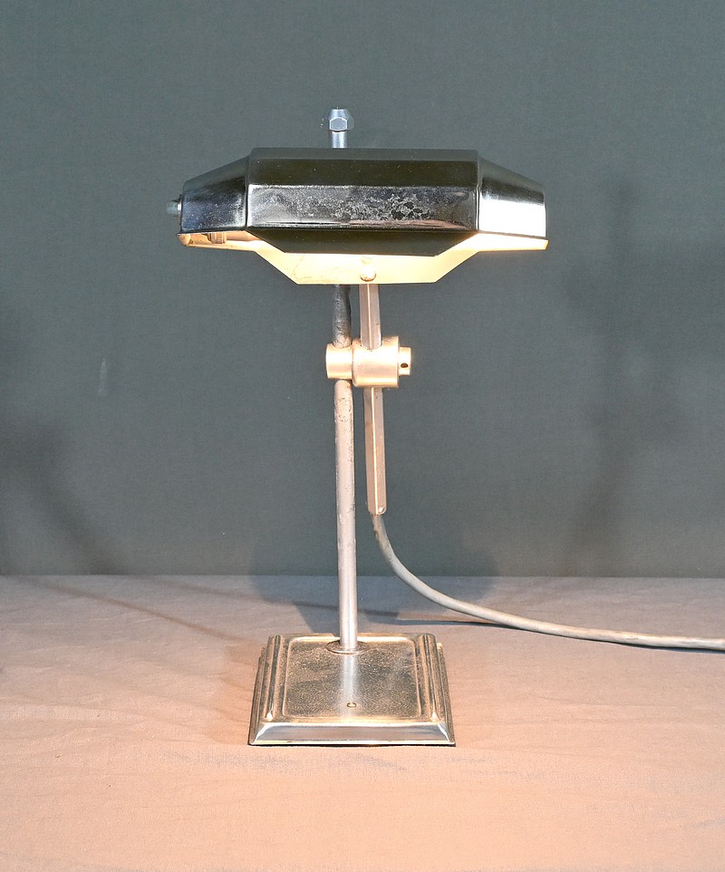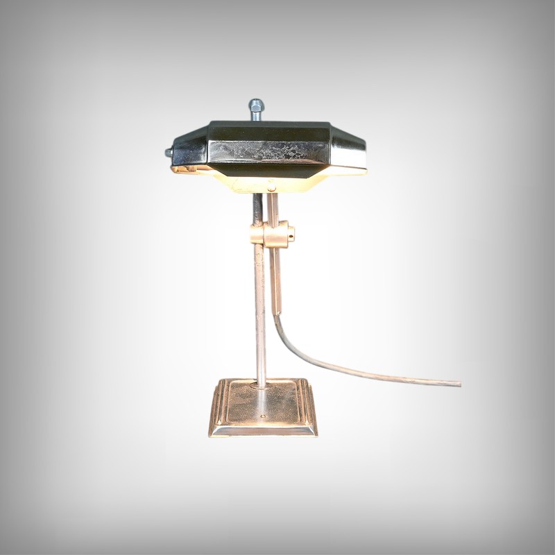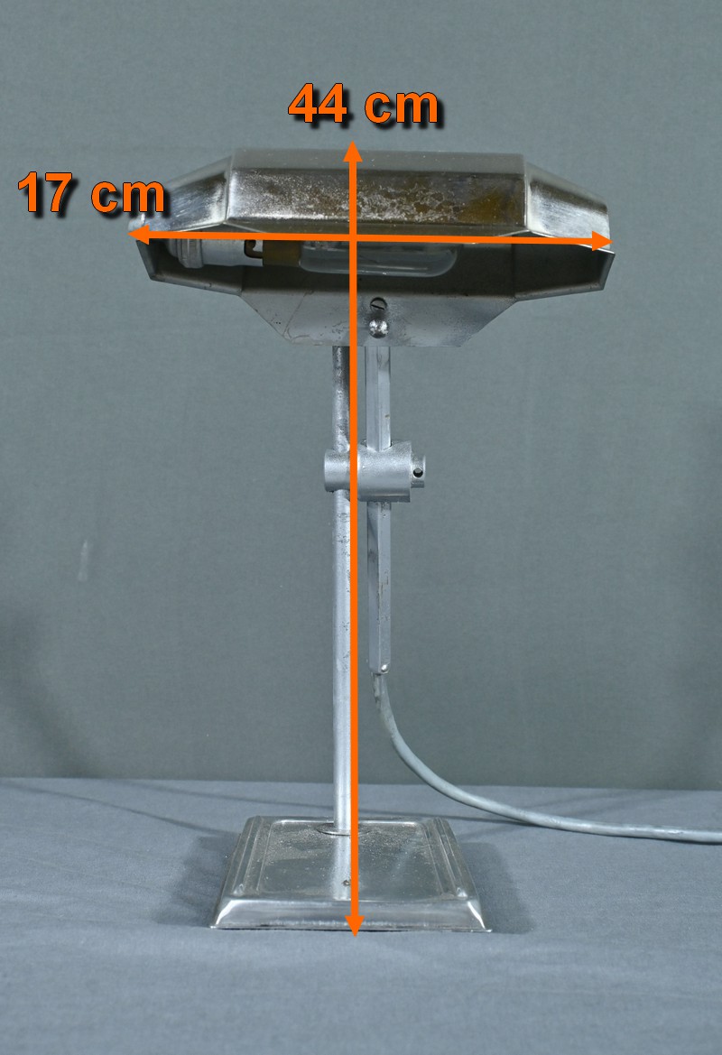 Cette lampe Pirouett de Jean Chavanis, conçue dans les années 1940, servait à l’origine pour éclairer les machines à écrire et les machines comptables avec précision. Cette lampe électrique, dotée d’un éclairage orientable et d’une hauteur de feu ajustable, se distingue par son abat-jour à facettes, une création typique du style Art déco. L’ingéniosité de son design repose également sur son articulation révolutionnaire pour l’époque, permettant de rétracter son bras à l’intérieur de sa colonne. Dans cette version spécifique, le luminaire repose sur un socle rectangulaire et présente une colonne lisse articulée à un fût à pans coupés. Chef-d’œuvre du savoir-faire français du début de XXème siècle, cette lampe séduit non seulement par sa forme intemporelle et contemporaine, mais aussi par l’histoire qu’elle raconte, témoin d’une époque riche en innovations.
