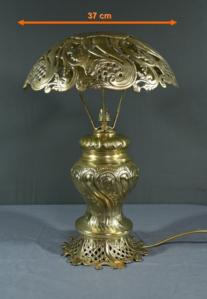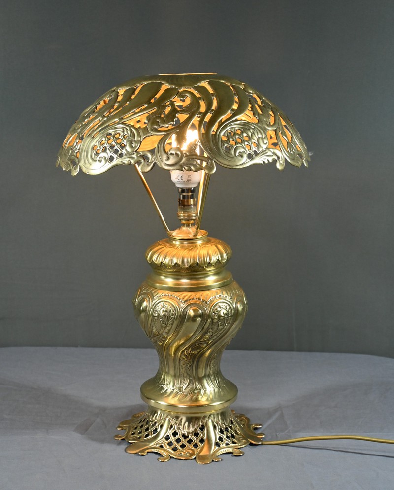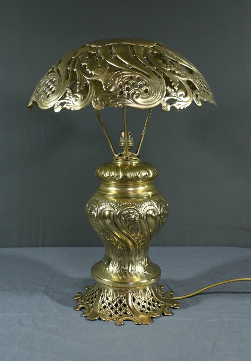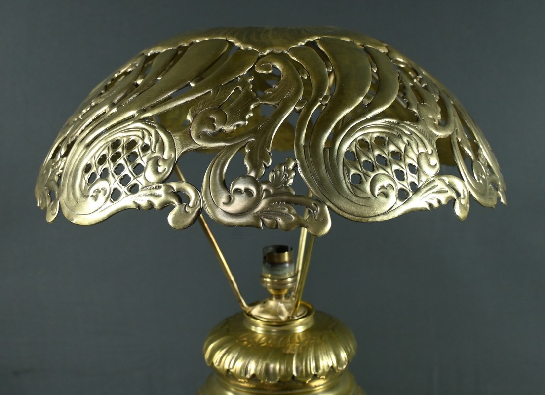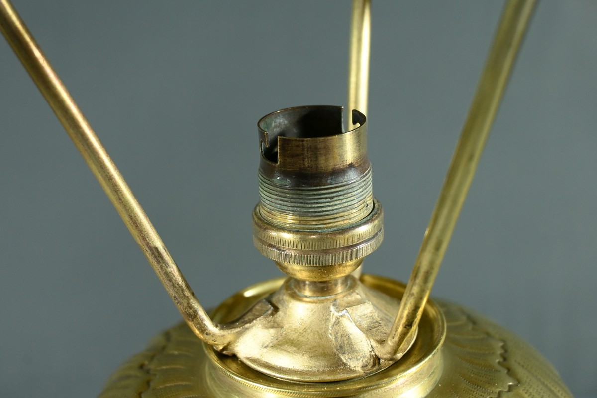 Cette lampe en laiton doré, datant des années 1920, est un véritable bijou de l’art décoratif.