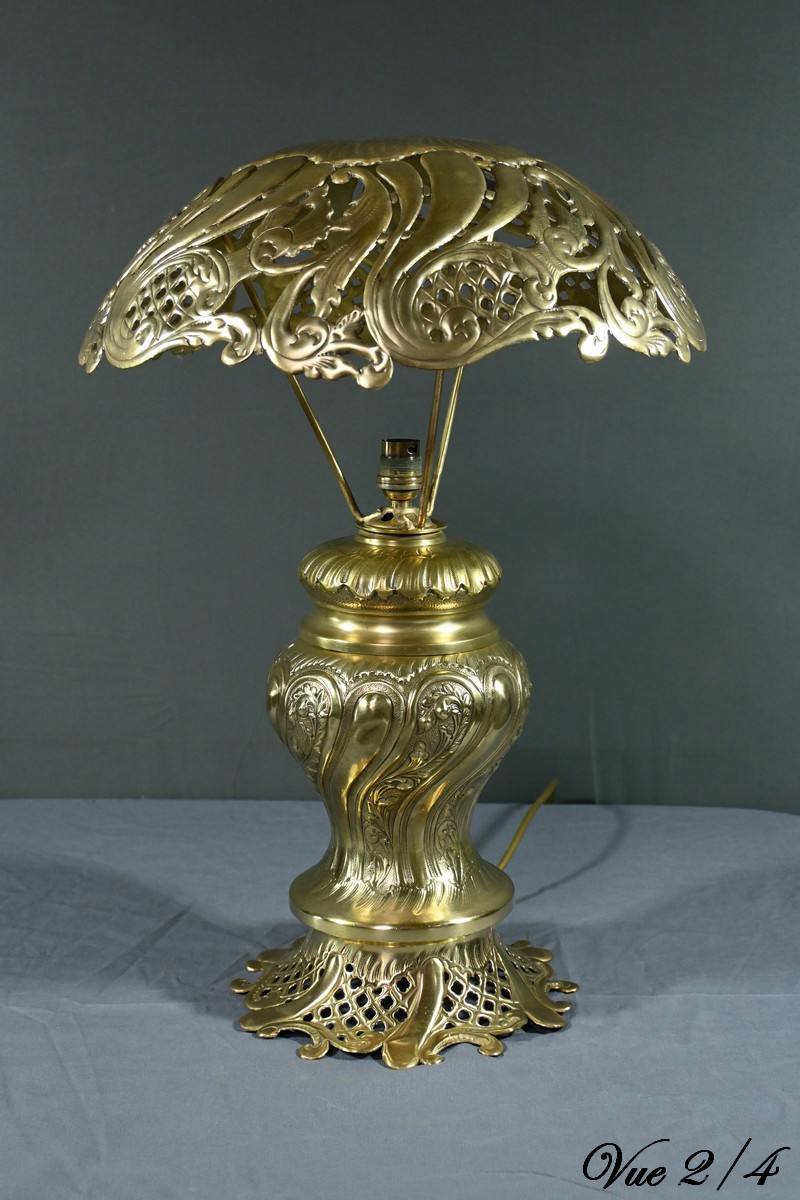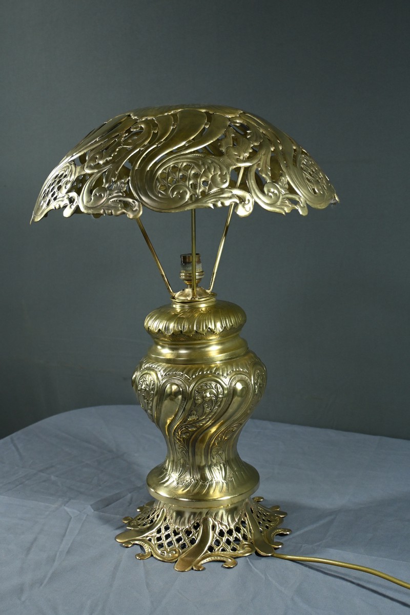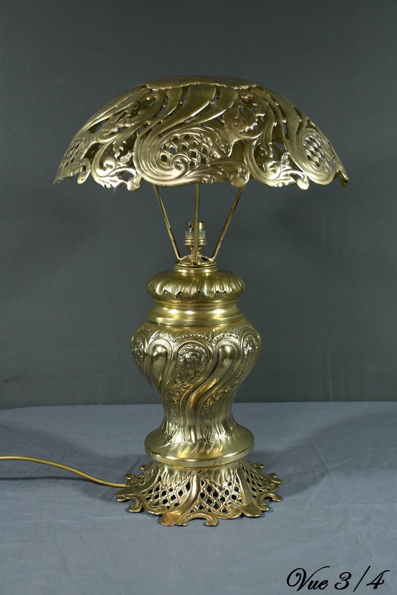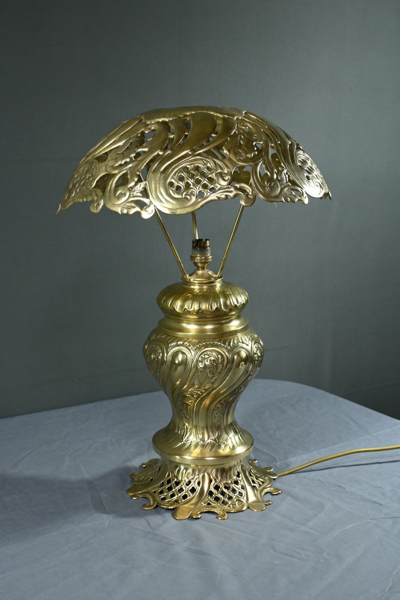 Cette lampe en laiton doré, datant des années 1920, est un véritable bijou de l’art décoratif.