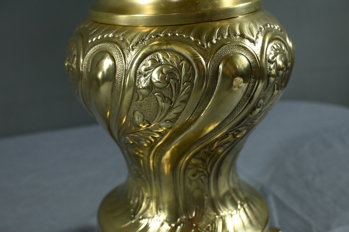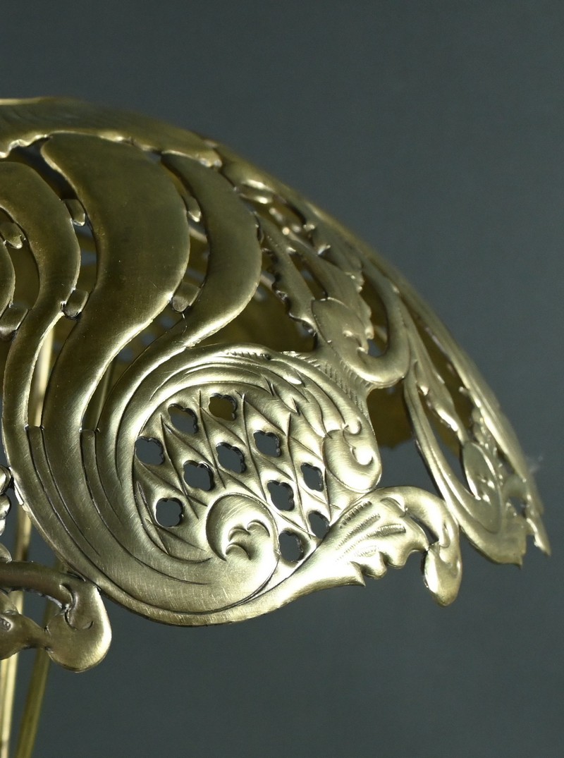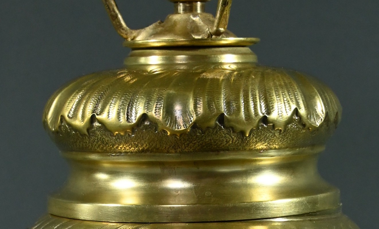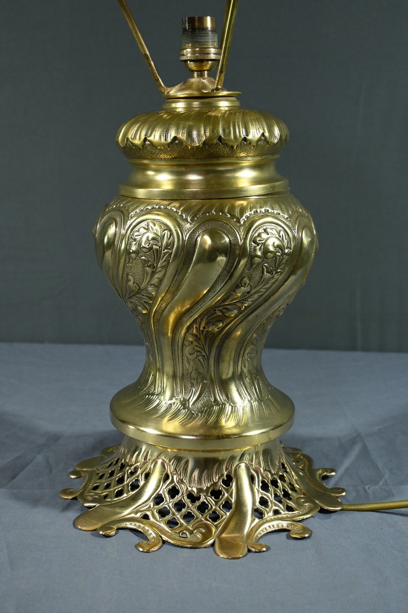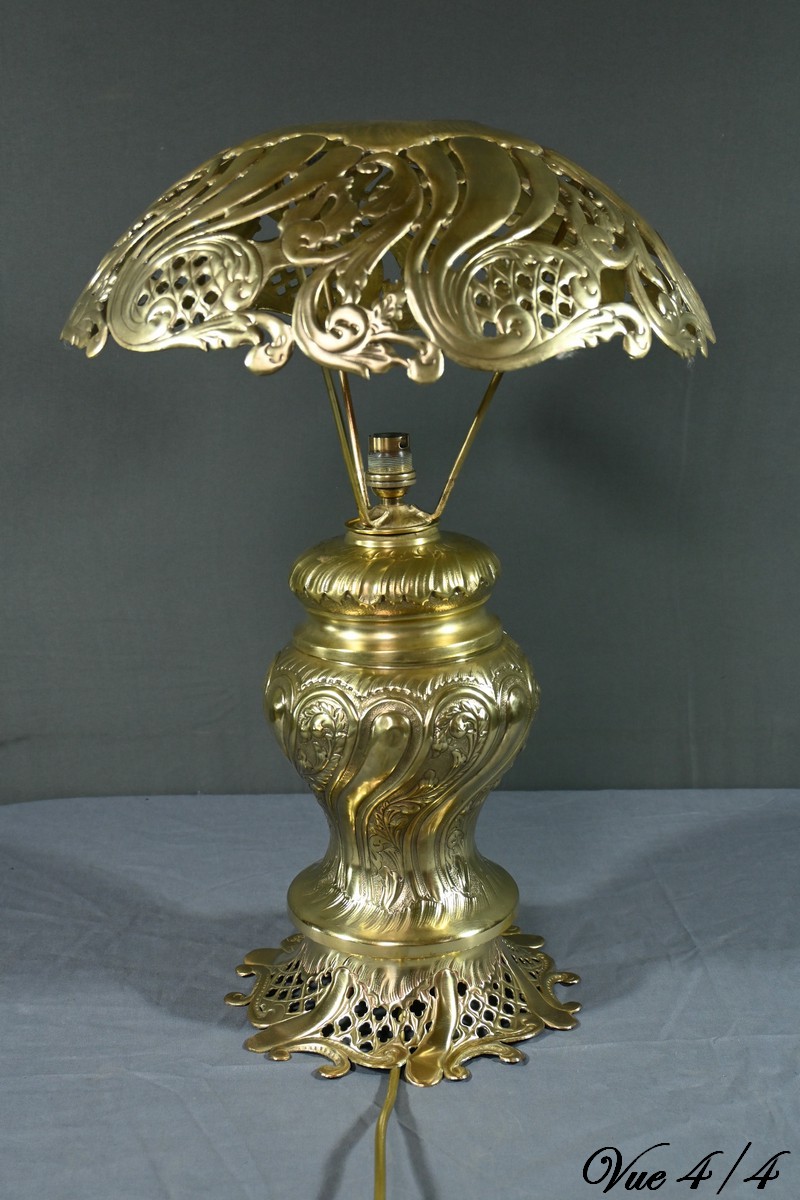Cette lampe en laiton doré, datant des années 1920, est un véritable bijou de l’art décoratif.