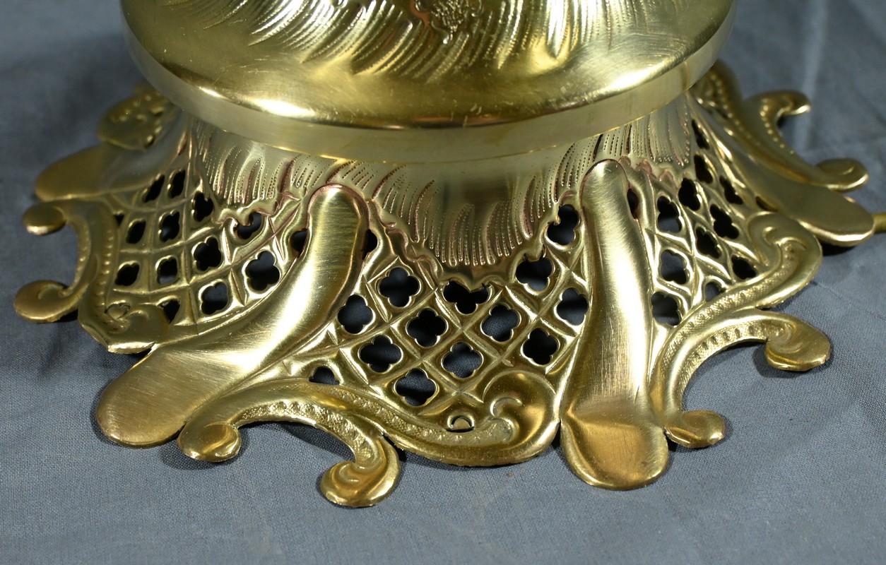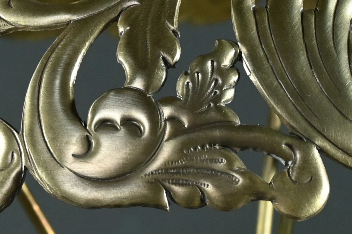 L’ensemble repose sur une base évasée et ajourée, typique du style rocaille, qui ajoute une touche de légèreté et de sophistication.