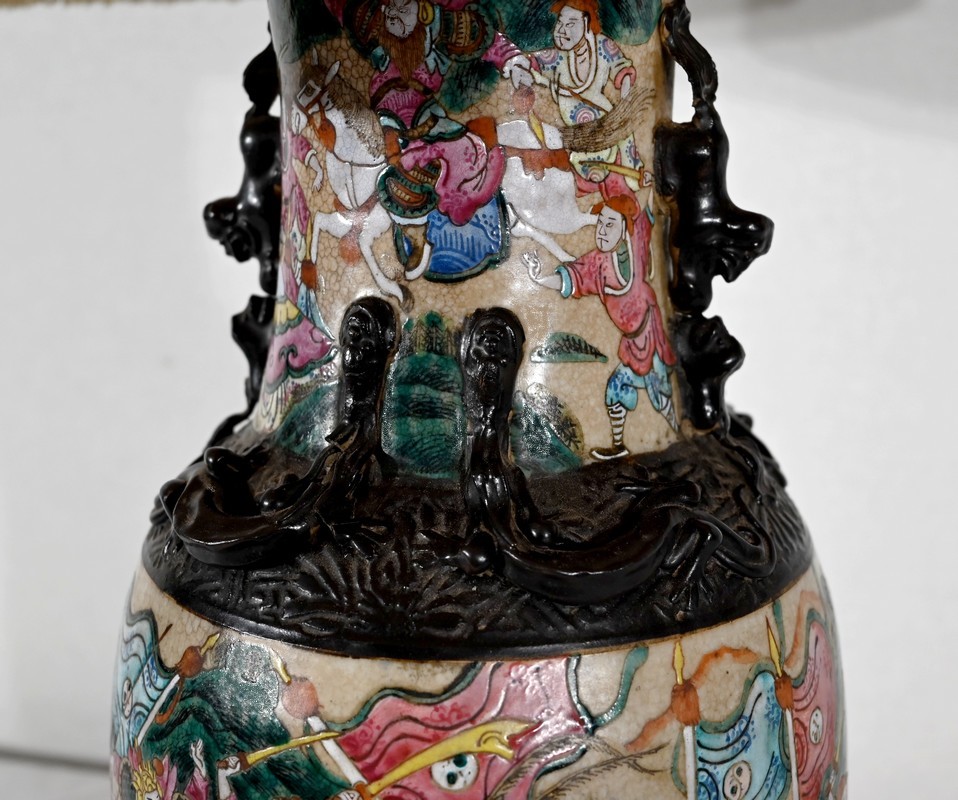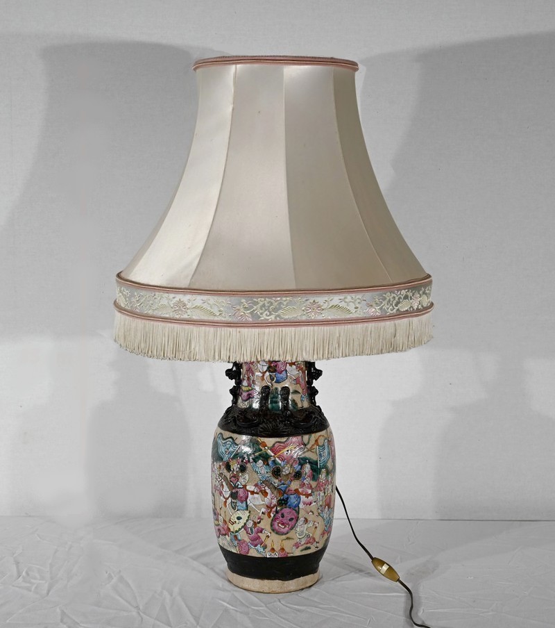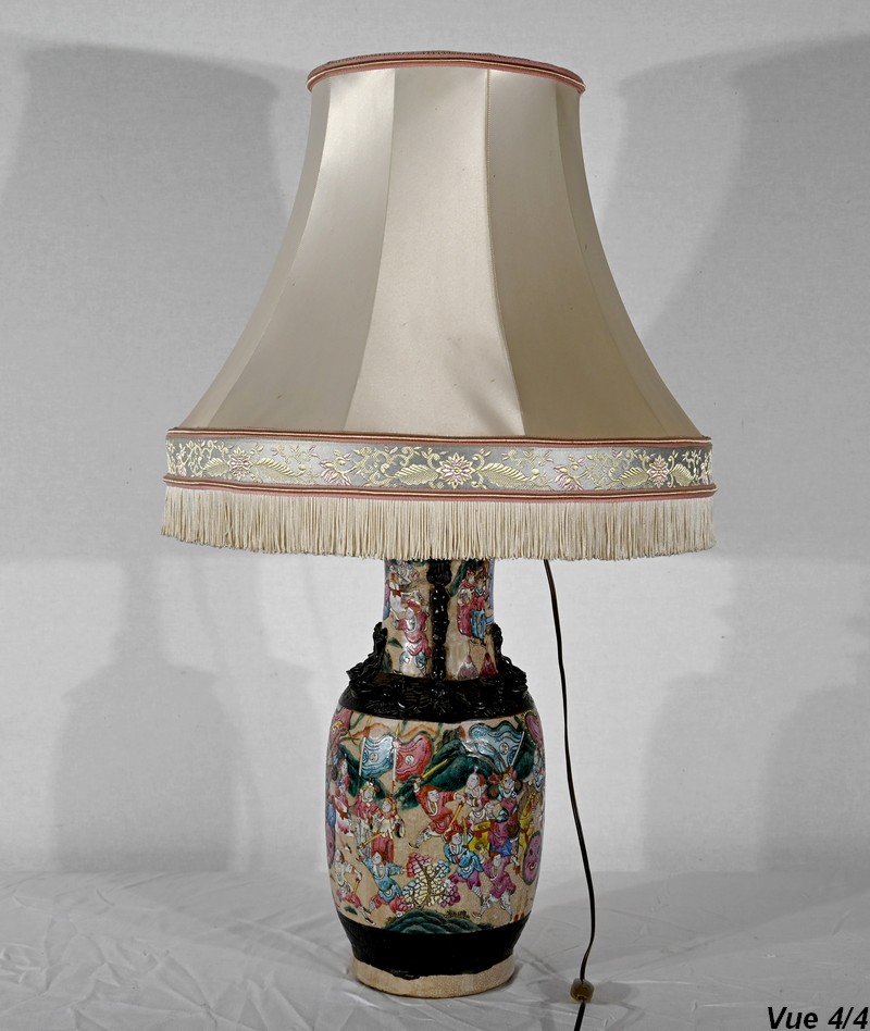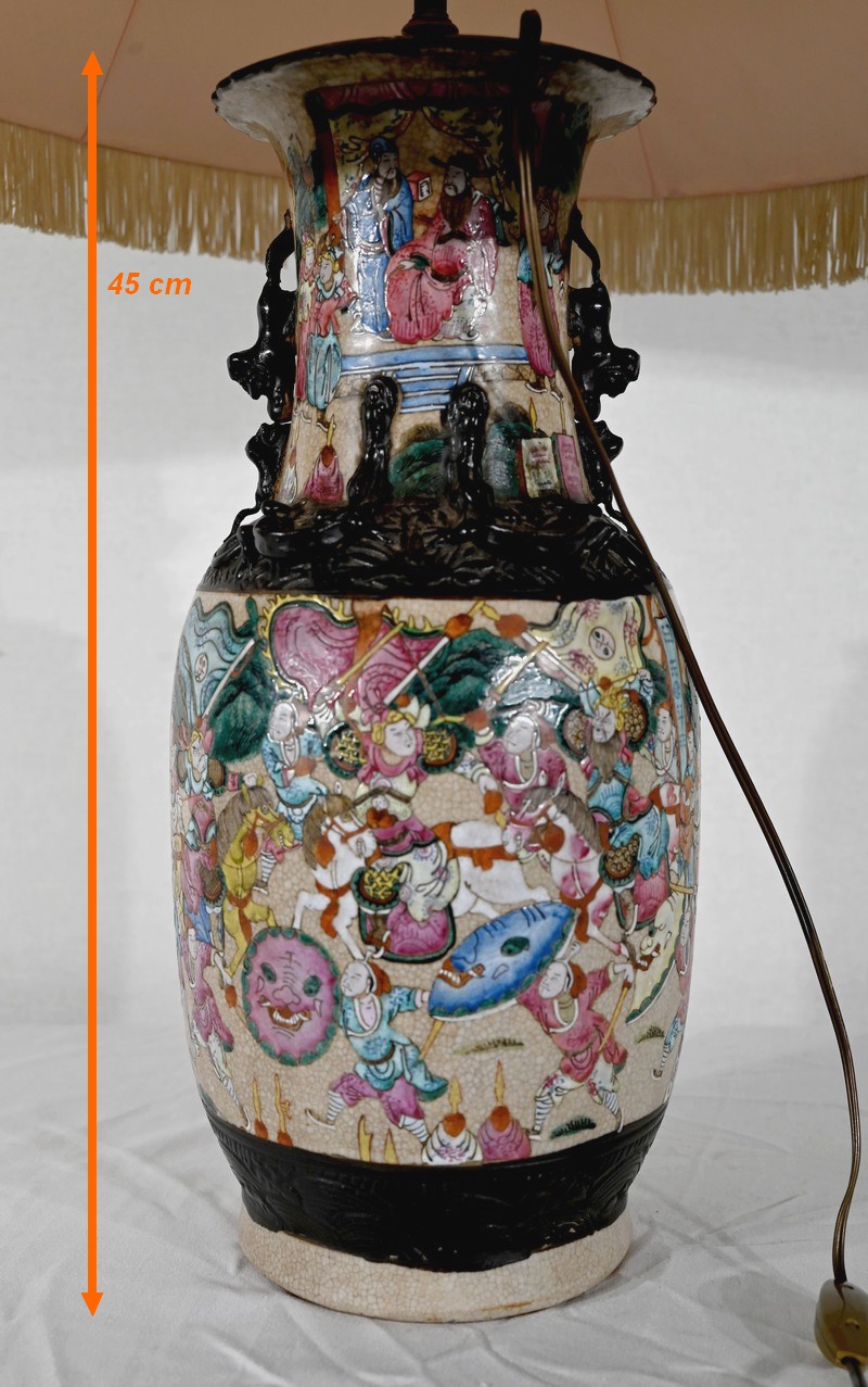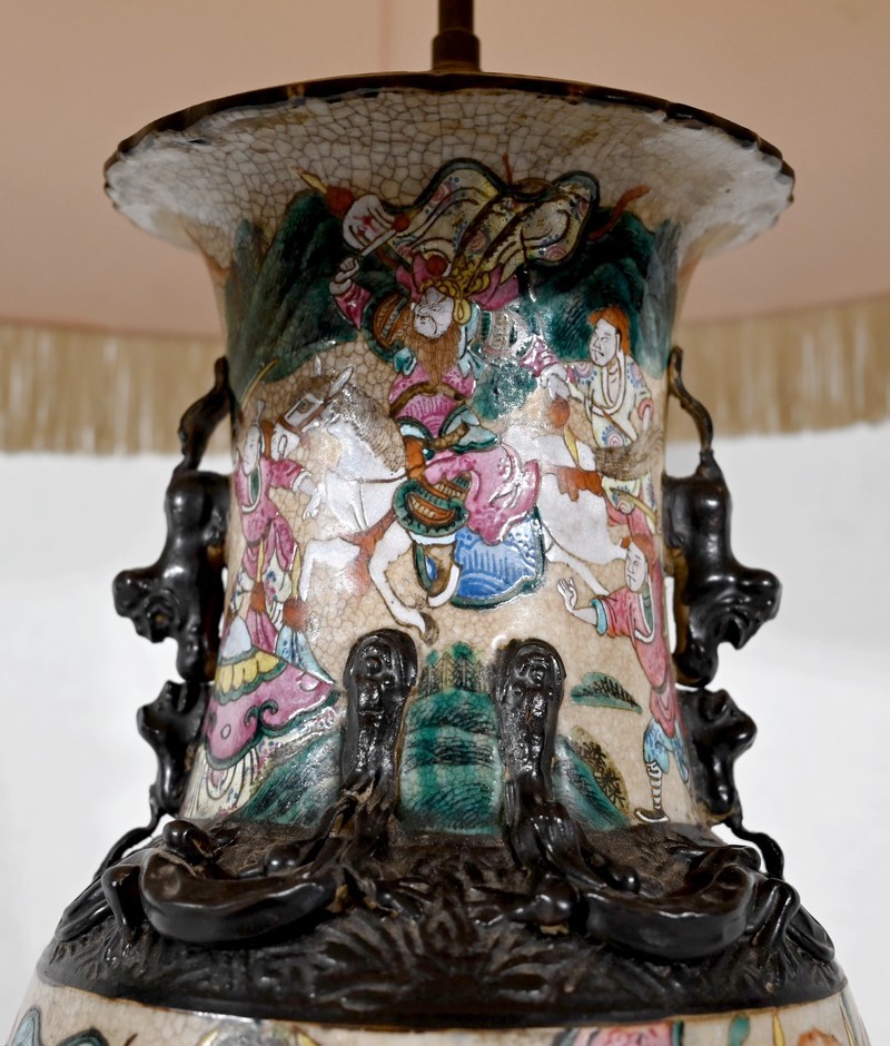 Cette lampe présente un décor émaillé polychrome tournant d’une scène de bataille entre guerriers asiatiques finement illustrés. Elle est ornée, en relief, de chiens de Fô sur le col et d’animaux fantastiques ressemblant à des lézards sur l’épaule.