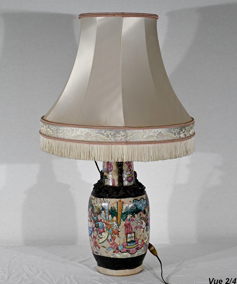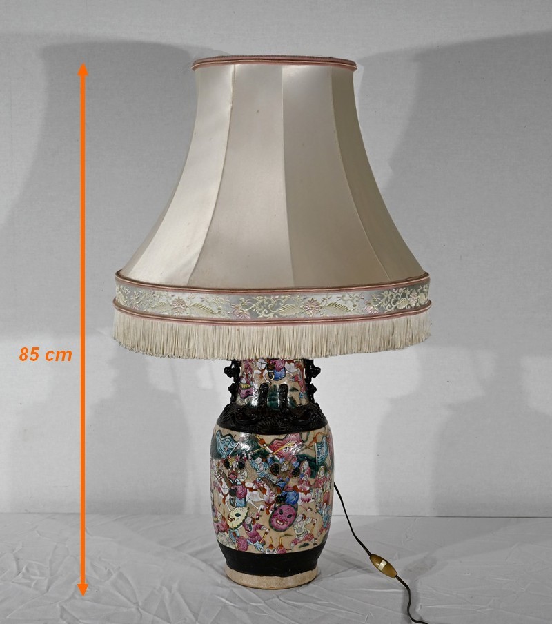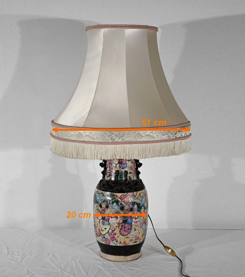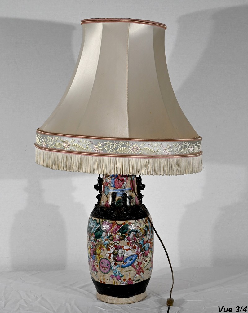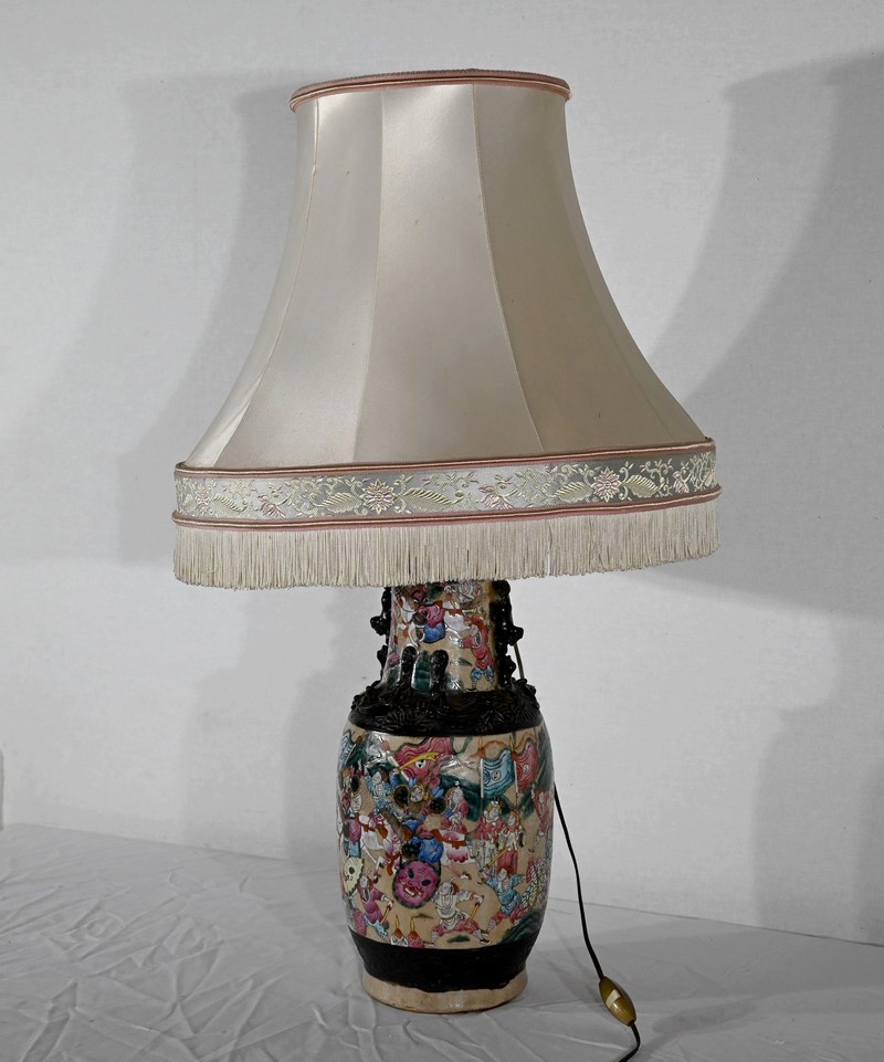 Cette lampe présente un décor émaillé polychrome tournant d’une scène de bataille entre guerriers asiatiques finement illustrés. Elle est ornée, en relief, de chiens de Fô sur le col et d’animaux fantastiques ressemblant à des lézards sur l’épaule.