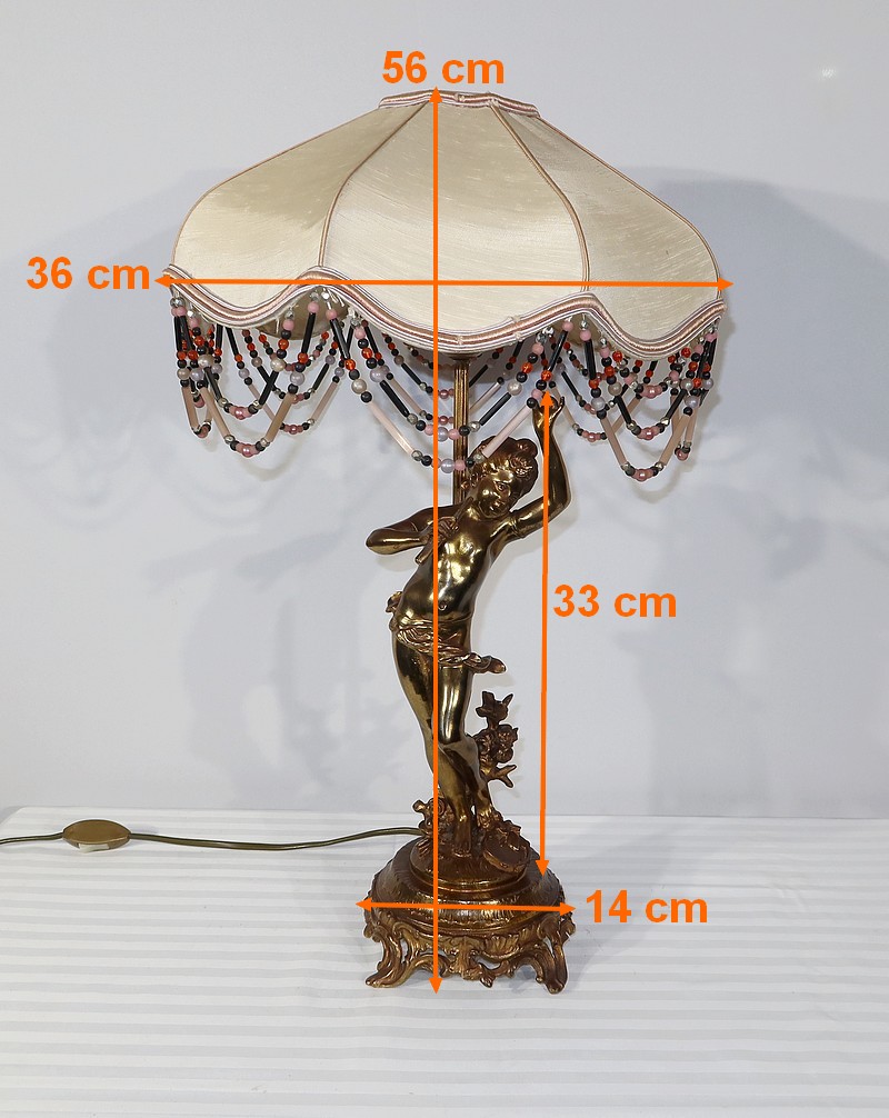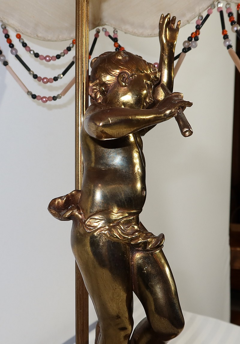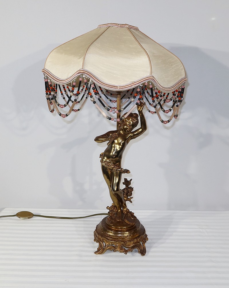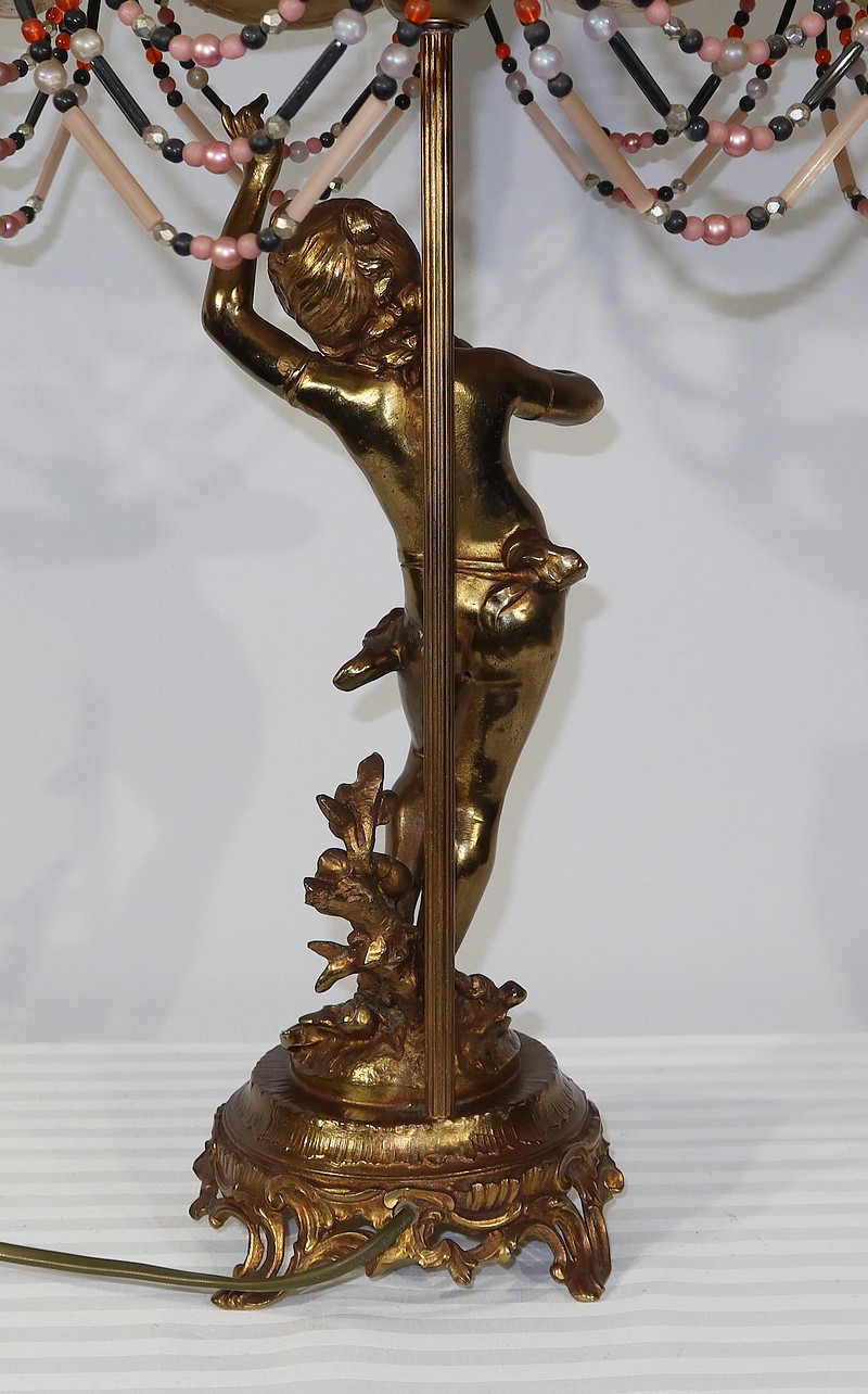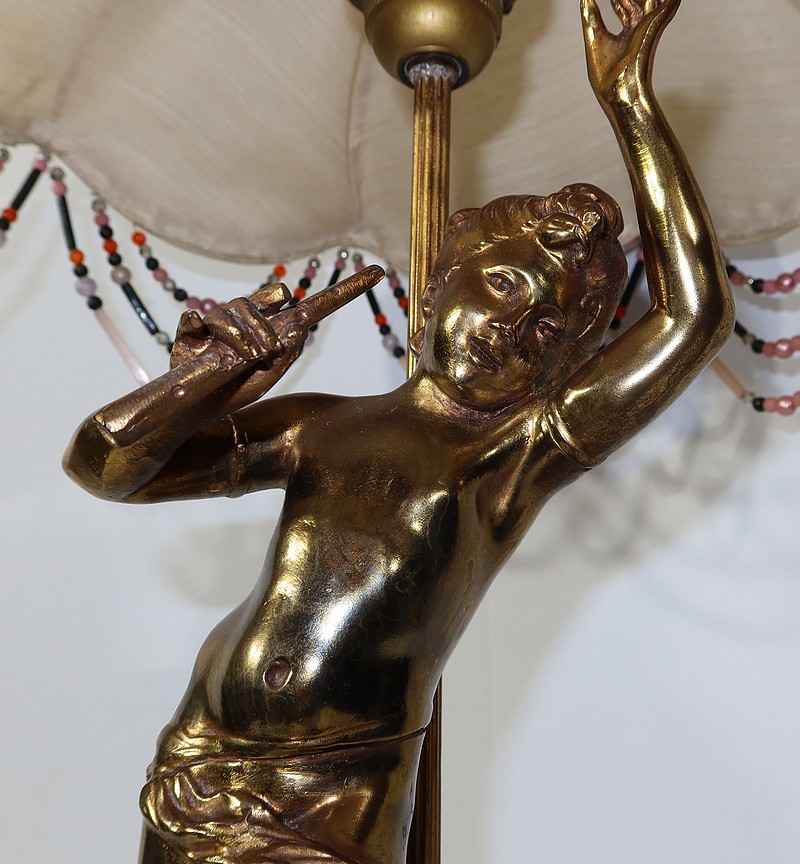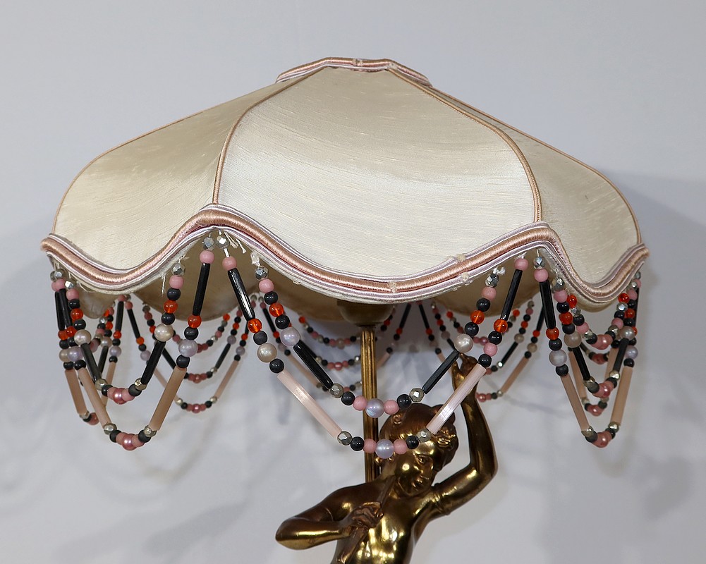 Charmante lampe en régule à patine mordorée représentant une jeune musicienne dansant, sommée d’un abat-jour à la forme singulière agrémenté de guirlandes de perles.