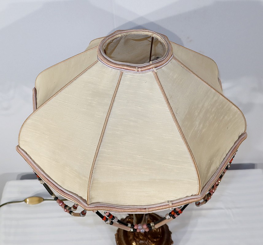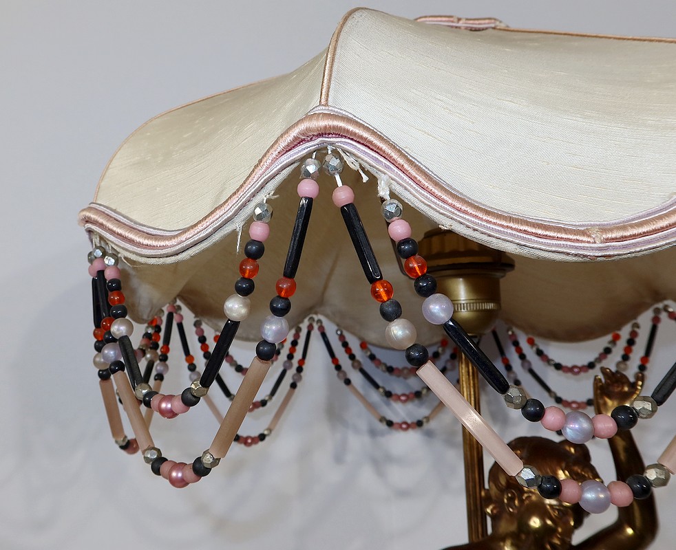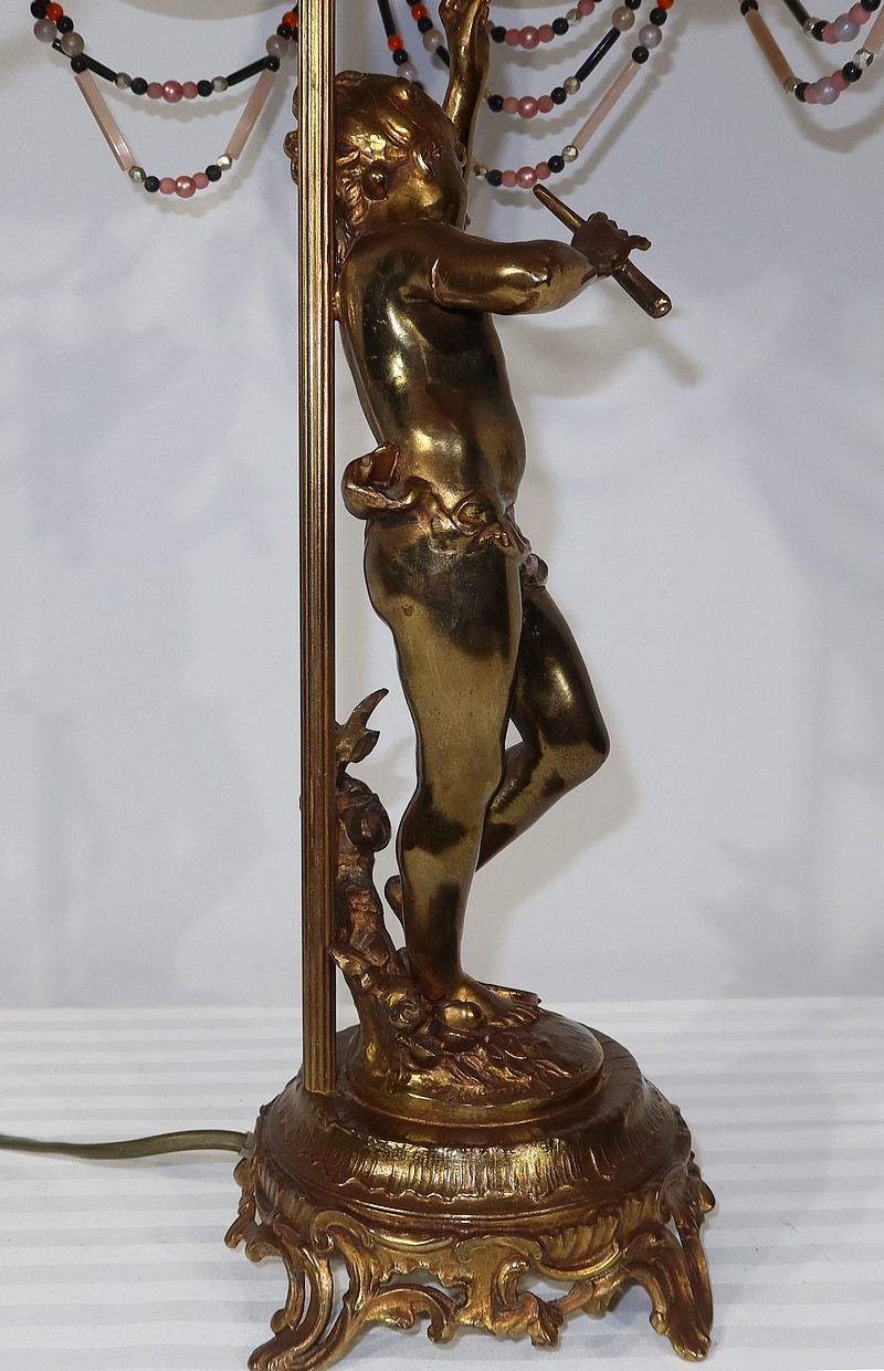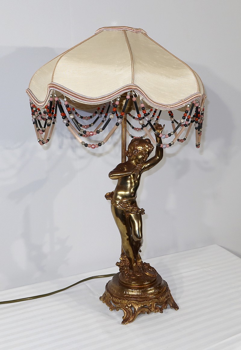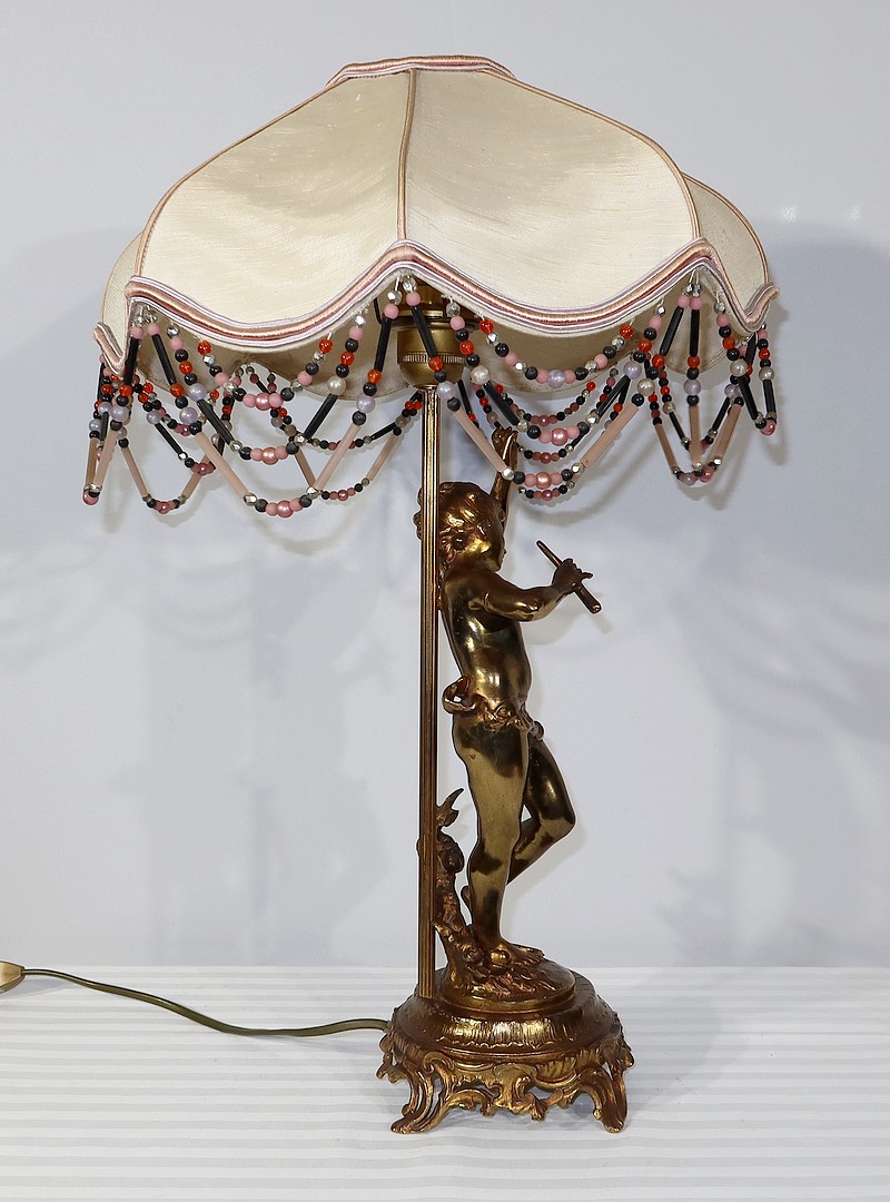 Charmante lampe en régule à patine mordorée représentant une jeune musicienne dansant, sommée d’un abat-jour à la forme singulière agrémenté de guirlandes de perles.
