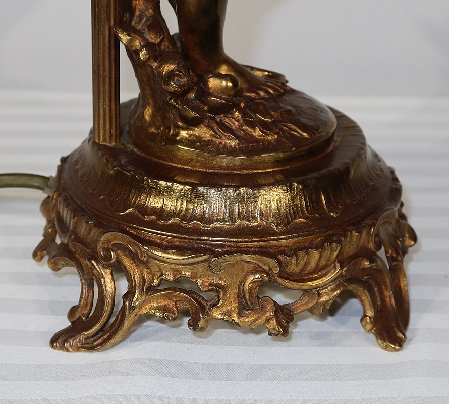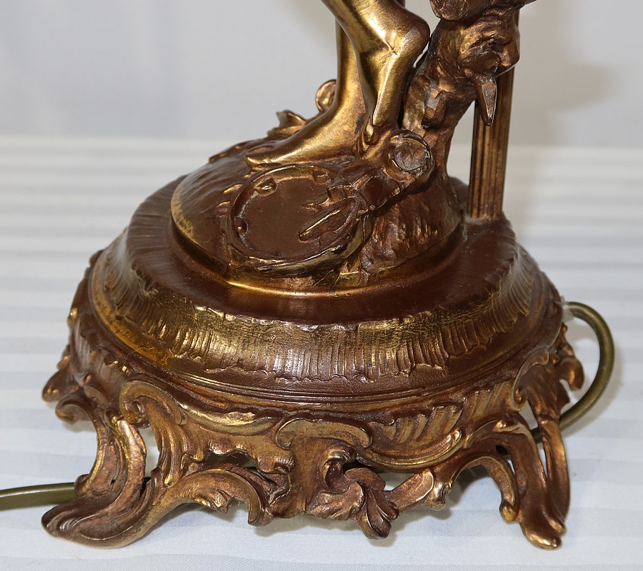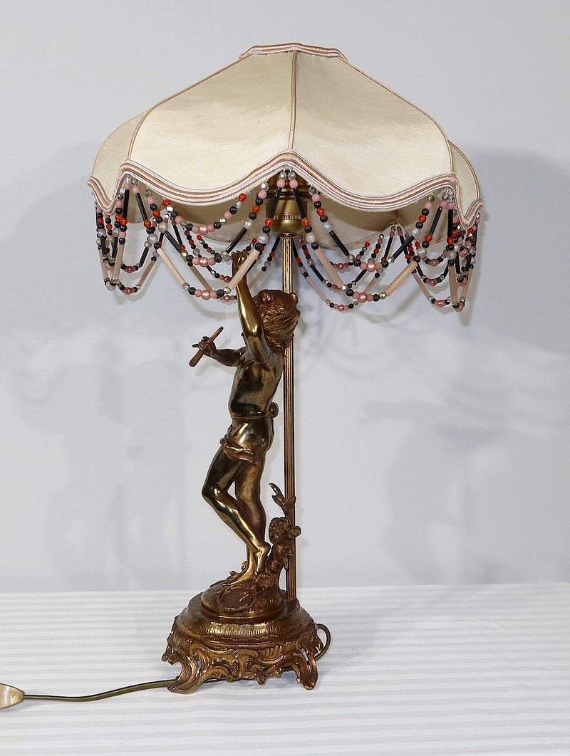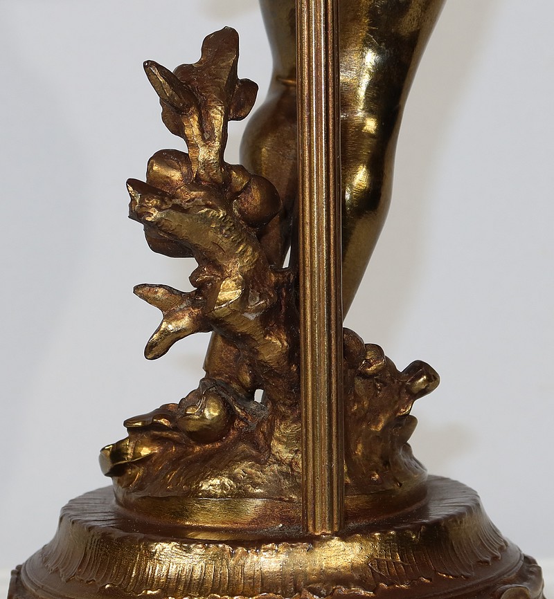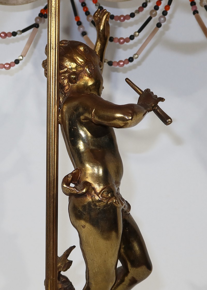 Inspirée de l’œuvre d’Auguste Moreau (1834-1917) cette lampe se distingue par son approche romantique. Une enfant joyeuse, légèrement vêtue et le corps en mouvement, tient dans sa main droite une flûte. A ses pieds, un tambourin repose, entouré d’un parterre de feuillage et de fleurs. Un rosier monte vers le ciel accentuant le réalisme de la scène.