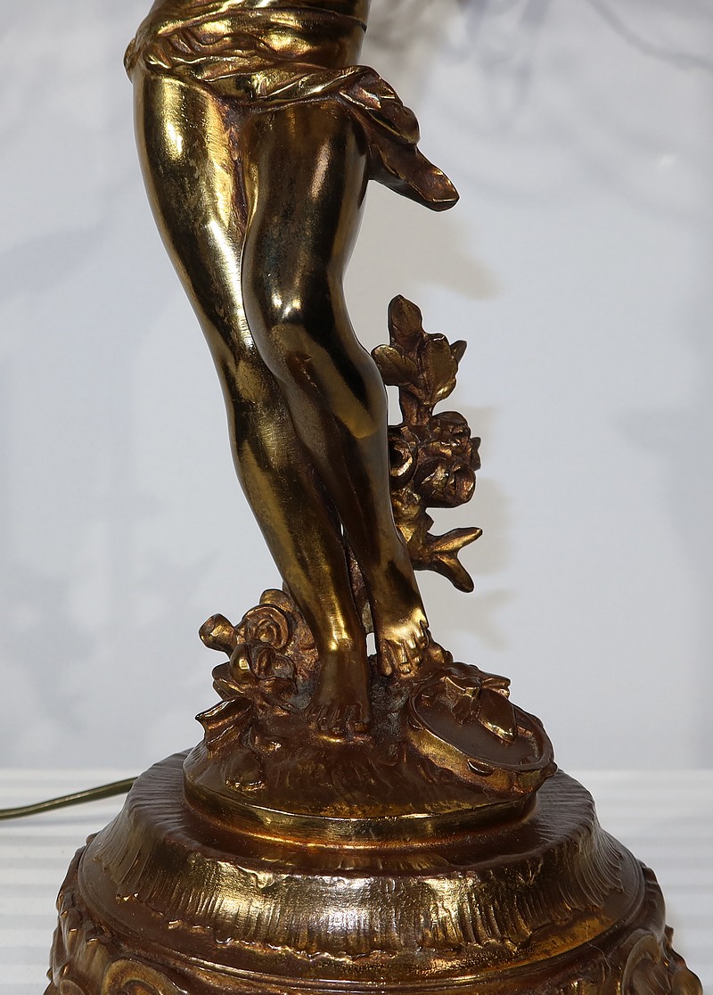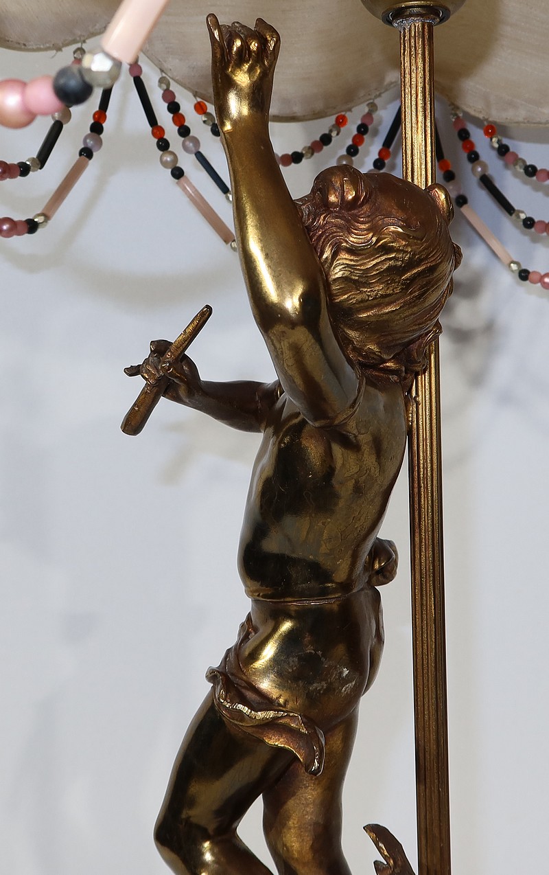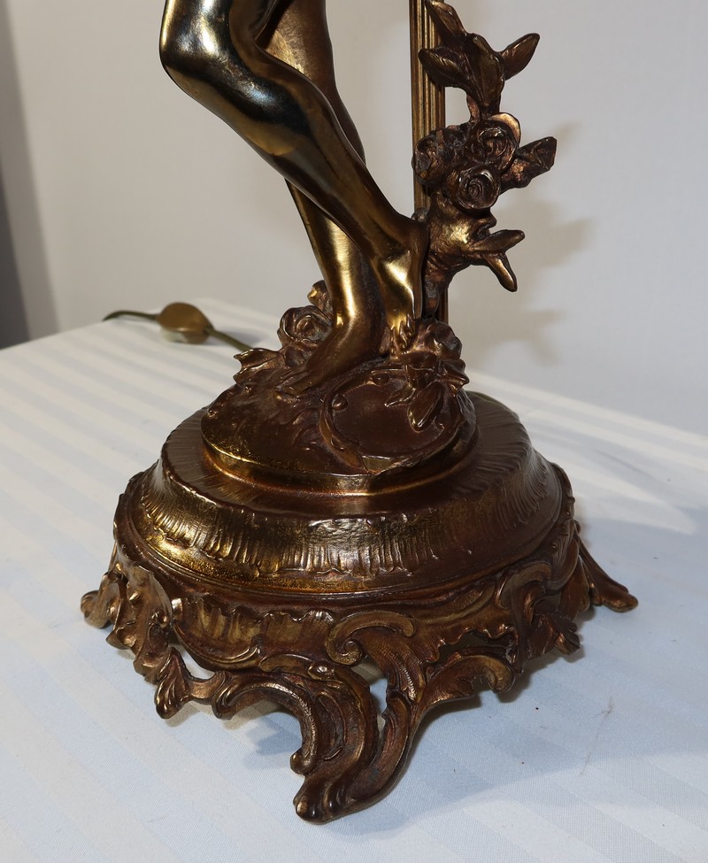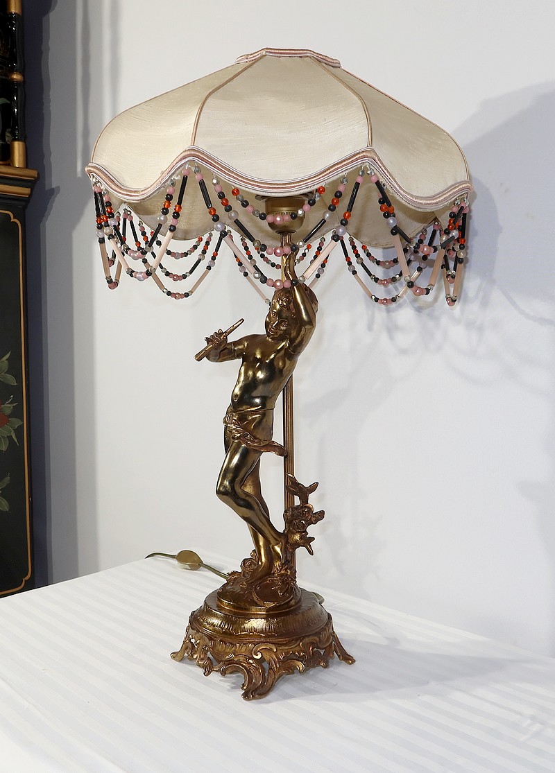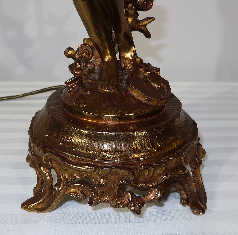 Inspirée de l’œuvre d’Auguste Moreau (1834-1917) cette lampe se distingue par son approche romantique. Une enfant joyeuse, légèrement vêtue et le corps en mouvement, tient dans sa main droite une flûte. A ses pieds, un tambourin repose, entouré d’un parterre de feuillage et de fleurs. Un rosier monte vers le ciel accentuant le réalisme de la scène.