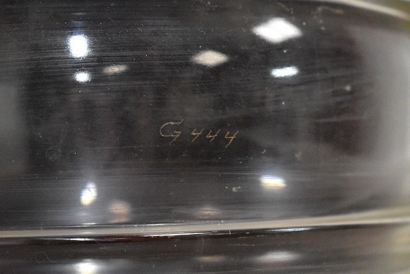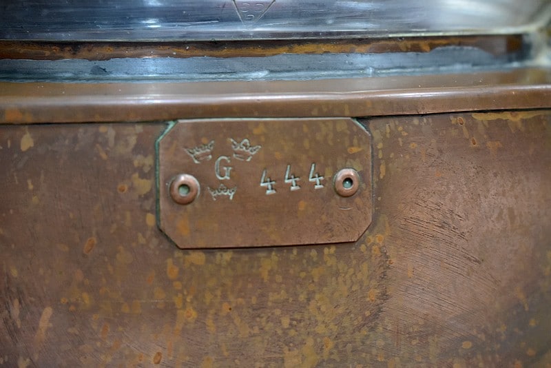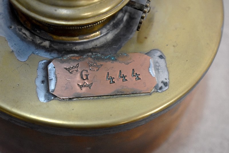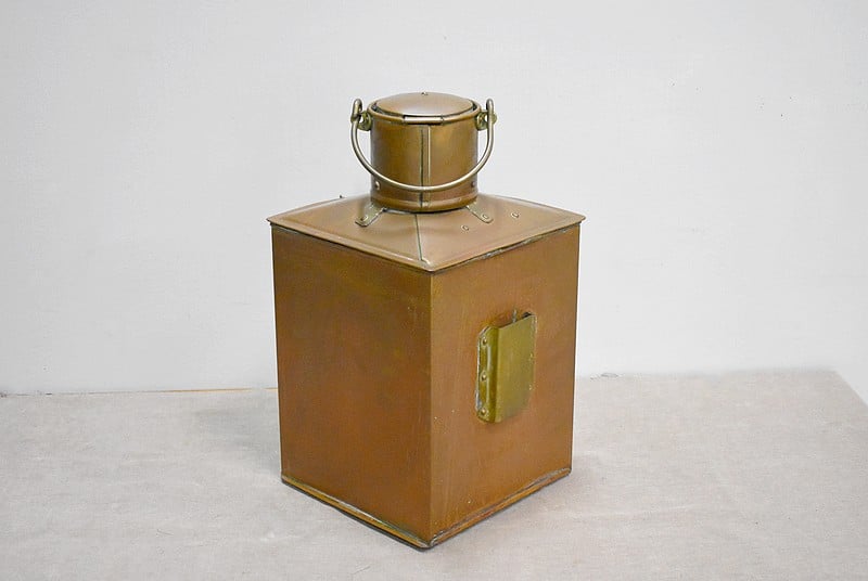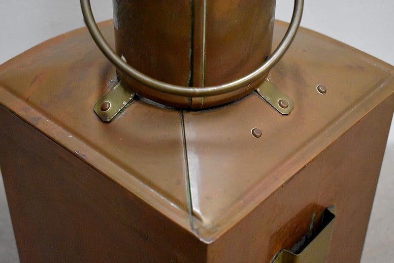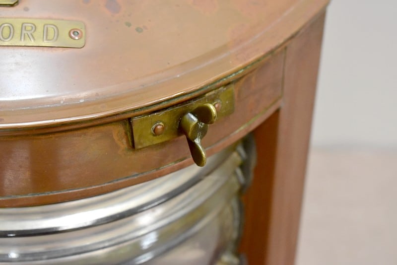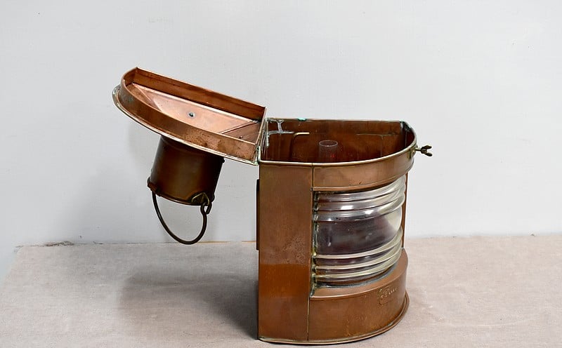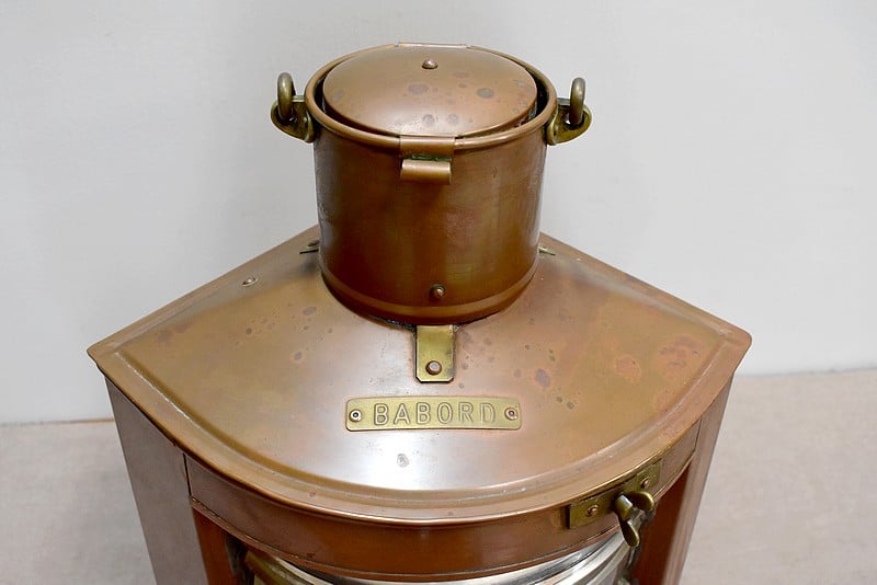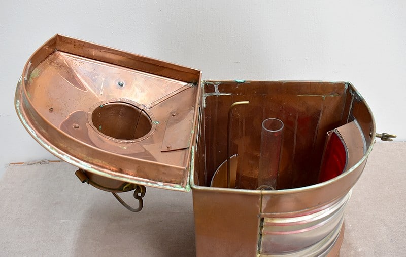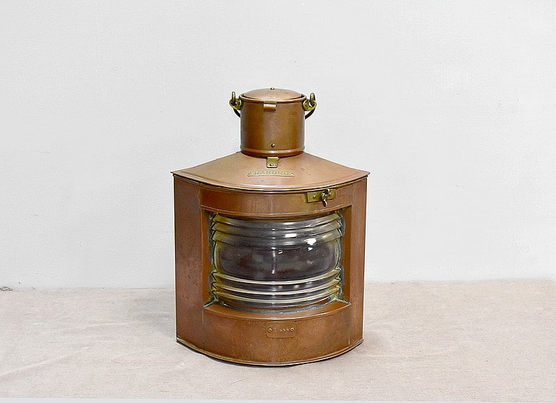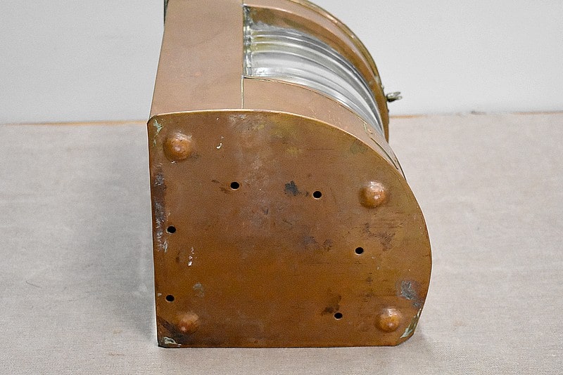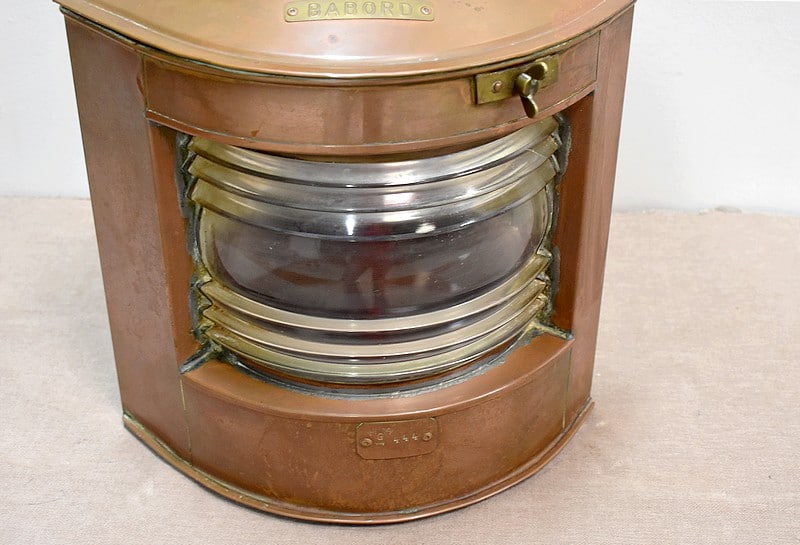 Lanterne de Marine d’angle Bâbord en Cuivre estampillée d’un G et de 3 couronnes et numéroté G 444. Un logo triangulaire incluant 3 ‘G’ est également présent.