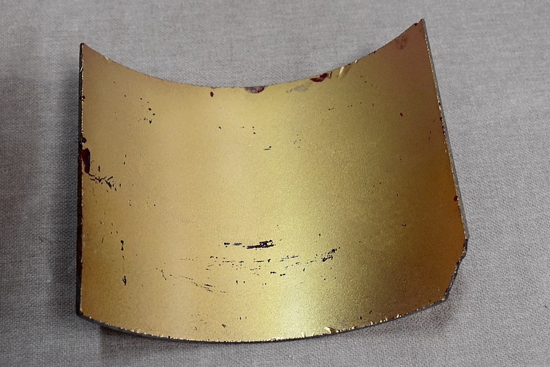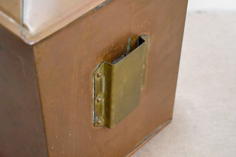 Elle ouvre par un petit couvercle sur le dessus ainsi que par un plus grand couvercle fermant par visserie et doté d’une anse.