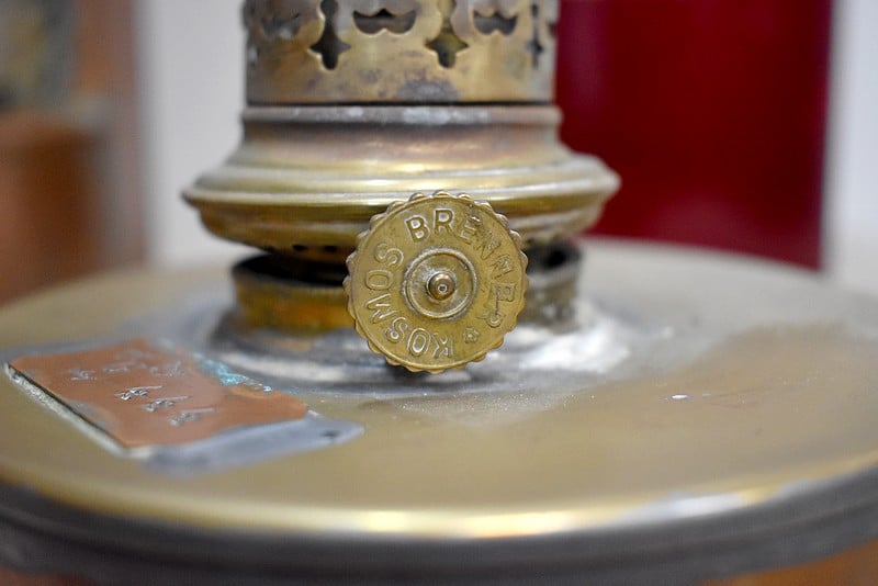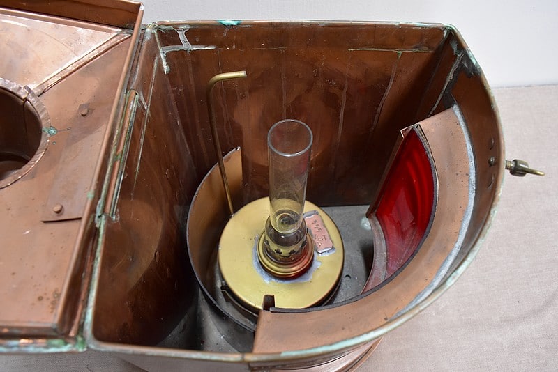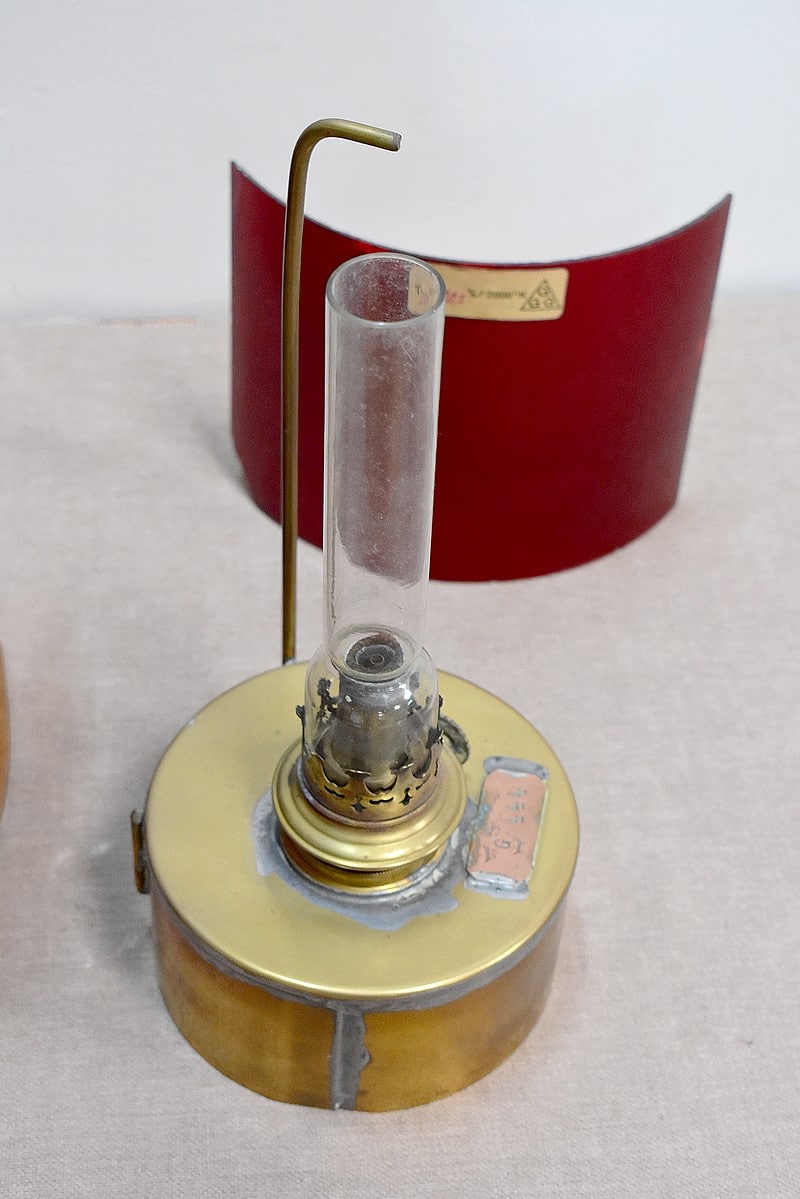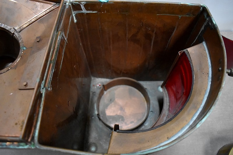 L’intérieur dispose d’une lampe à pétrole dont le socle réservoir est maintenu dans un réceptacle au fond de la lanterne. Y est également rangé un verre incurvé rouge sur l’extérieur et doré sur l’intérieur et la molette de la lampe à pétrole est signée Kosmos Brenner. Un filtre en verre rouge est encastré dans un logement prévu à cet effet derrière le verre extérieur mouluré.