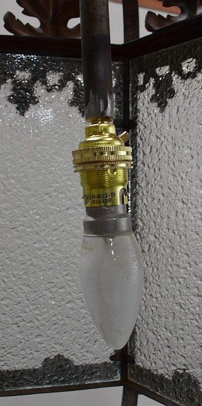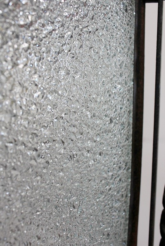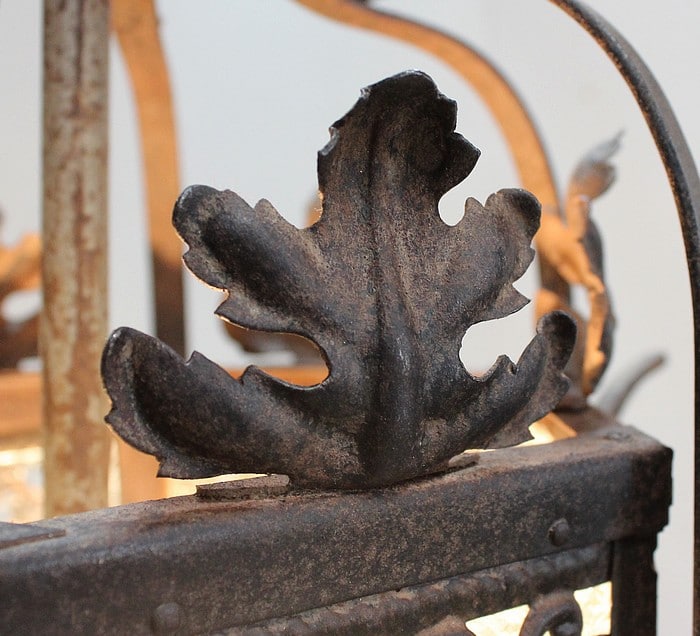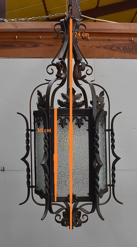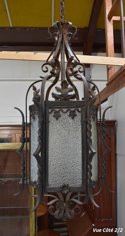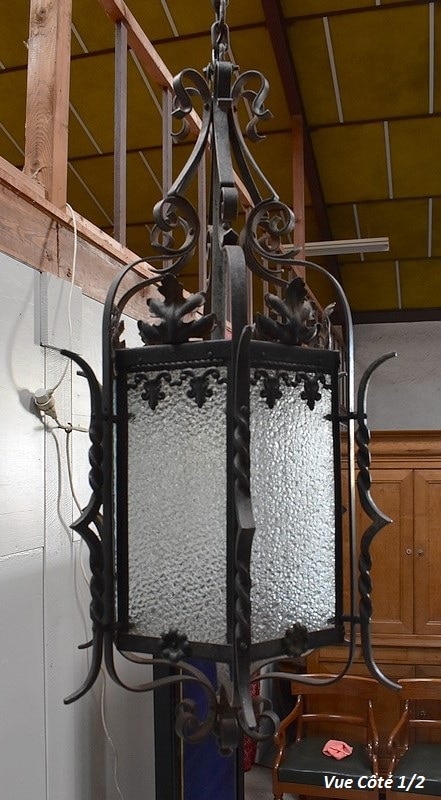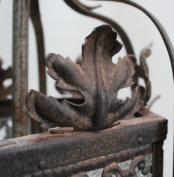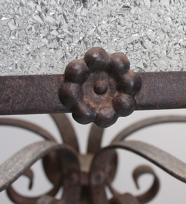 Ses six faces rectangulaires sont composées de Verres Granités à l’extérieur, lisses à l’intérieur. Elles sont enjolivées de Décors en Fer découpé, comme des frises perlées ou des fleurs, et sommées d’un feuille d’arbre.
