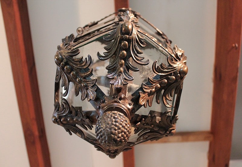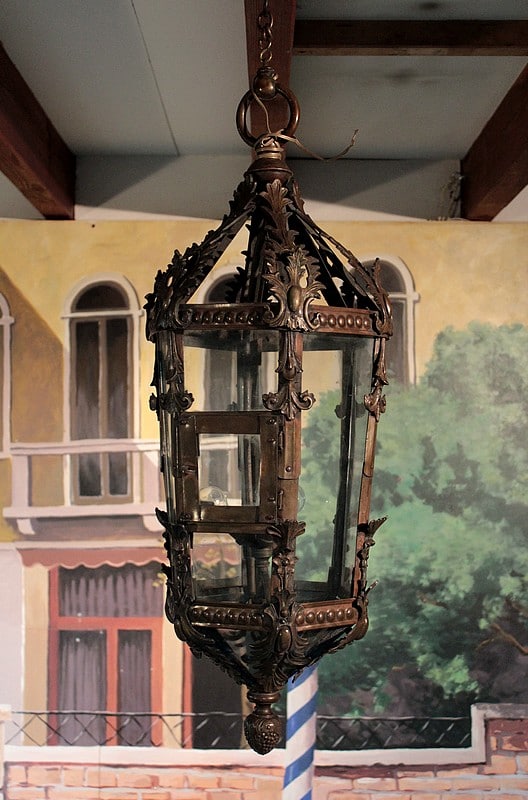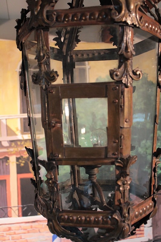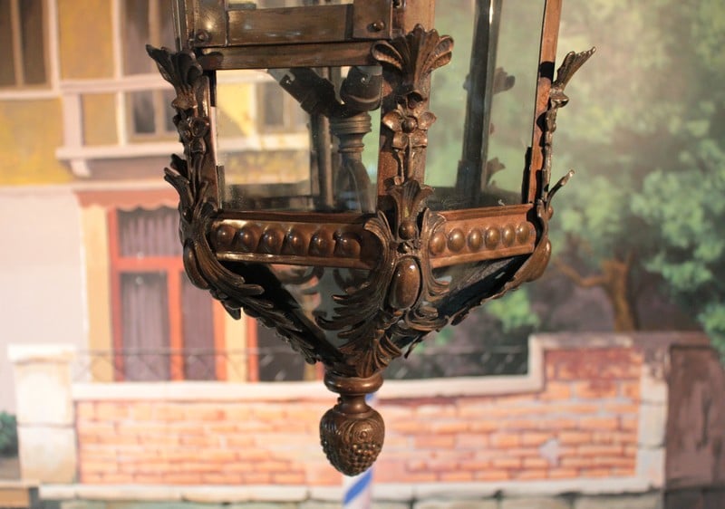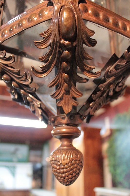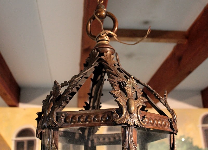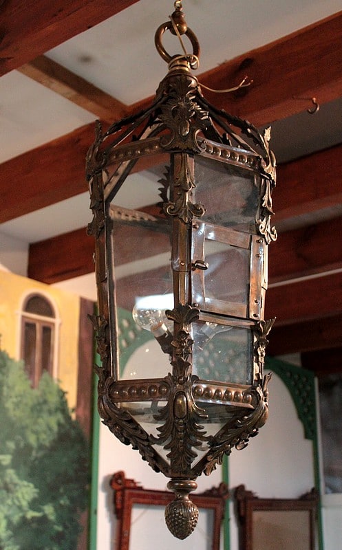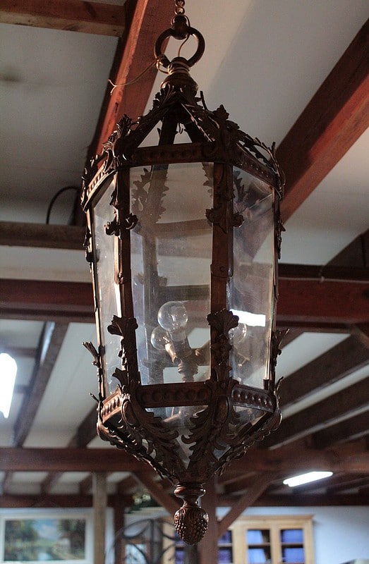 Grande lanterne dans le goût baroque, ossature laiton et ornementations en bronze, éclairant par 3 lumières.