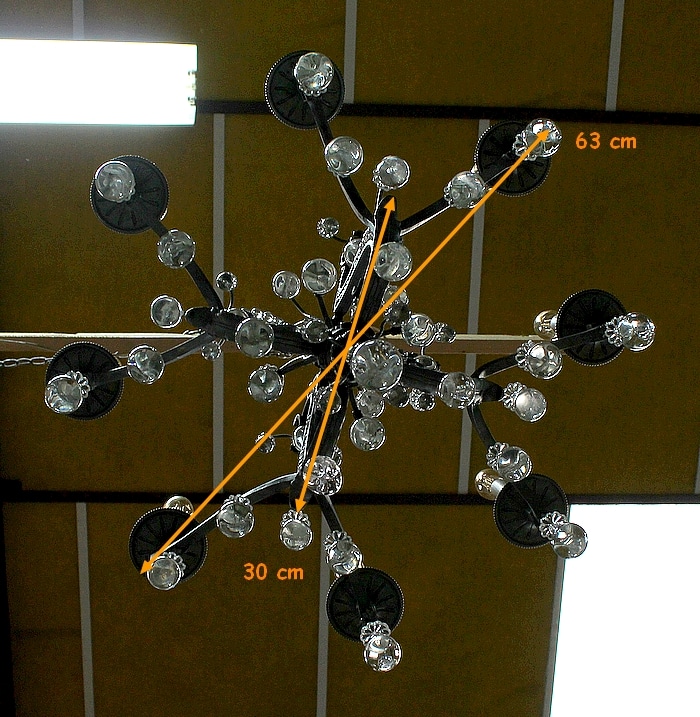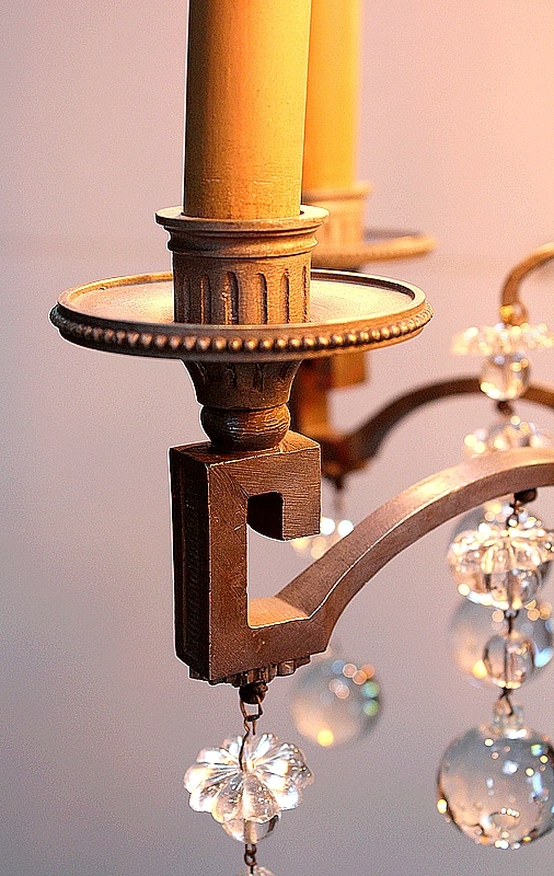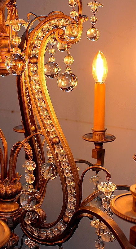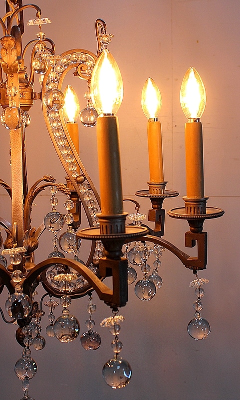 Cet Objet Décoratif éclaire par Huit bras de Lumière. Chacun d’eux accueille une grande Ampoule Bougie, elle même reposant dans une Coupelle en Bronze au pourtour Perlé.