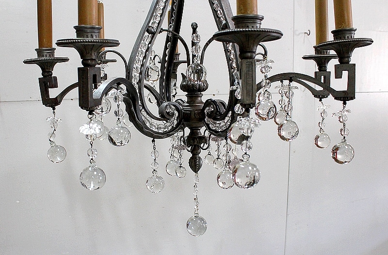 Charmant Lustre à Ossature Demi-Cage en Bronze patiné, et Cristaux en suspension.
