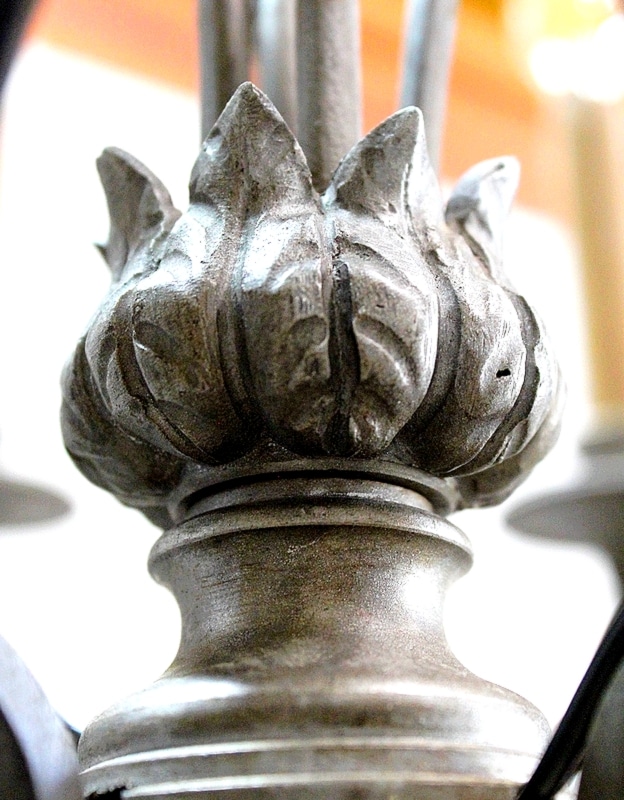 Ce Bien est doté en partie basse d’un Fût central Ouvragé, retenu par quatre Branches disposées à intervalles réguliers. Elles forment des ‘S’ aux extrémités soulignées par des Feuilles enveloppantes en Bronze découpé. Ces quatre montants sont garnis en leurs centres de Guirlandes de Perles.