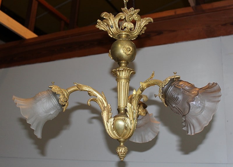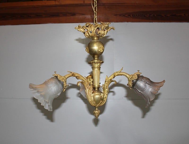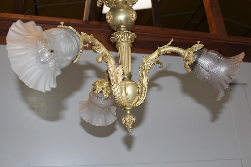 Lustre en bronze à trois bras de lumière avec tulipes d’origine en verre dépoli.