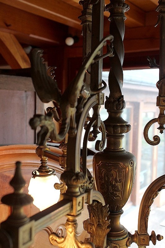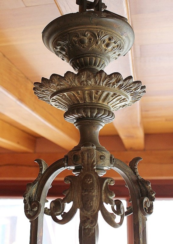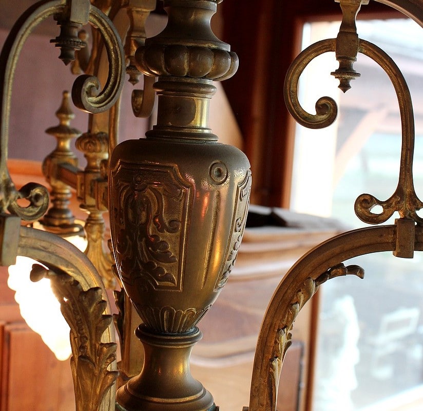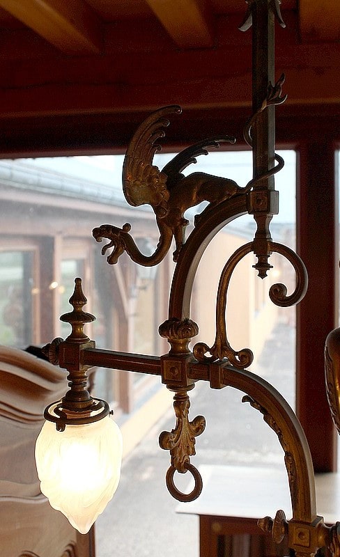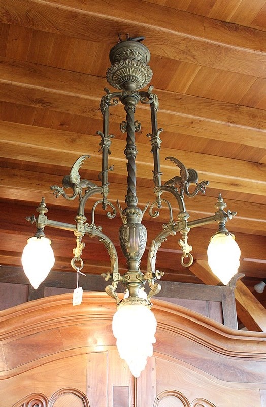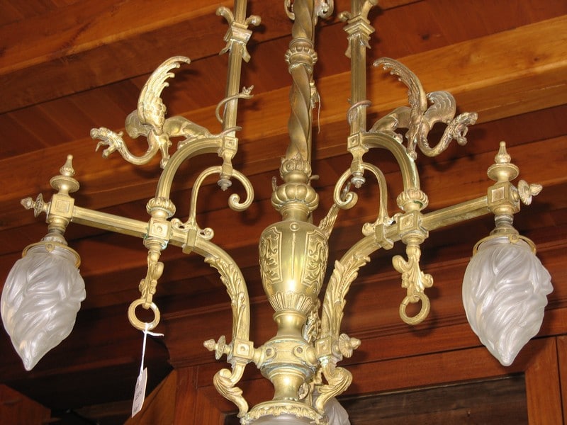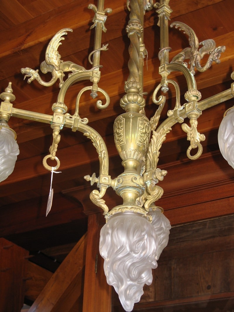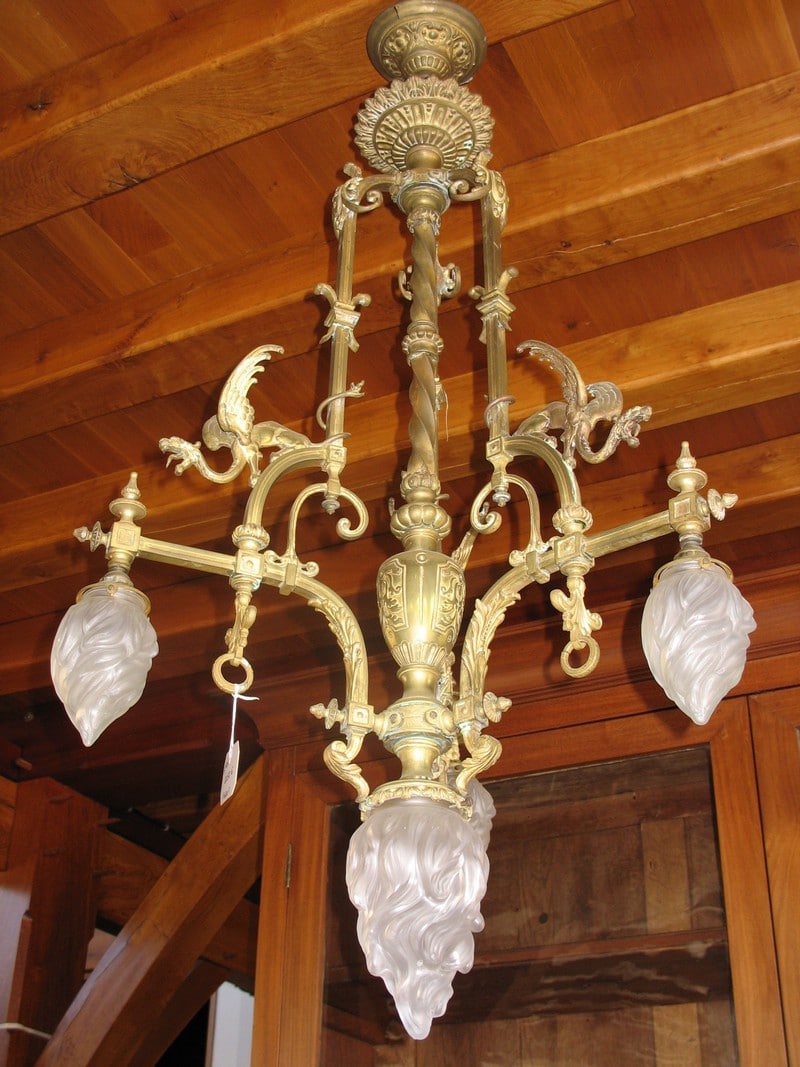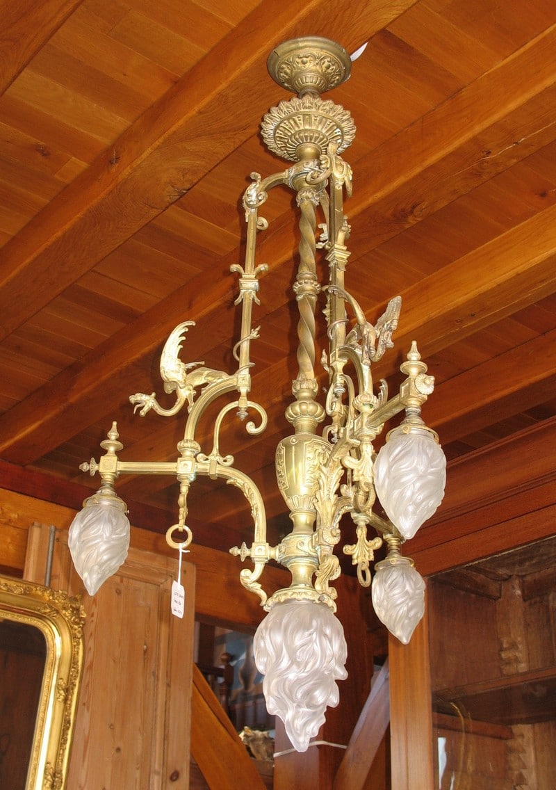 Lustre en bronze à décor de Dragons ailés éclairant par 3 flammes de 13cm de hauteur et une flamme centrale de 20 cm. Verrerie d’origine.