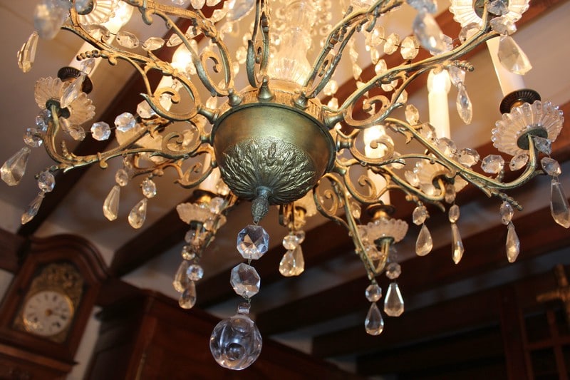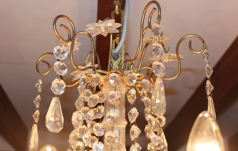 Lustre à pampilles de cristal et ossature en bronze. Éclairage par 12 bougies de porcelaine.