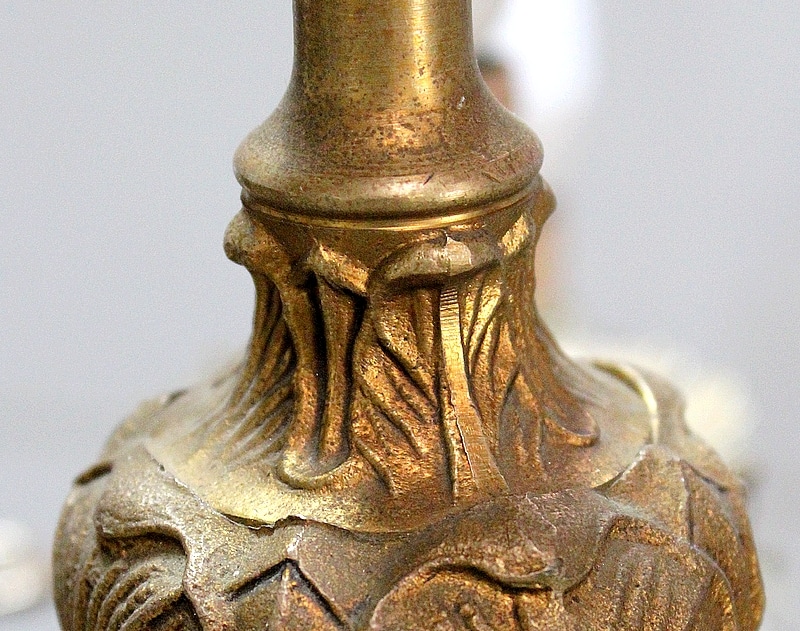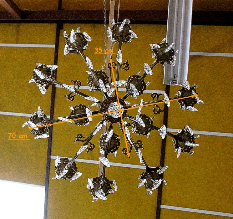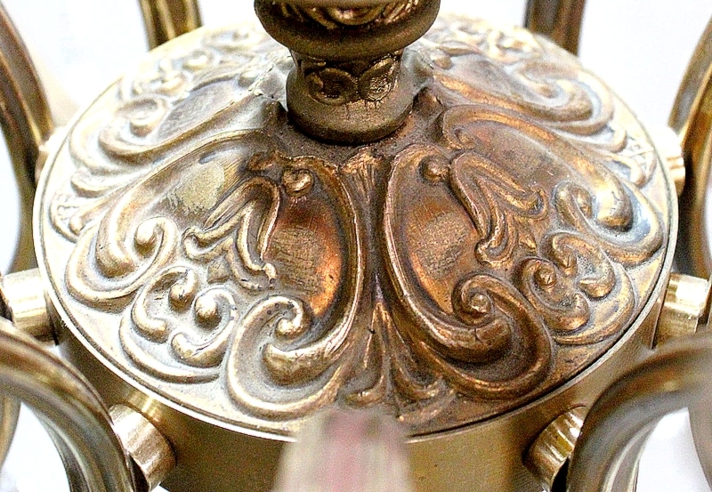 Cet Objet Décoratif éclaire par un total de quinze Ampoules Bougies, reposant dans des Coupelles en Bronze Ajouré. Elles sont réparties de la manière suivante : cinq en parties hautes des Branches, en alternance avec des Décors en Volutes, et une à chacune des dix extrémités basses.