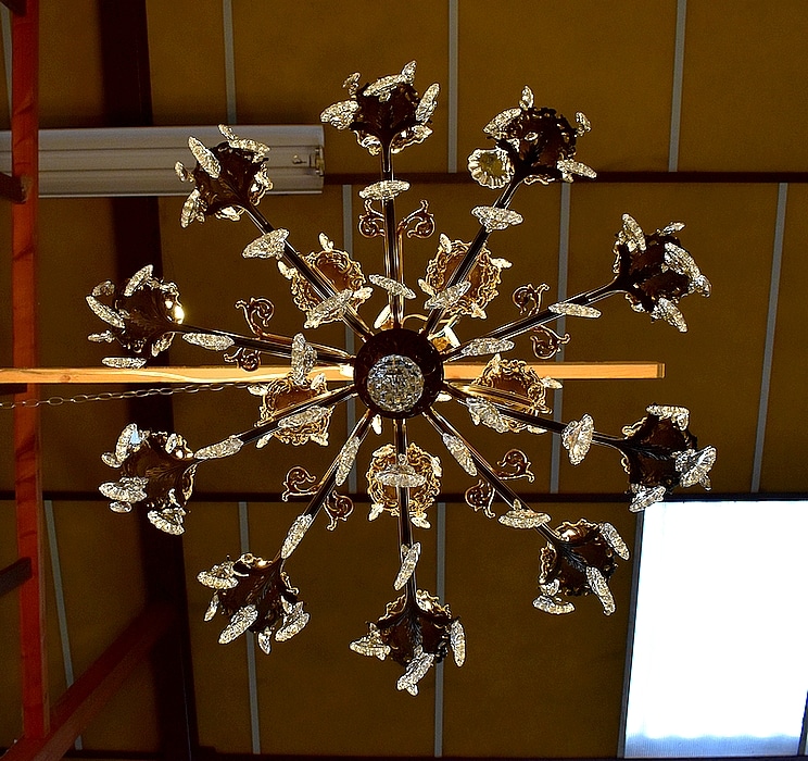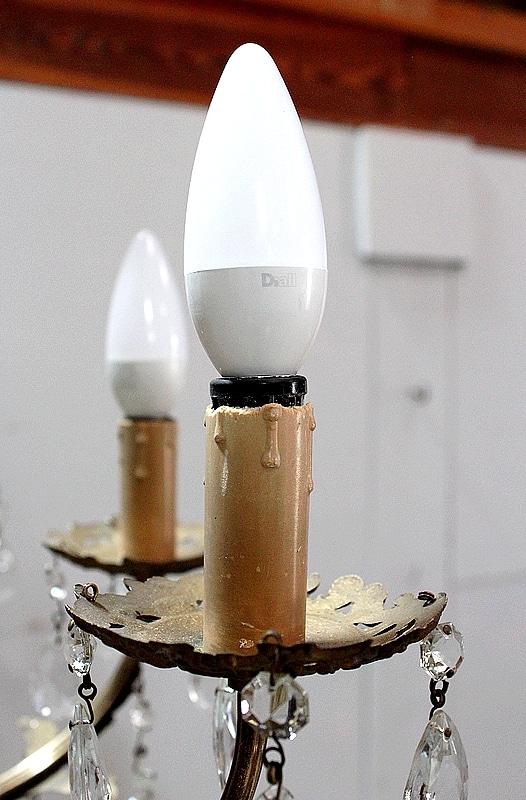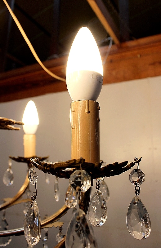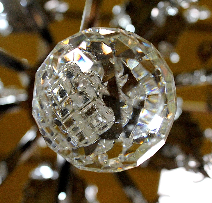 Ce Luminaire est agrémenté de nombreuses Pampilles en suspension, taillées en Plaquettes, en Poires, ou encore en Boules à facettes.
