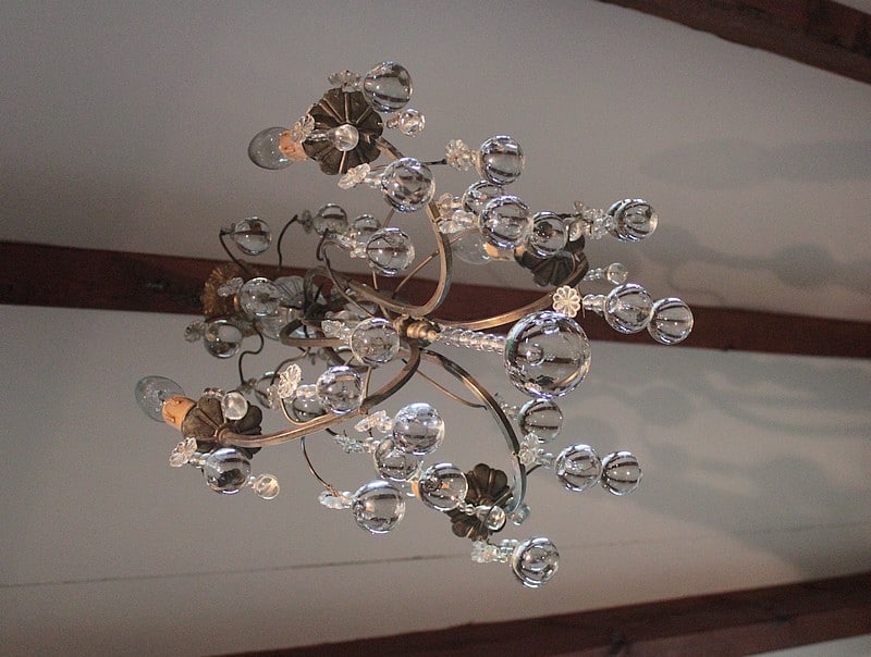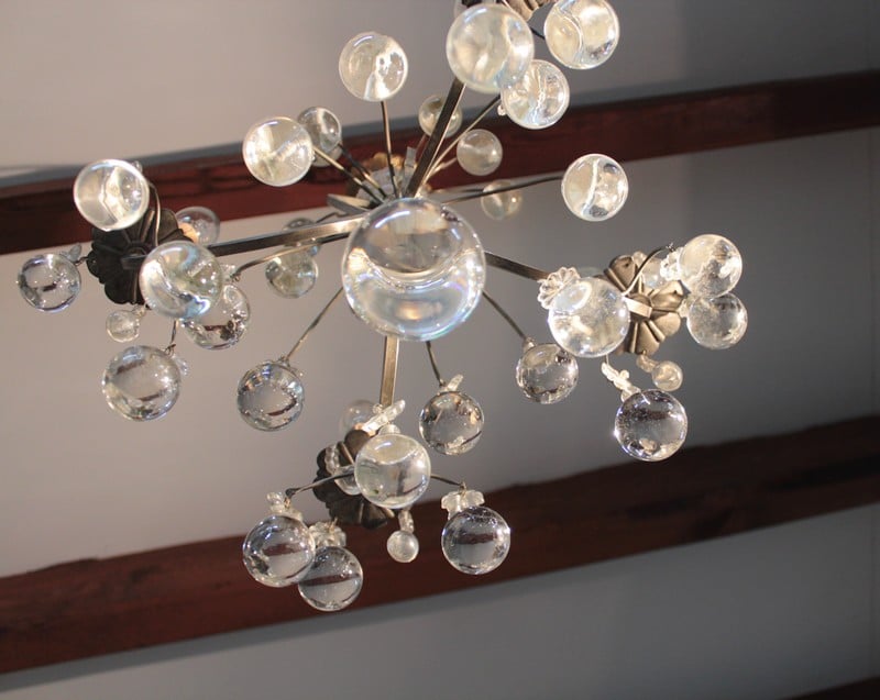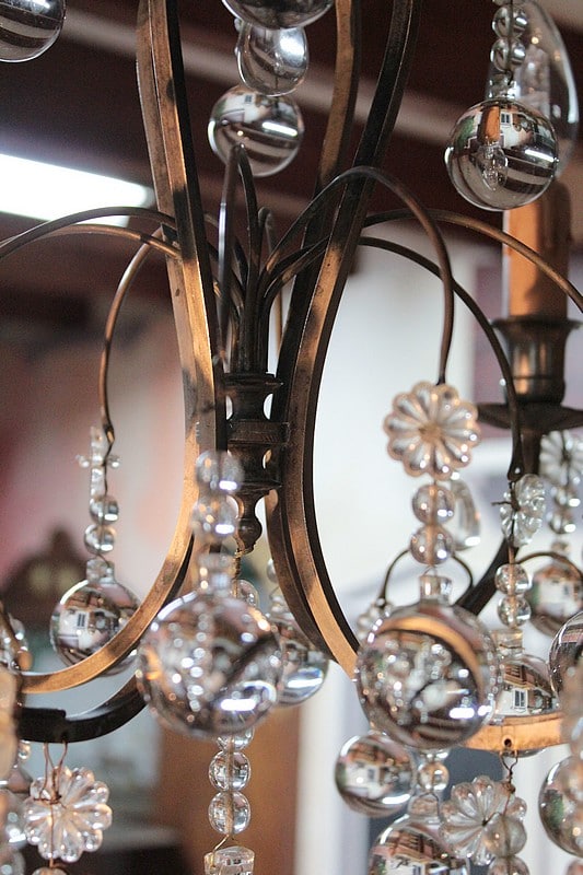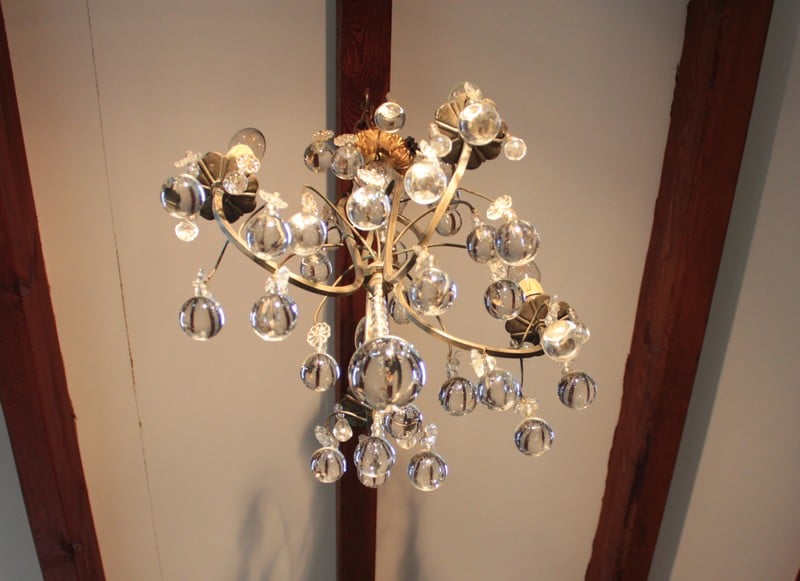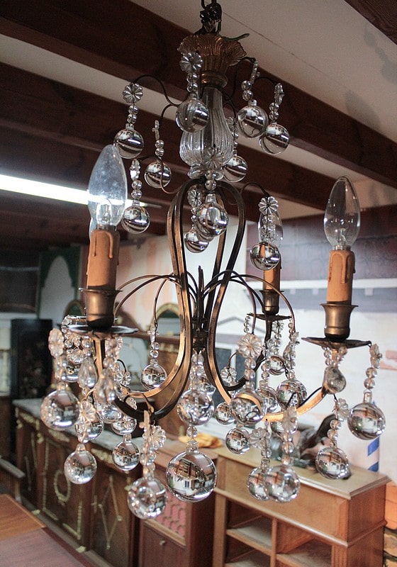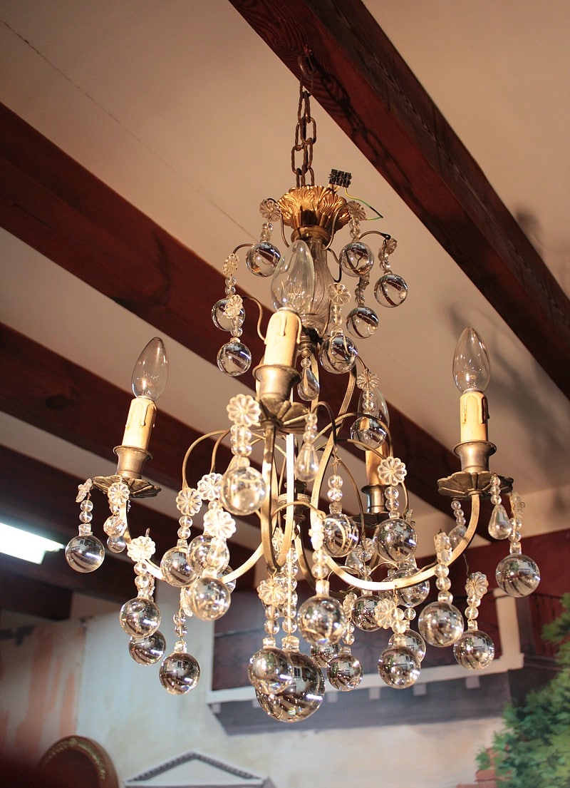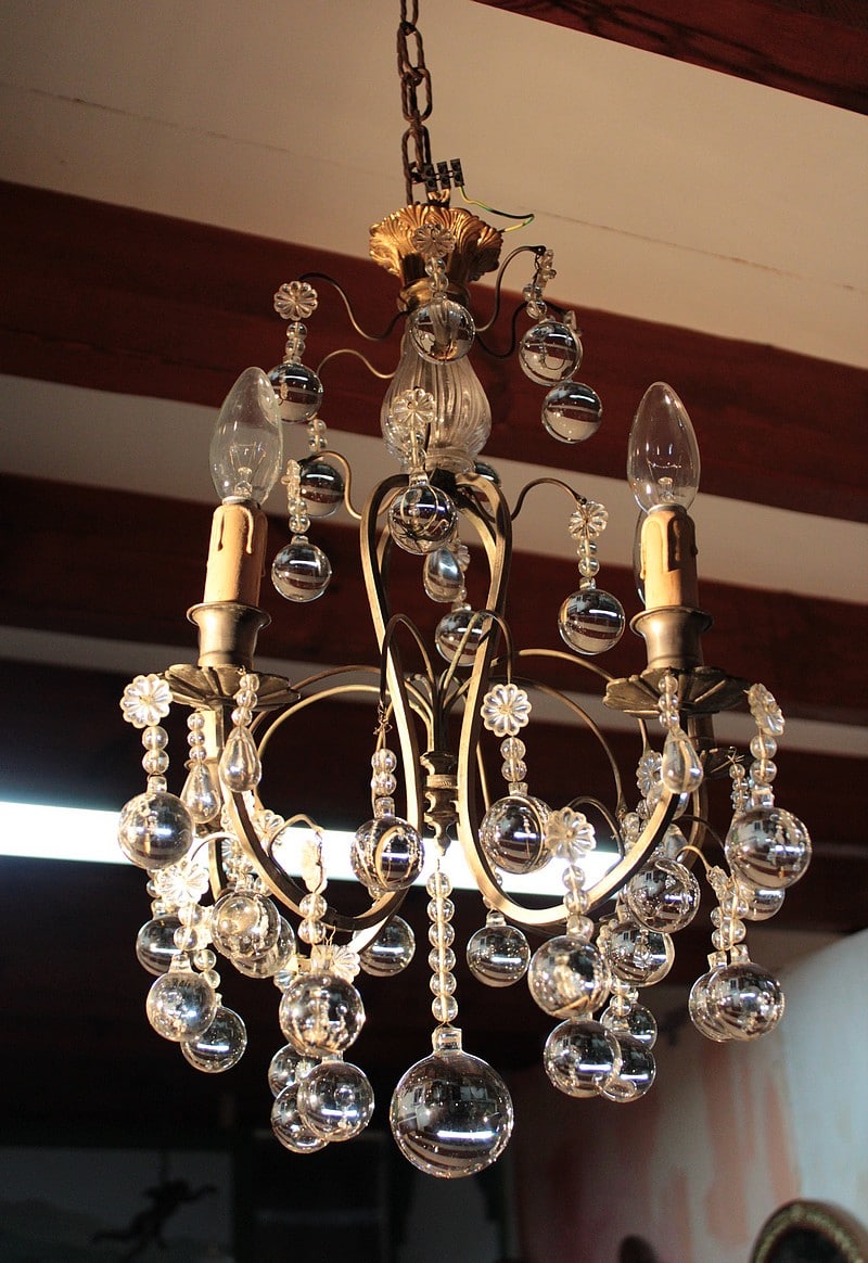 Lustre en laiton à 4 bras de lumières, orné de pampilles et de boules de cristal. Fin XIXe.