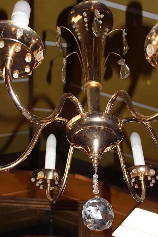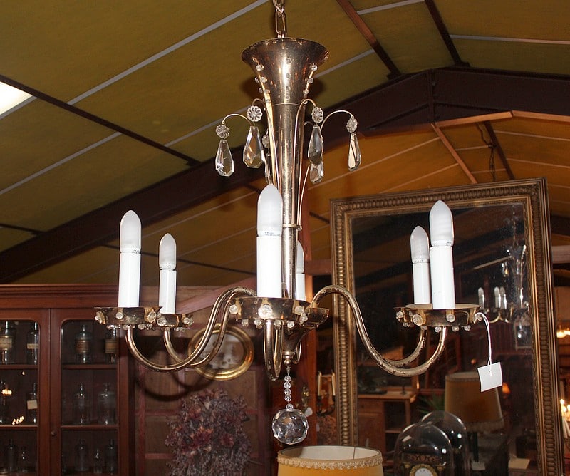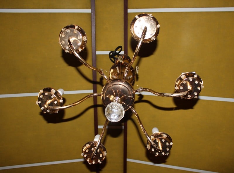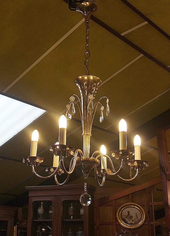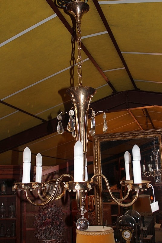 Lustre en métal doré orné de pampilles et d’une boule en cristal, éclairant par 6 bras de lumière.