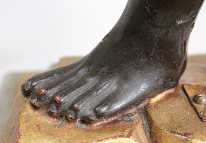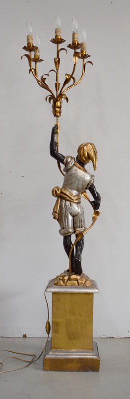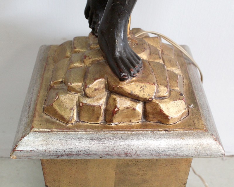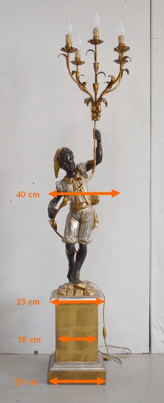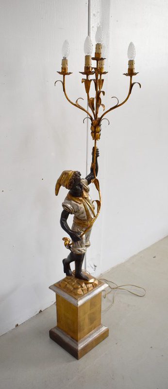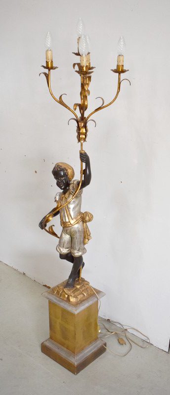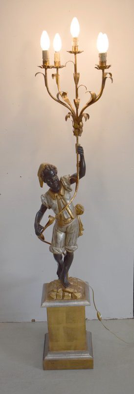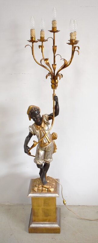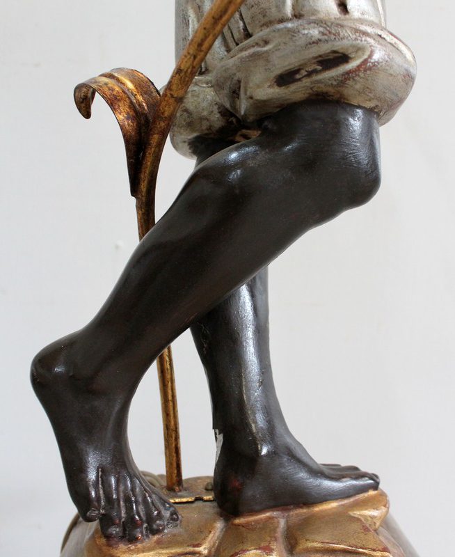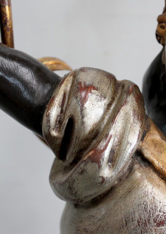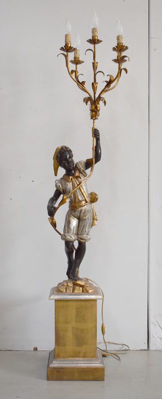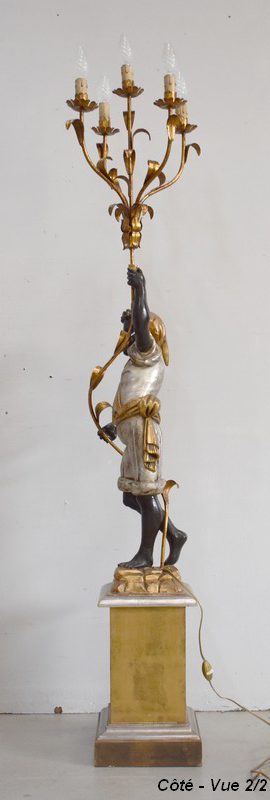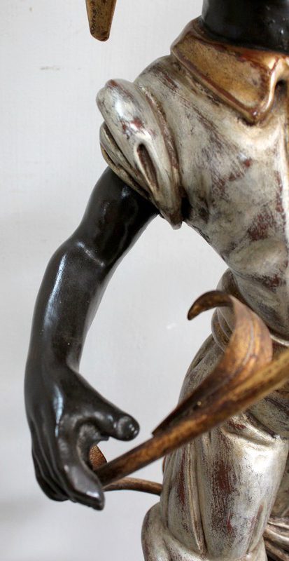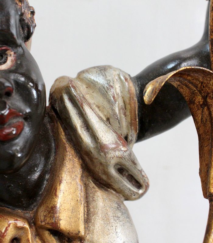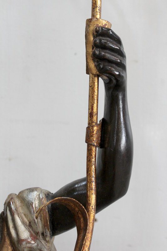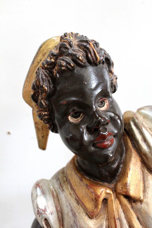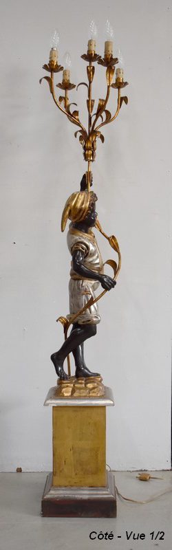 Statue Porte-Torchère représentant un Nubien en Bois Sculpté Polychrome sur son socle, dans le goût Vénitien.