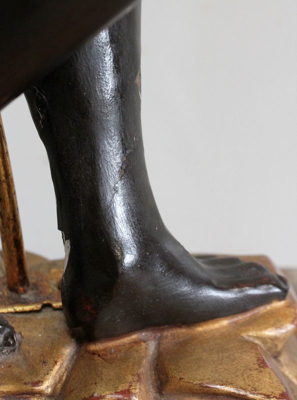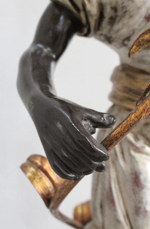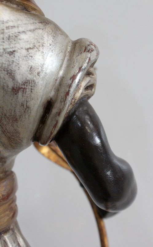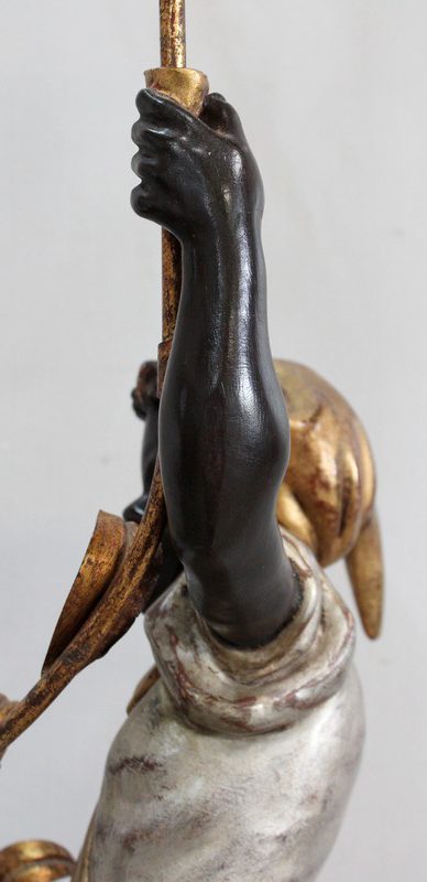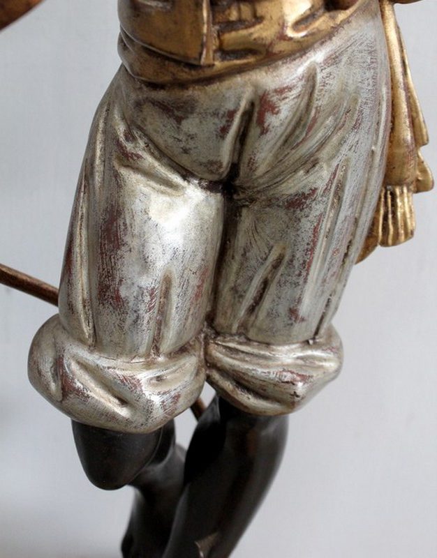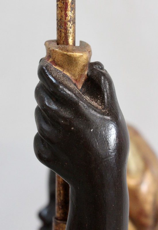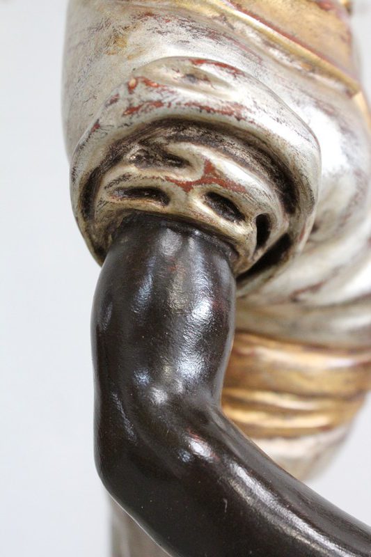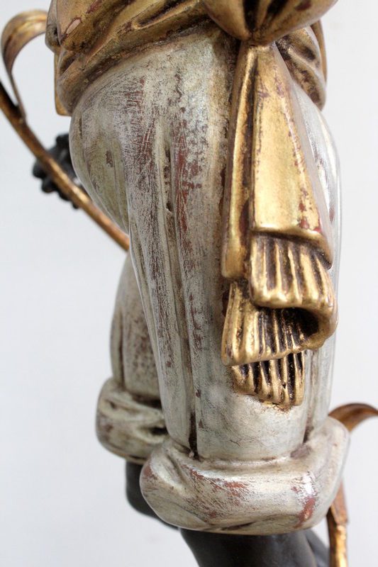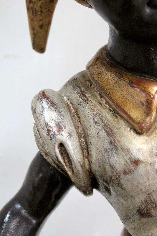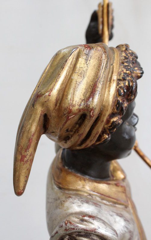 Le Personnage porte les caractéristiques physiques dénotant de son origine africaine, de par sa carnation noire, ses cheveux crépus et ses lèvres charnues. Son Costume au style mauresque, de la coiffe jusqu’au turban ceinturant sa taille, est Finement exécuté.