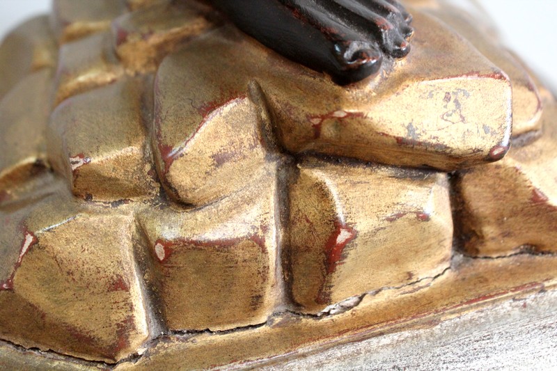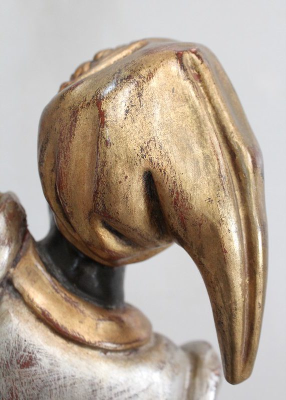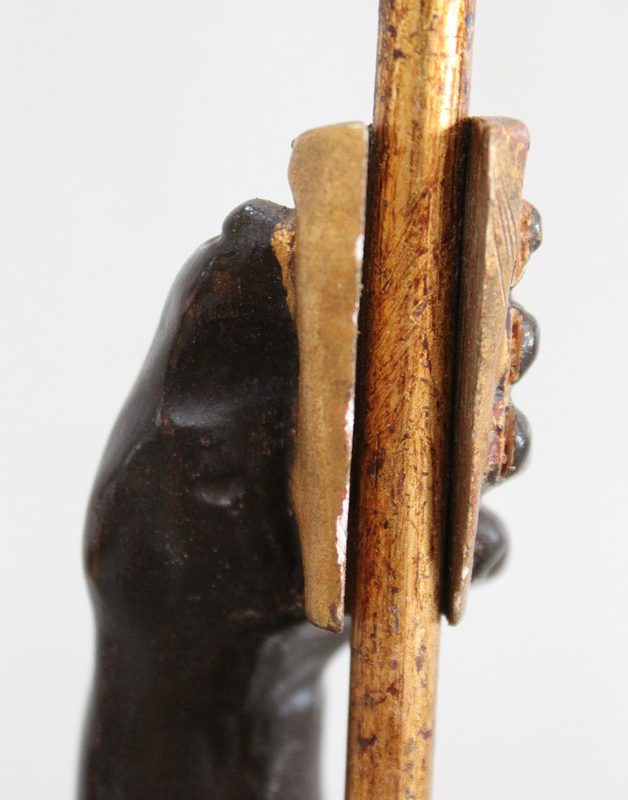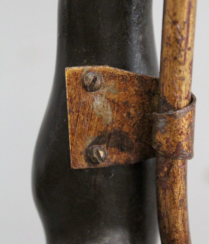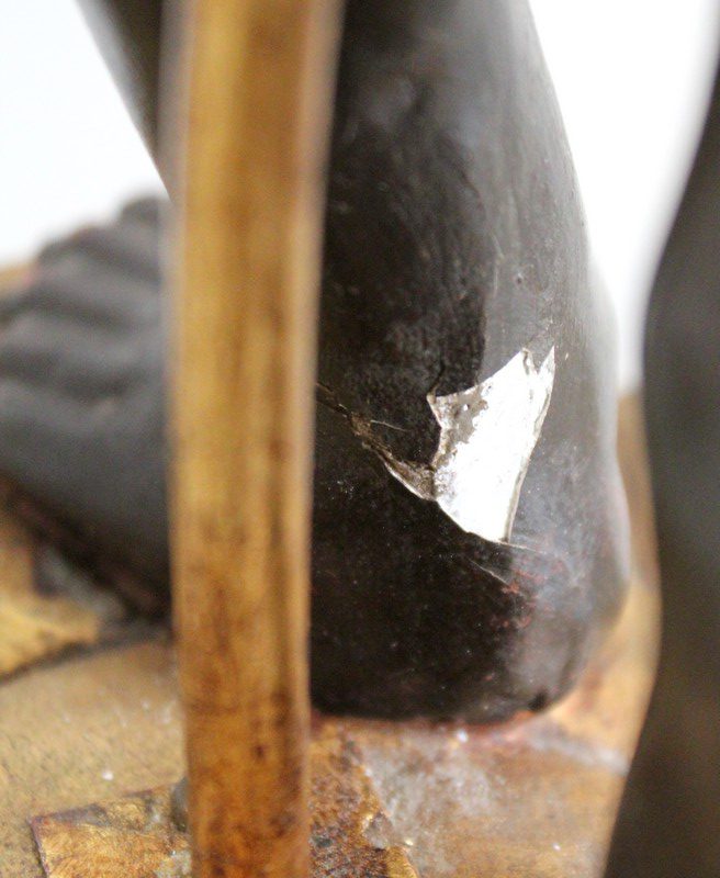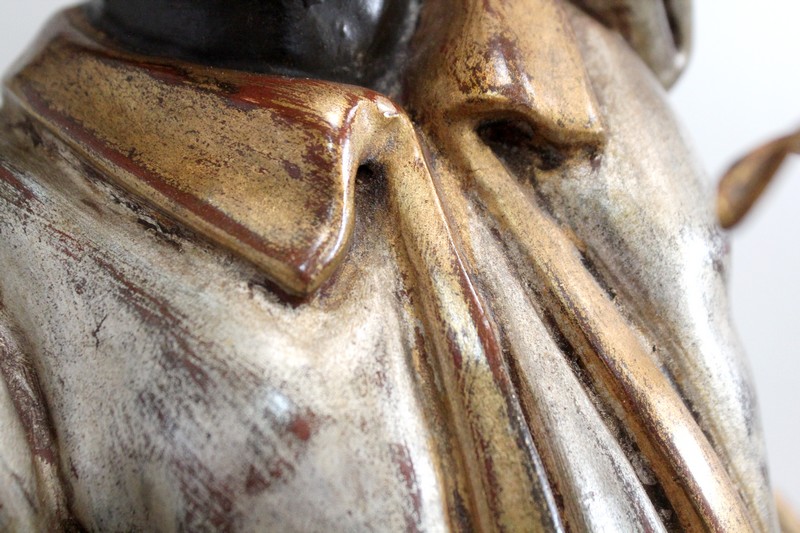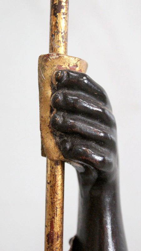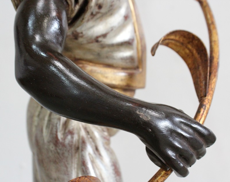 Le Personnage porte les caractéristiques physiques dénotant de son origine africaine, de par sa carnation noire, ses cheveux crépus et ses lèvres charnues. Son Costume au style mauresque, de la coiffe jusqu’au turban ceinturant sa taille, est Finement exécuté.