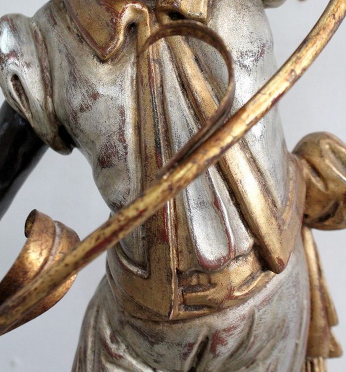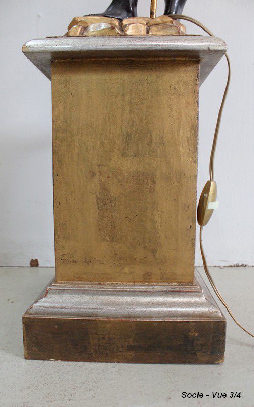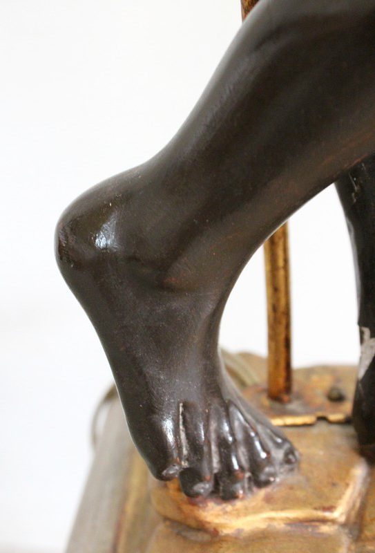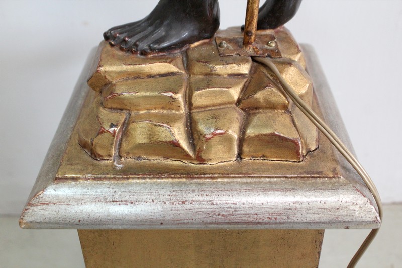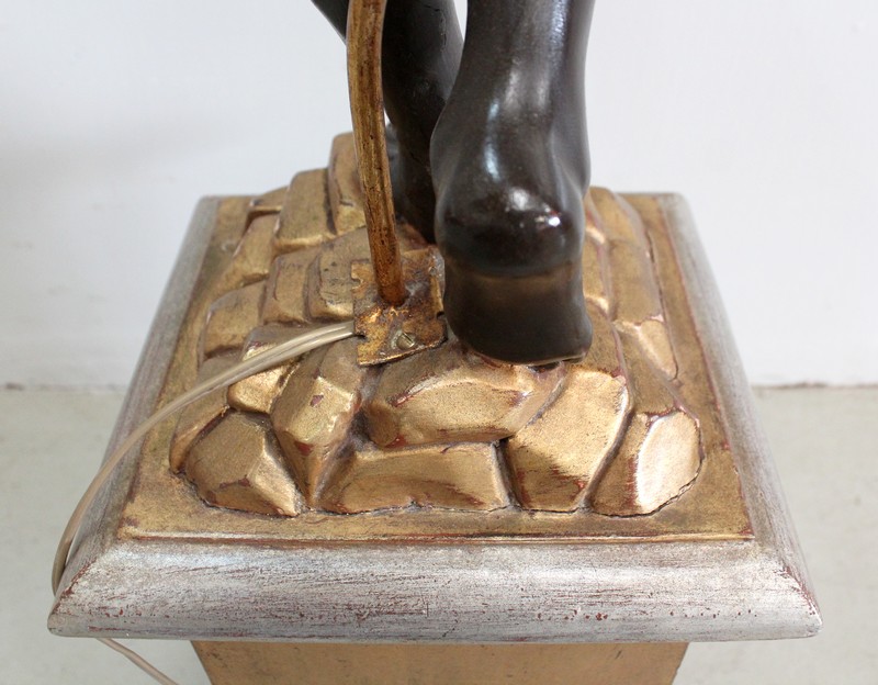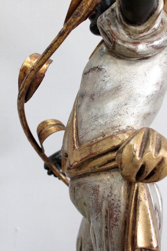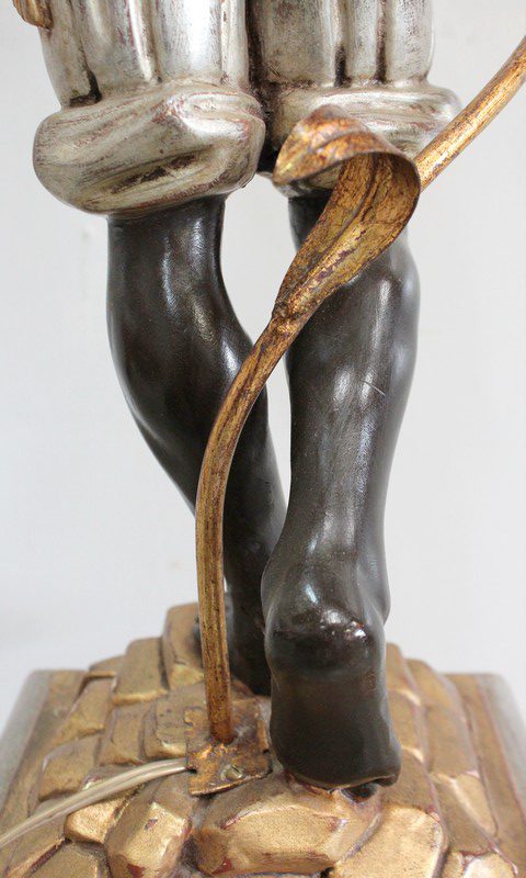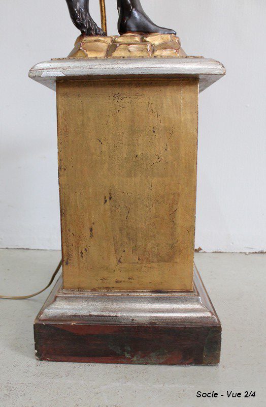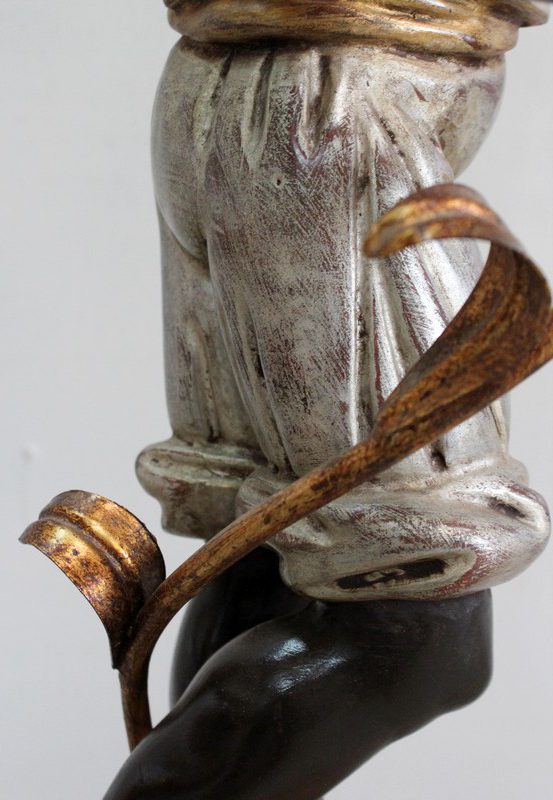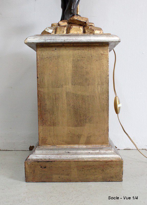 Debout sur un rocher, la jambe droite légèrement en appui vers l’arrière, le Sujet tient une liane en Métal Doré se terminant par un Candélabre à cinq branches de Lumière, en état de fonctionnement.