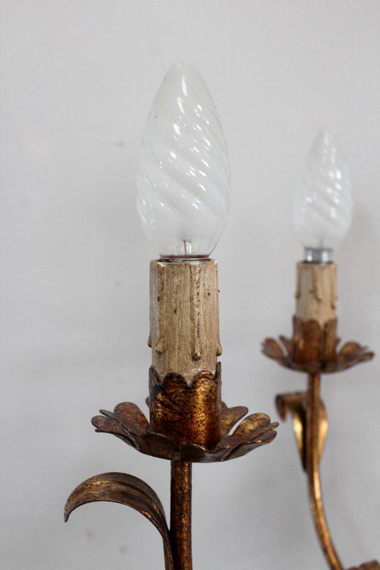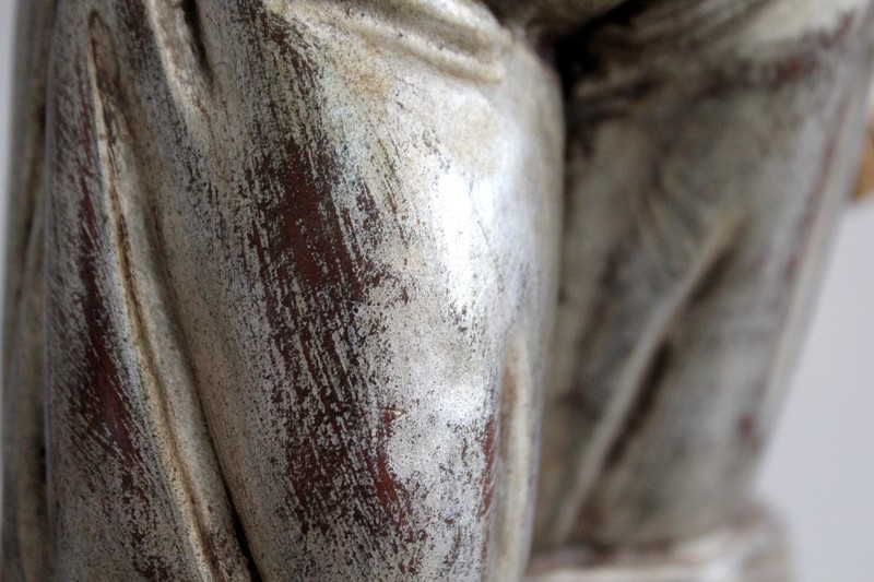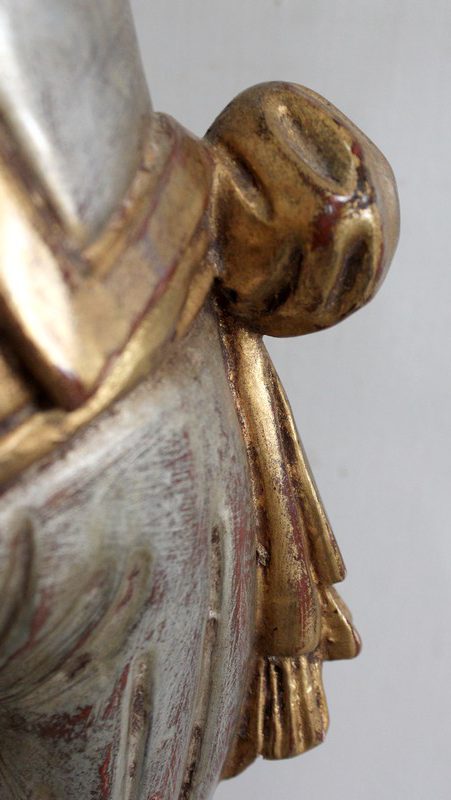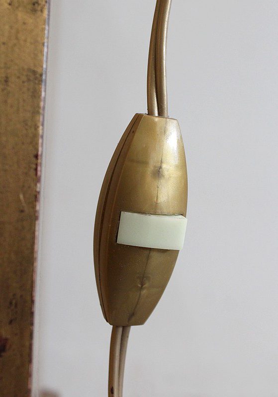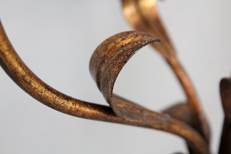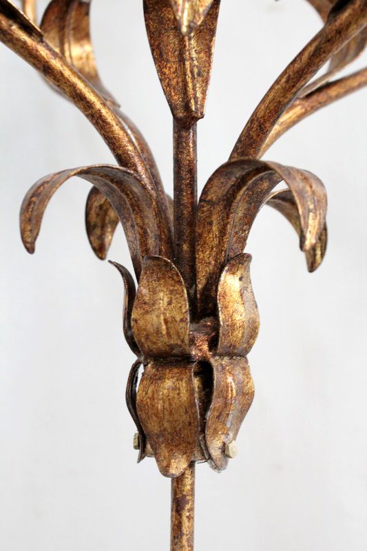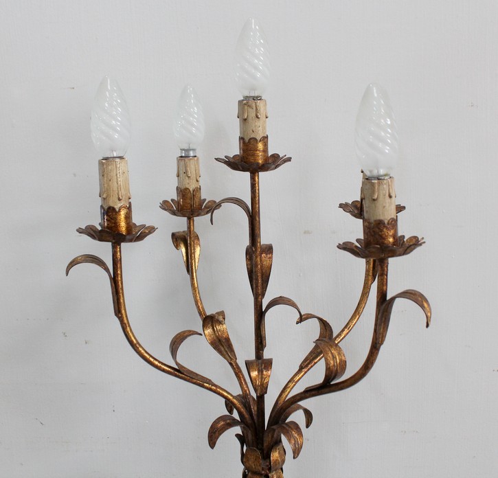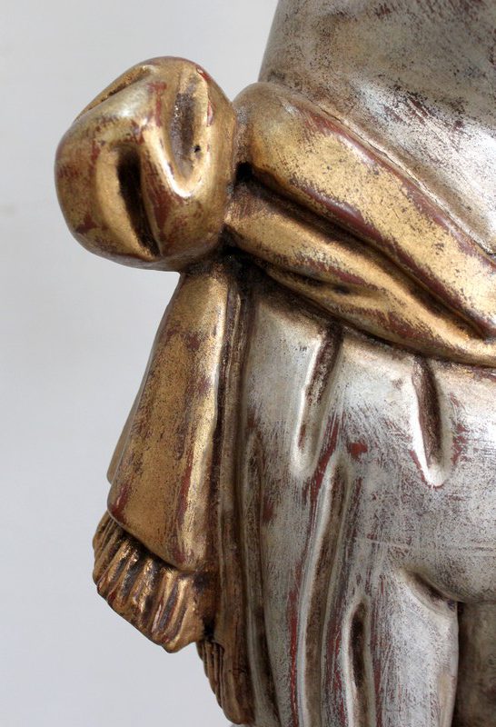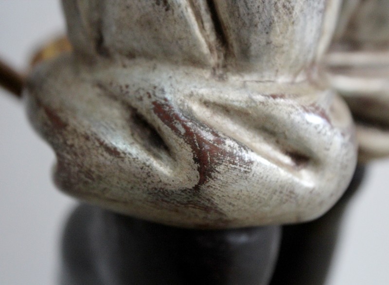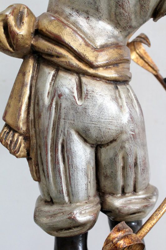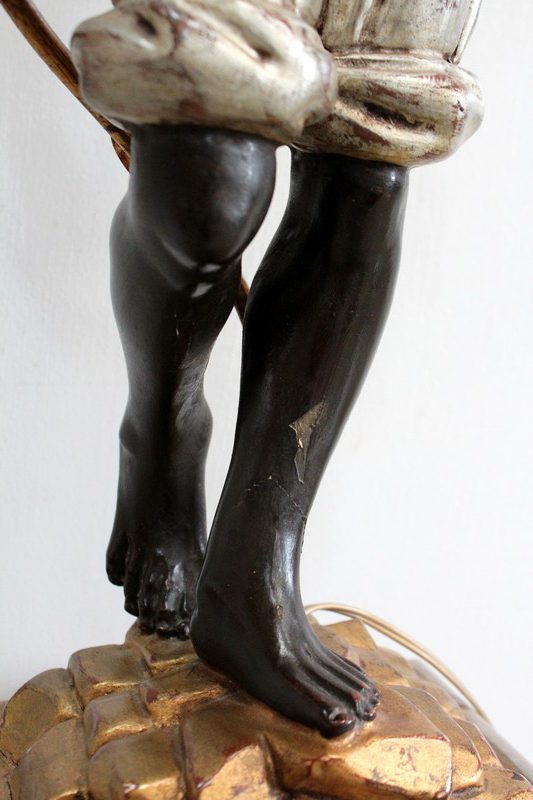 Debout sur un rocher, la jambe droite légèrement en appui vers l’arrière, le Sujet tient une liane en Métal Doré se terminant par un Candélabre à cinq branches de Lumière, en état de fonctionnement.