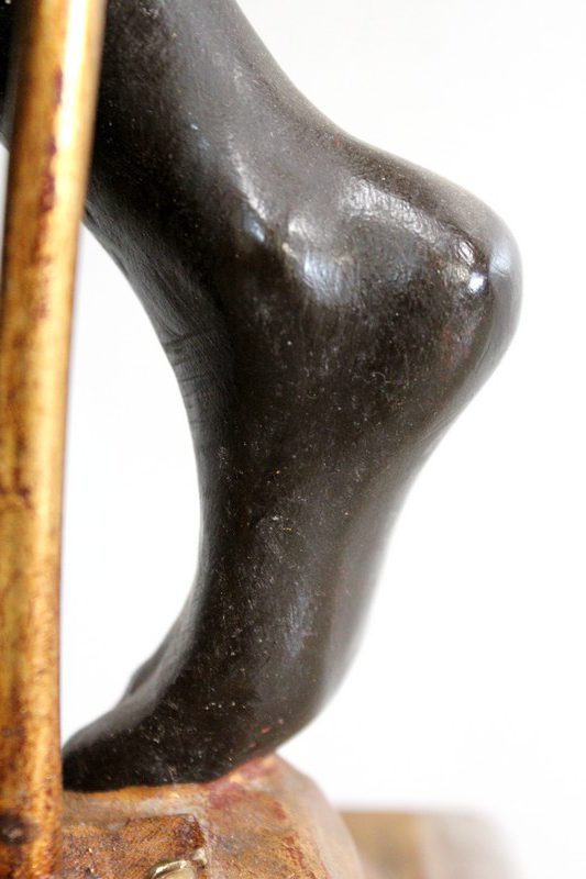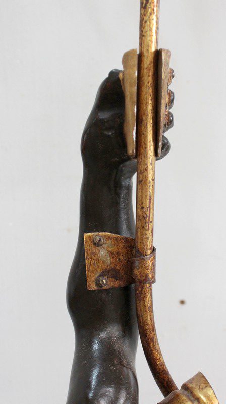 Vous apprécierez le contraste de la couleur Noire avec l’éclat du Doré et de l’Argenté aux reflets rougeâtres. Icône de l’époque coloniale, ce Nubien Porte-Torchère apportera une touche Exotique à votre intérieur, tout en remplissant sa fonction de Luminaire si besoin.