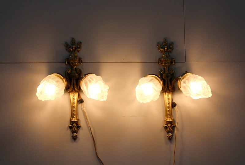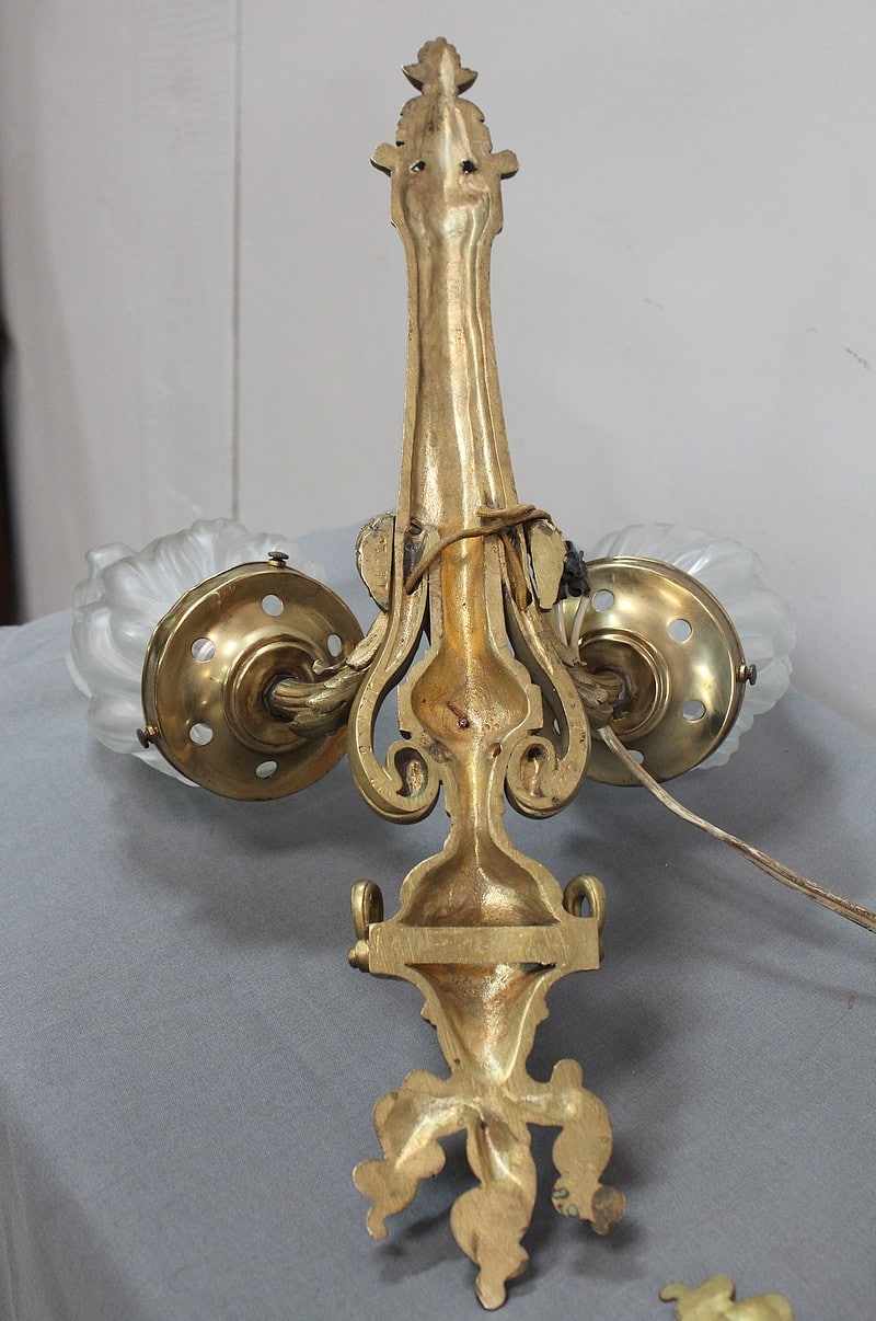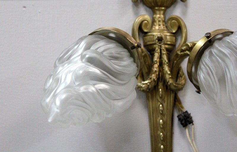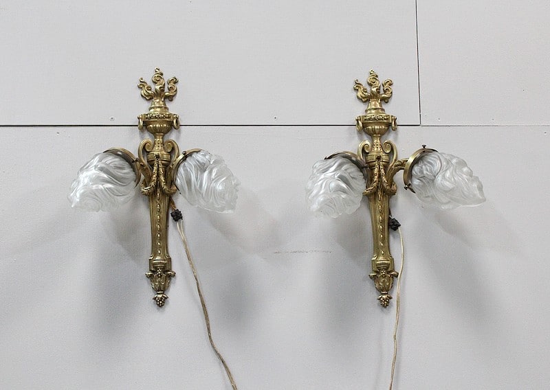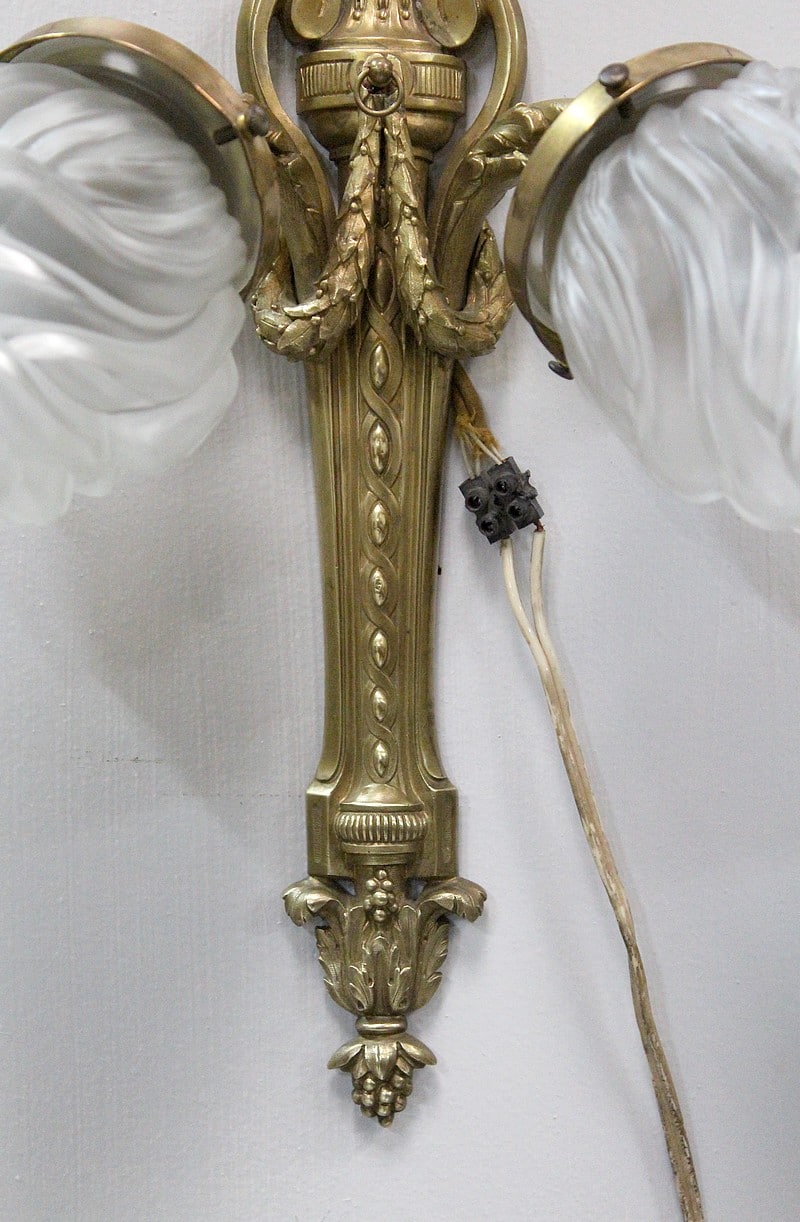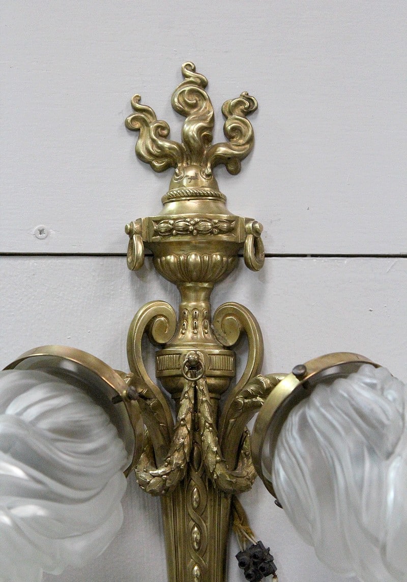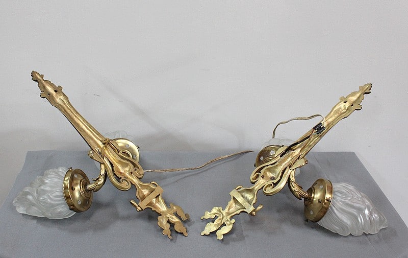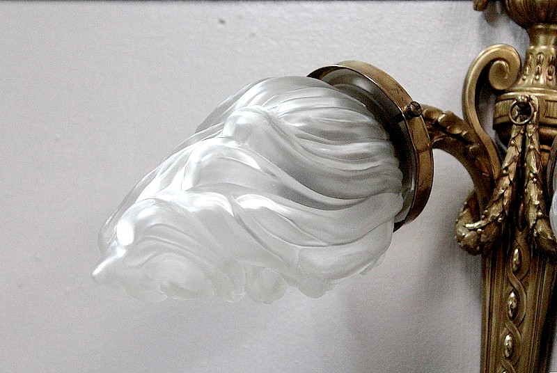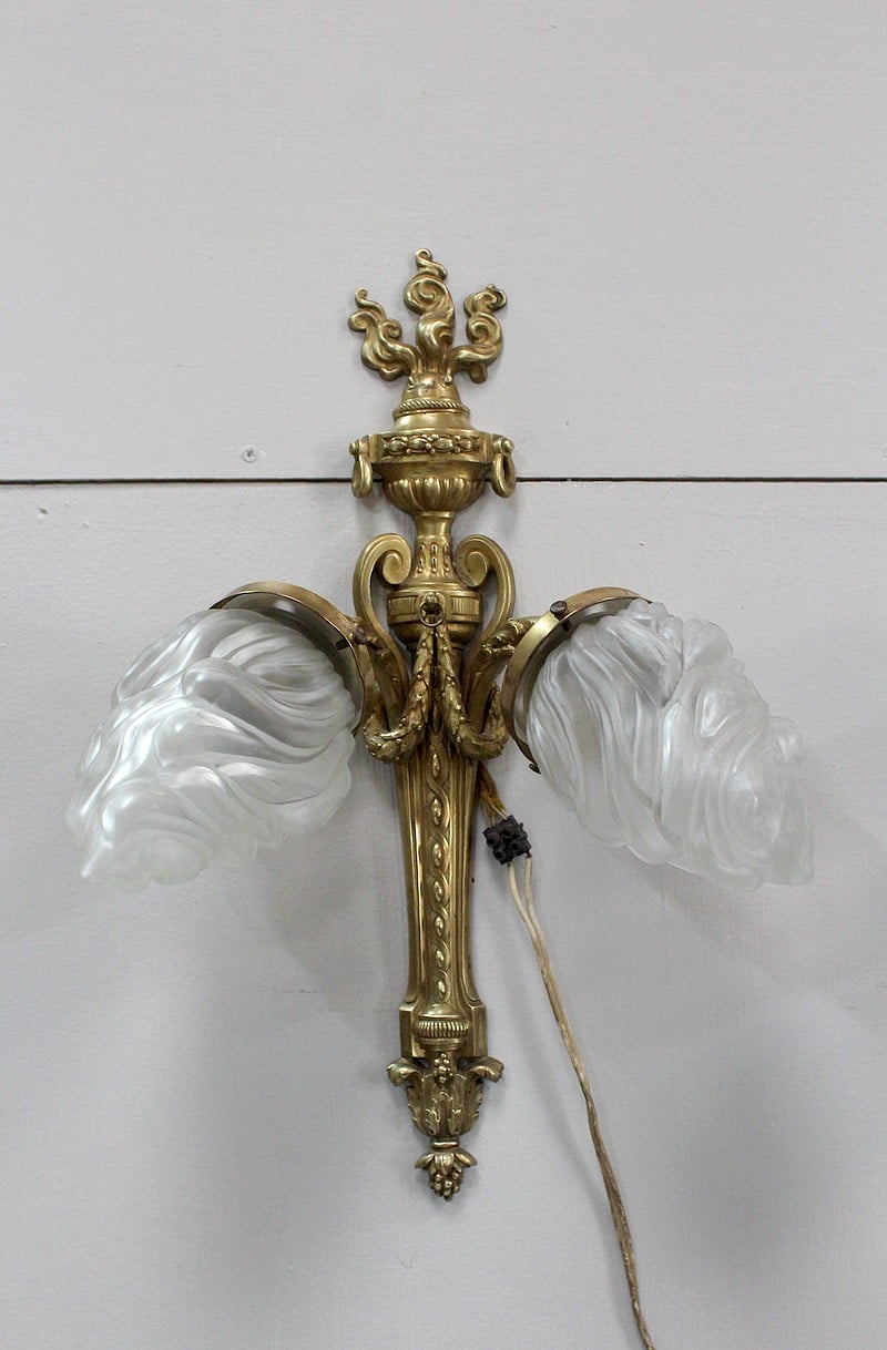 Paire d’appliques en Bronze doré et ciselé, dans le goût Louis XVI à 2 bras de lumières avec verrerie flammes électrifiées.