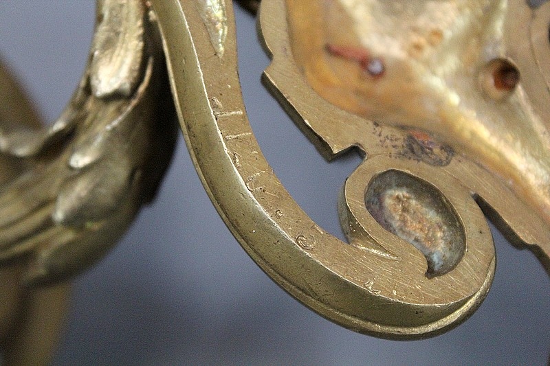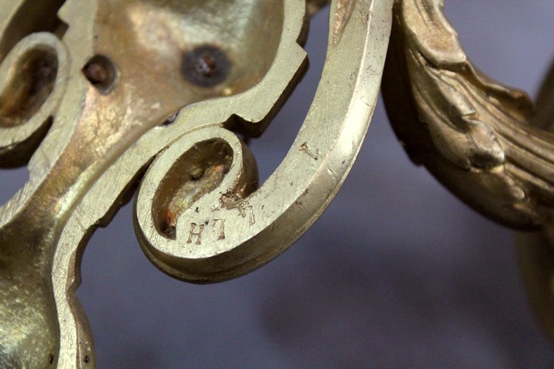Le support en bronze est à décors de pot à feu, de guirlandes de lauriers, de feuilles d’Acanthes ainsi que de grappes.